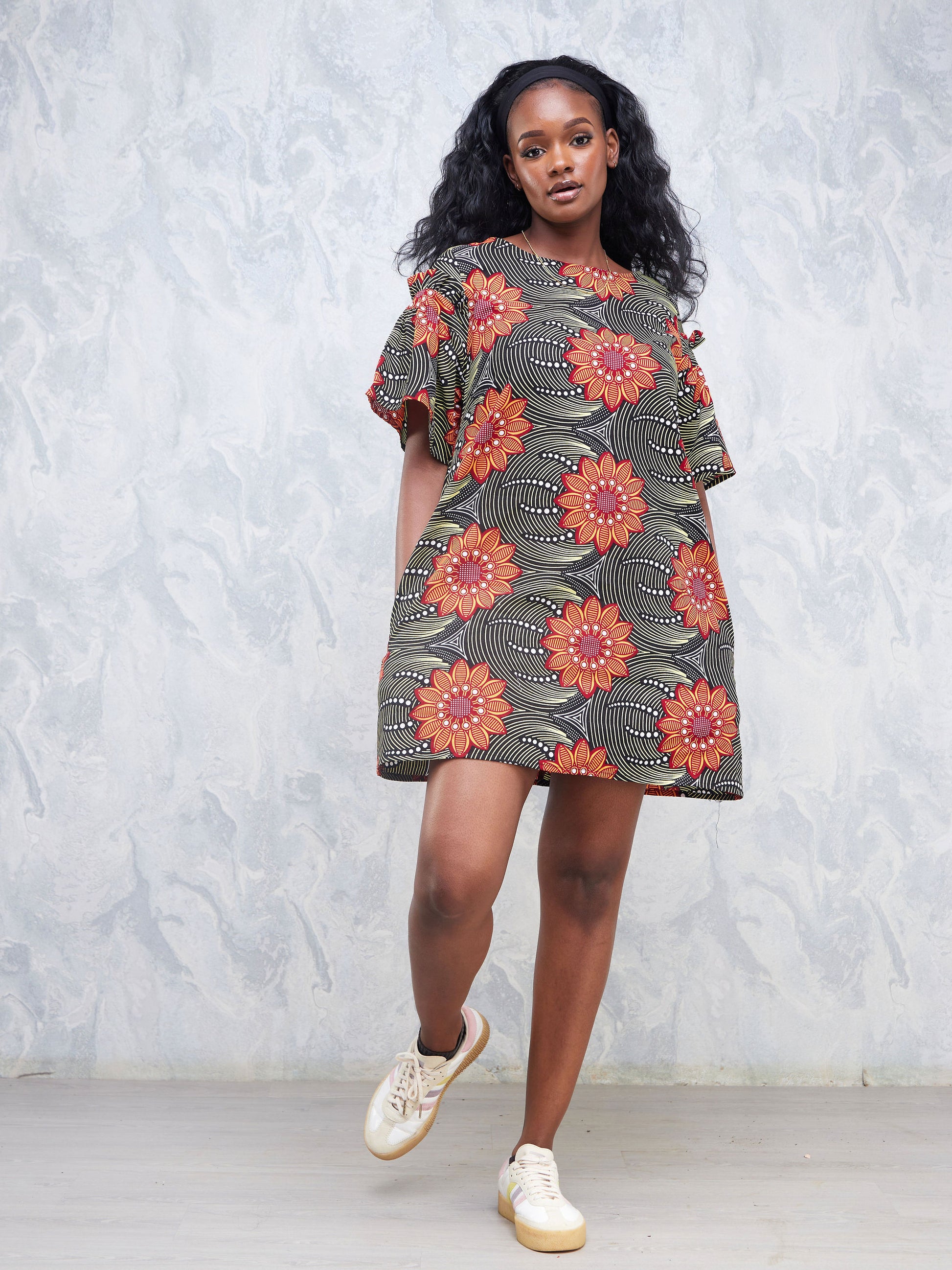 Nimali Ruffle Sleeve Short Dress - Black / Orange Ankara Print