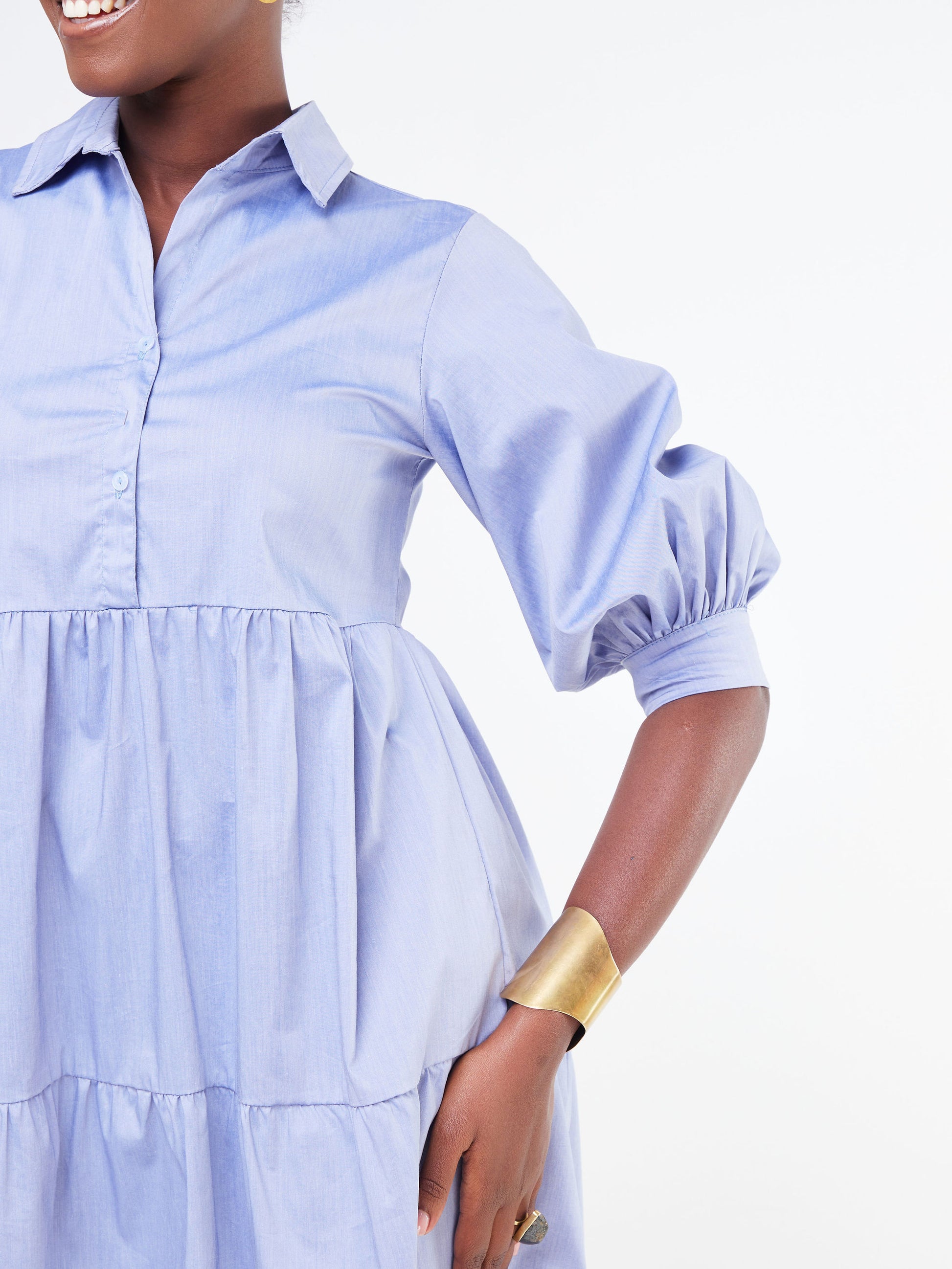 Safari Tawi Shirt Collar Bishop Sleeve Tiered Dress - Light Blue