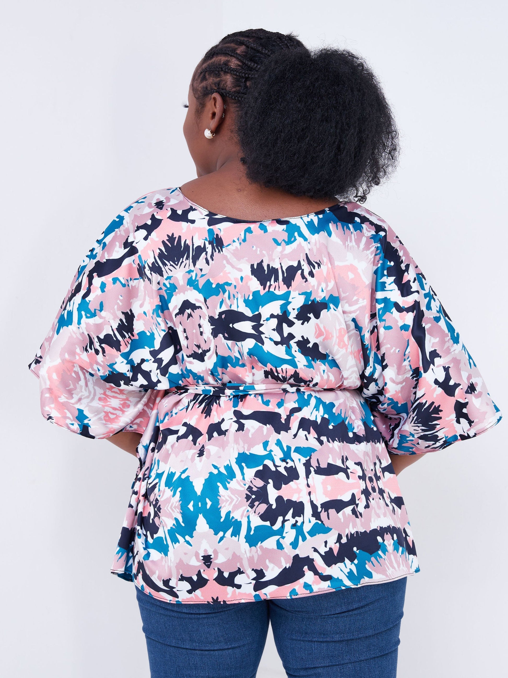 Safari Watamu Satin Top - Pink / Navy Blue Abstract Print