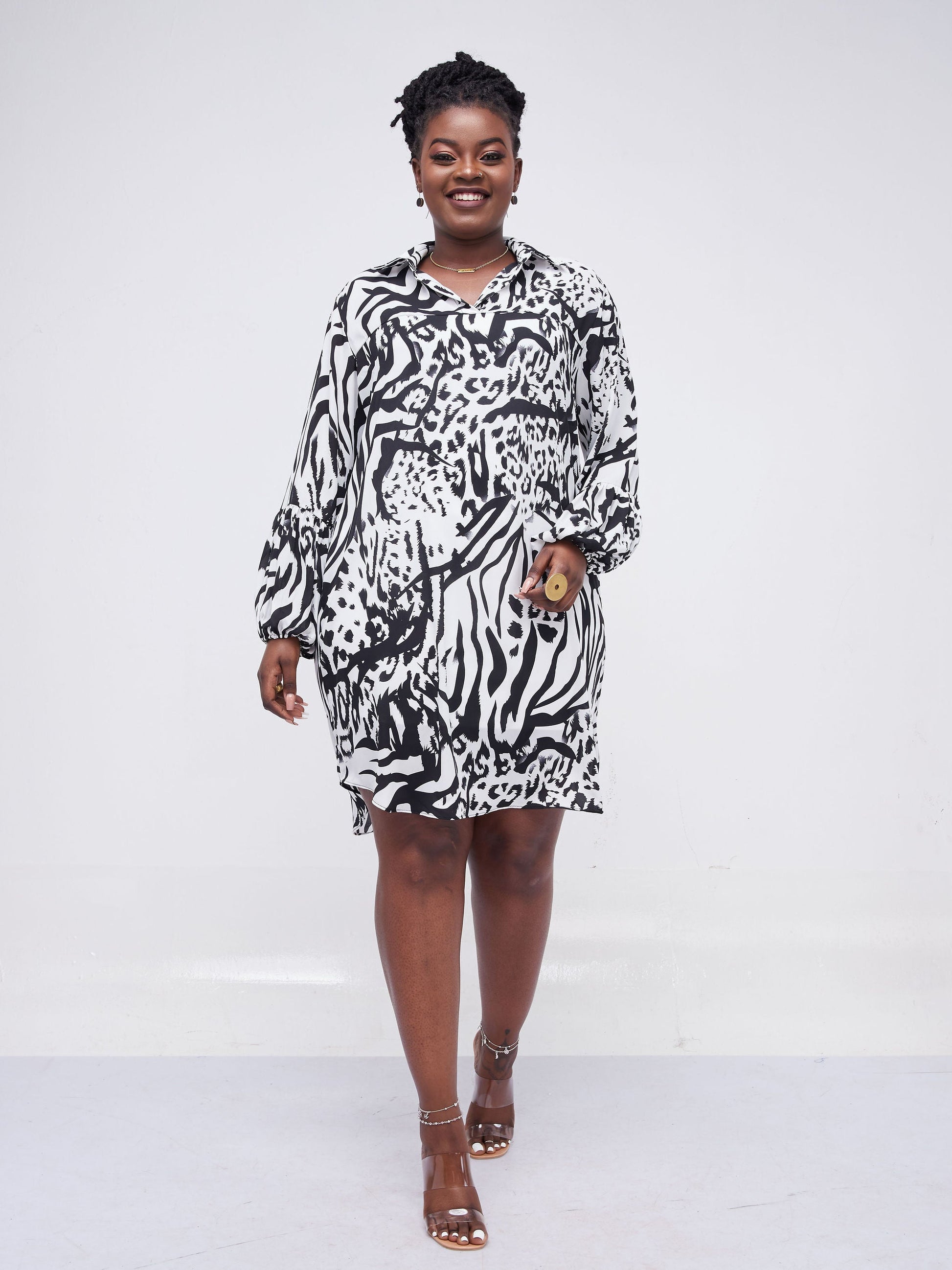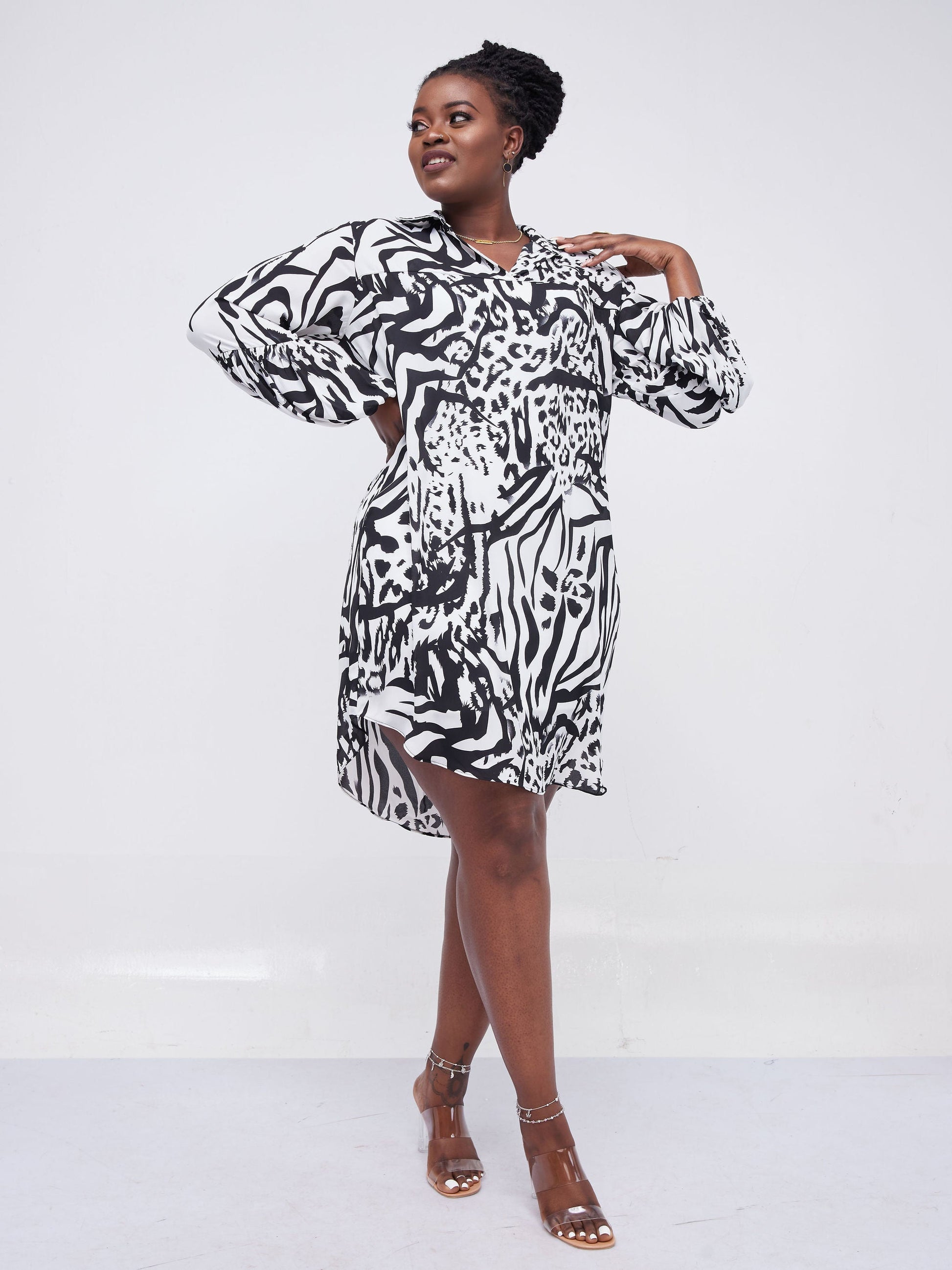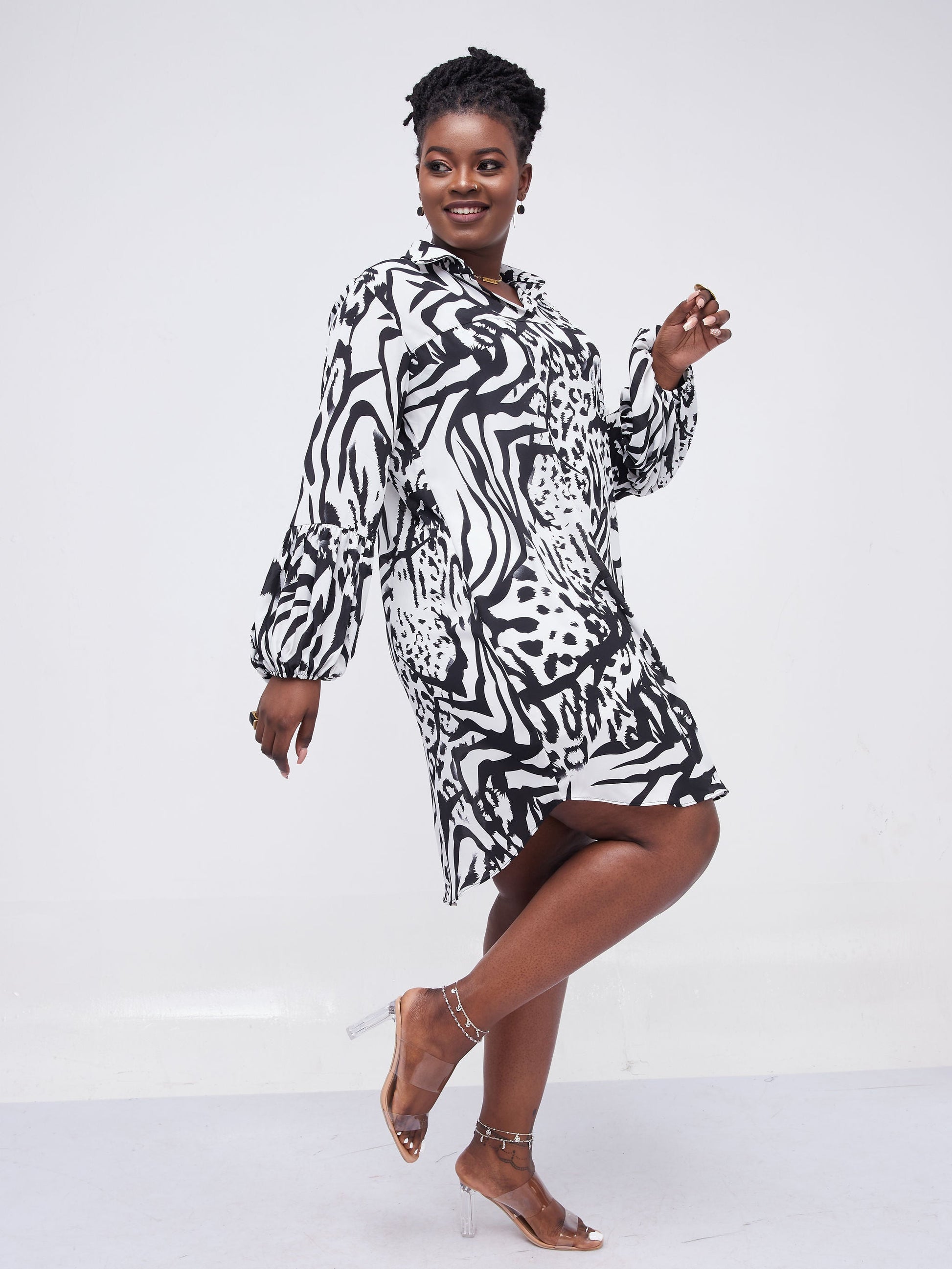 Safari Kaya Bishop Panel Long Sleeve Knee Length Shirt Dress - Black / White print