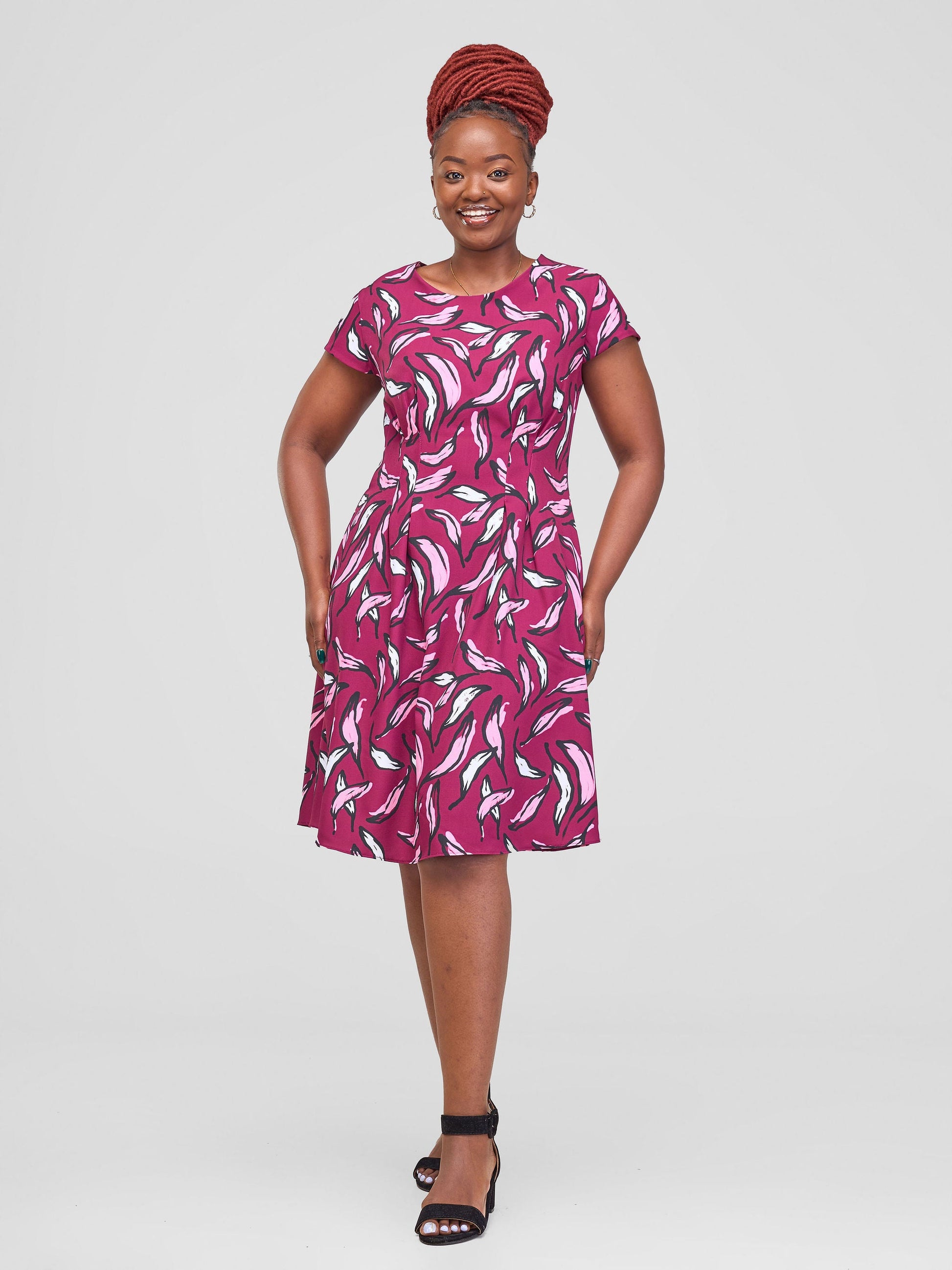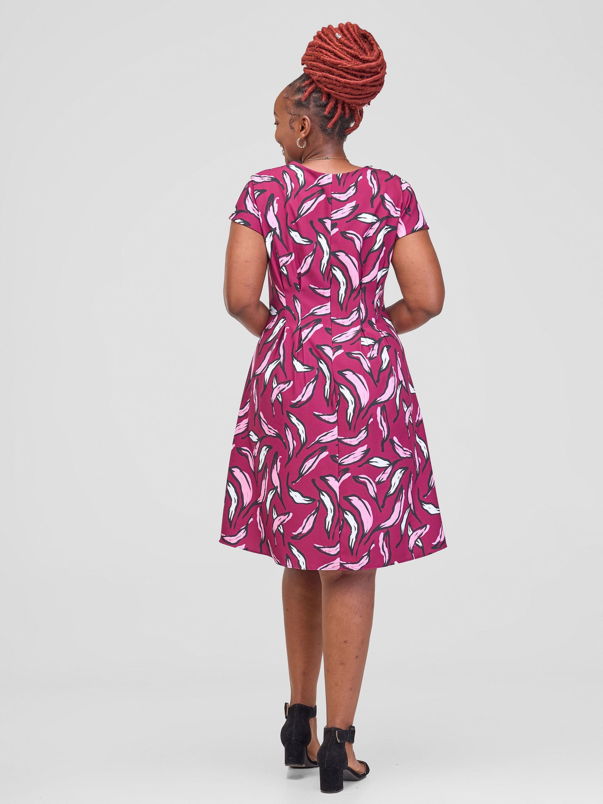 Vivo Ajani Pleated A-line Cap Sleeve Dress - Burgundy/Pink Molo Print