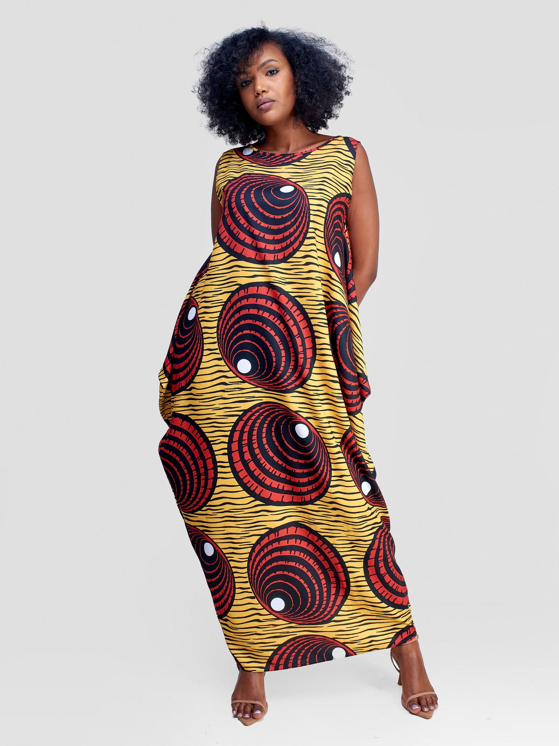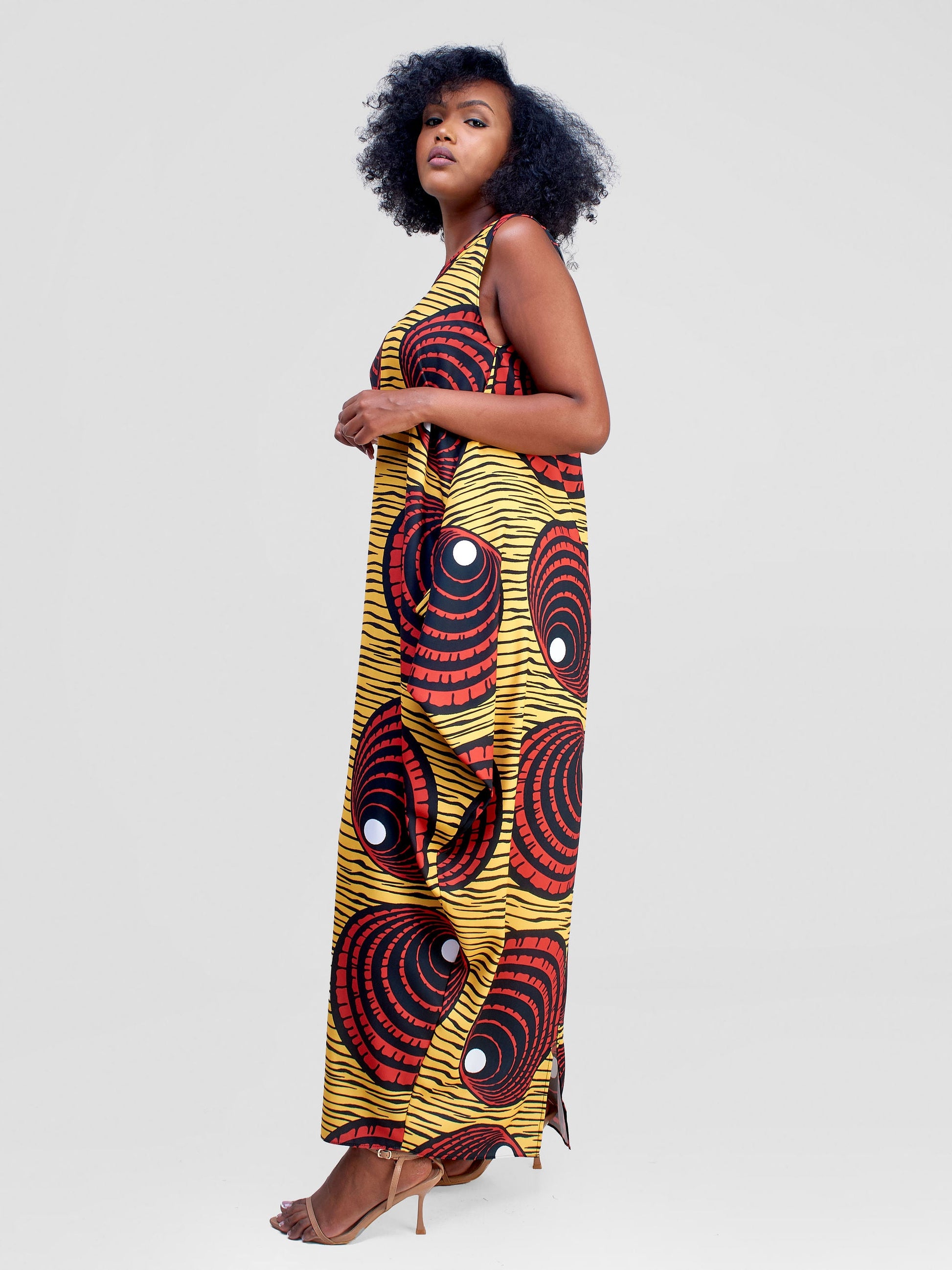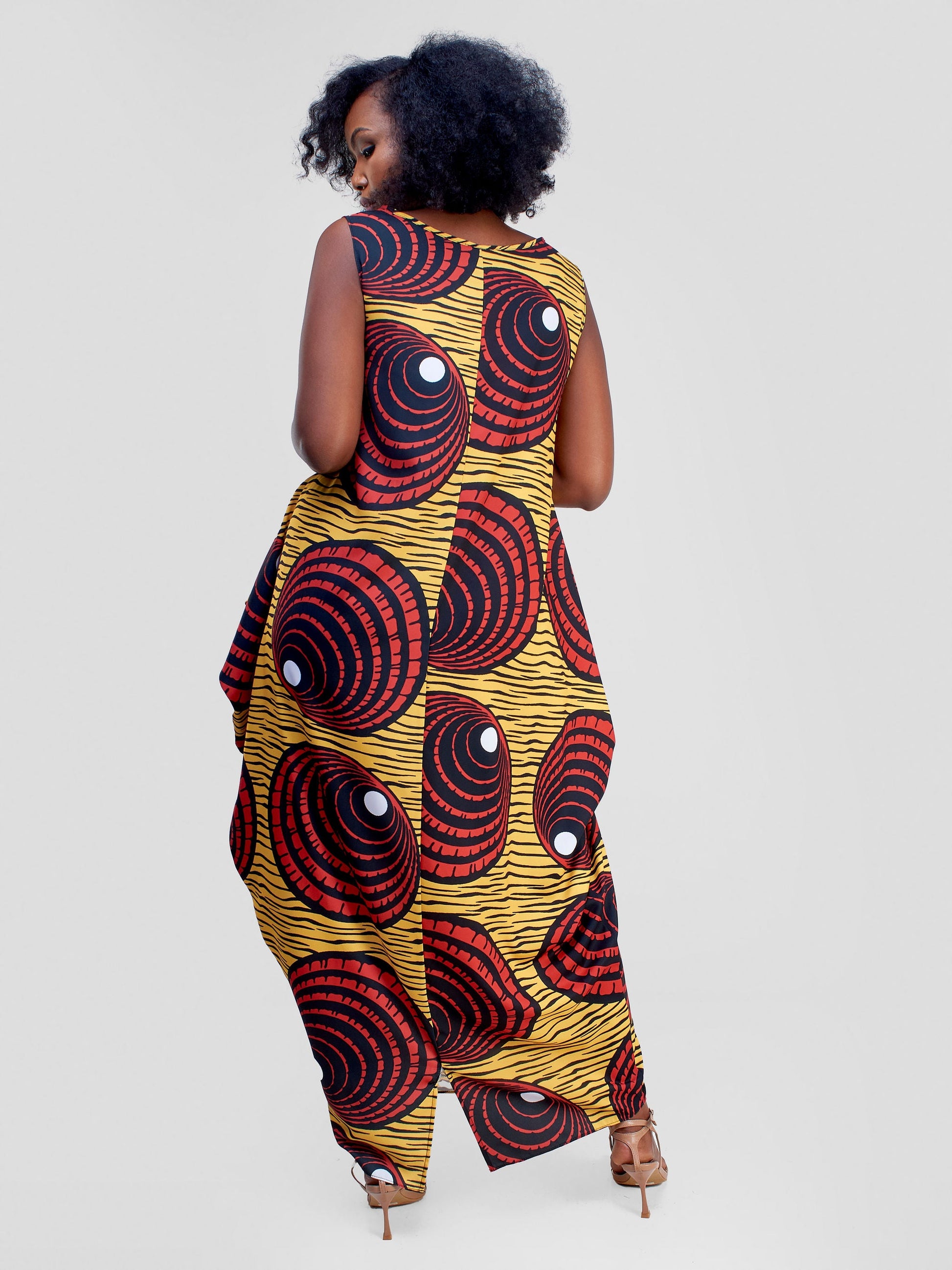 Vivo Alek Side Cowl Sleeveless Maxi Dress - Yellow / Red Abstract Print