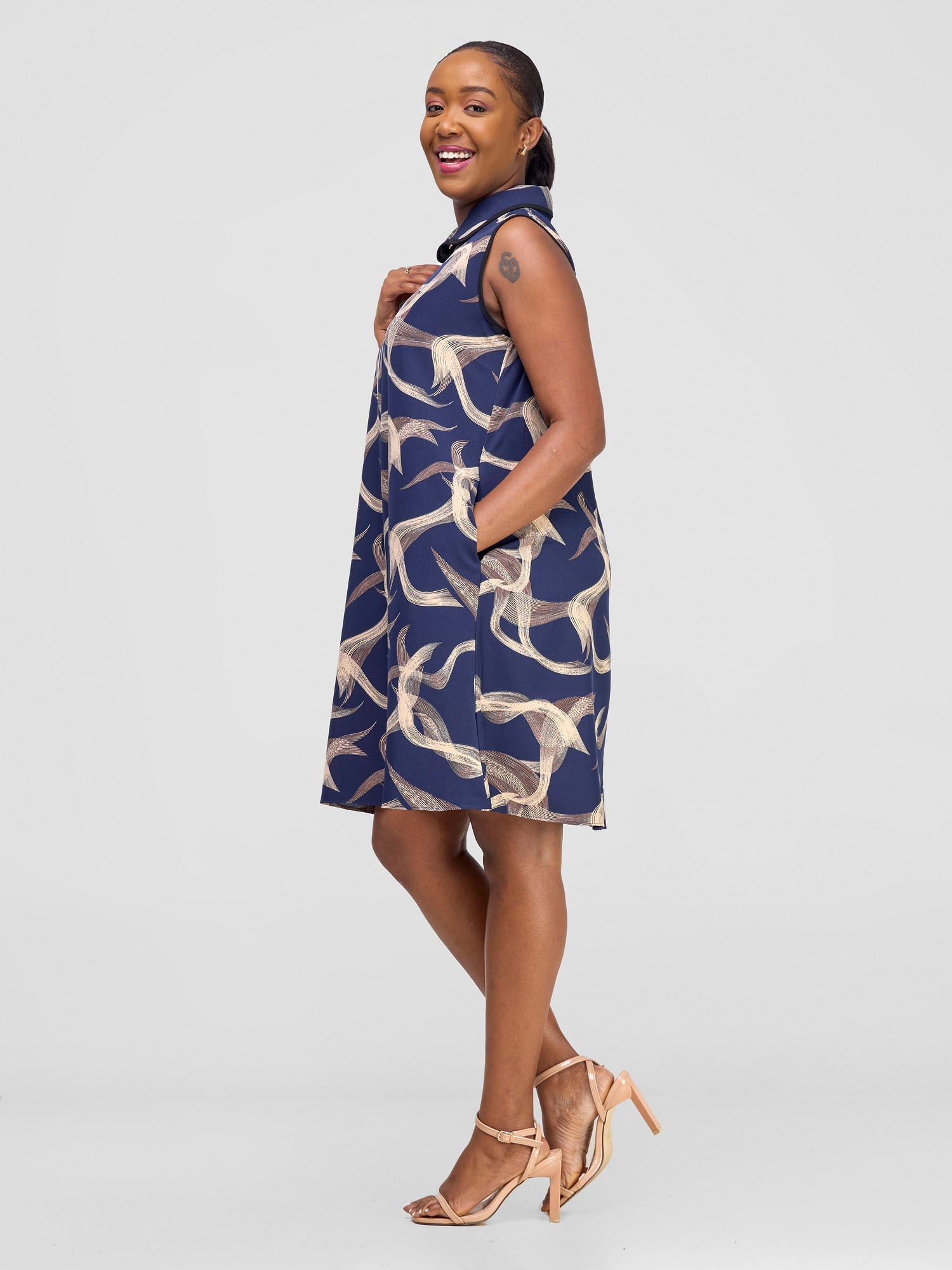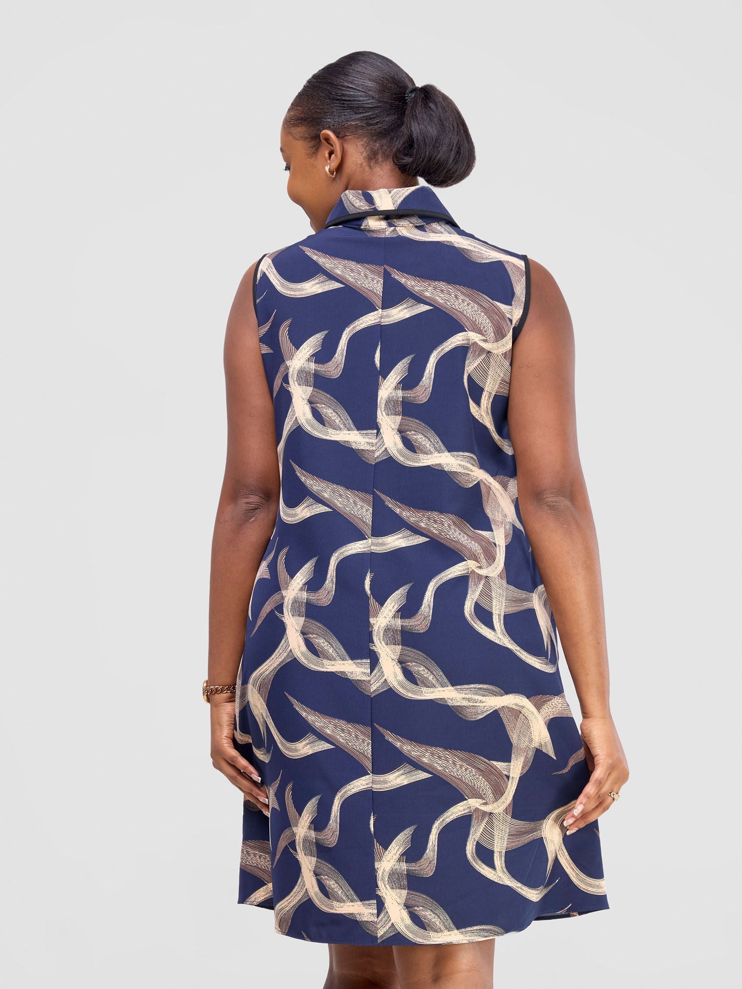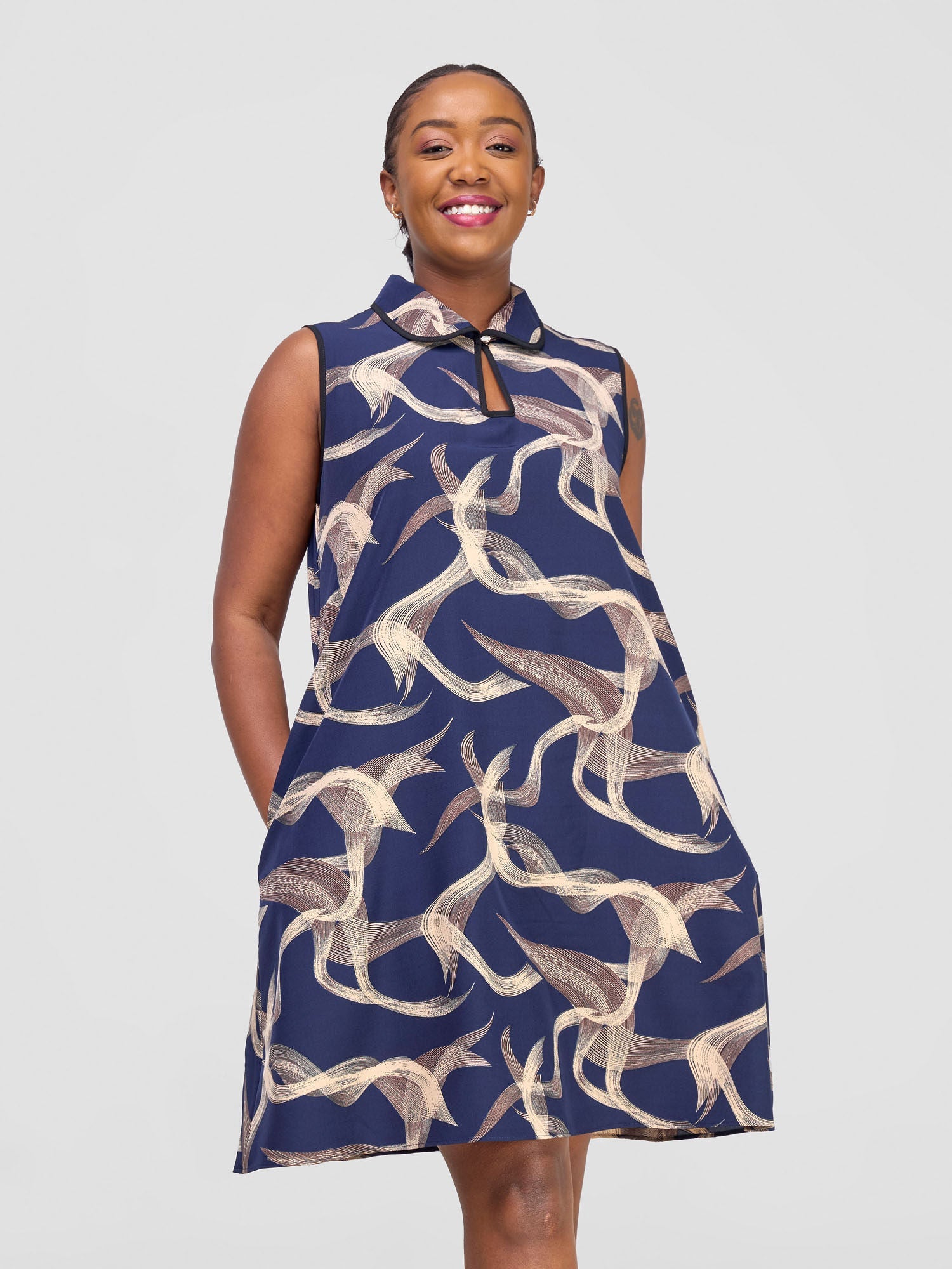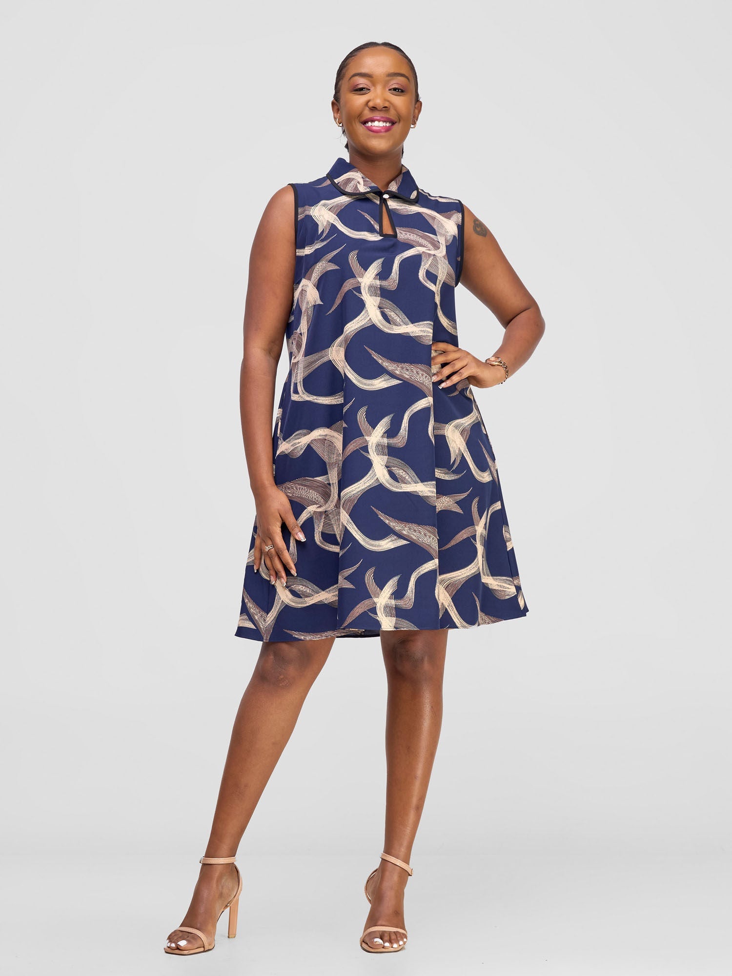 Vivo Shaa Sleeveless Knee Length Dress - Navy / Beige Print
