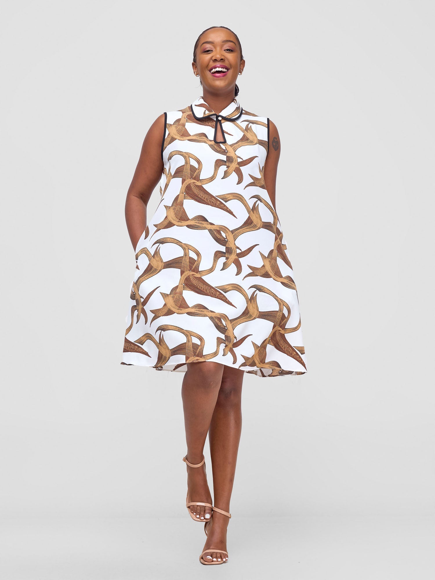 Vivo Shaa Sleeveless Knee Length Dress - White / Brown Print
