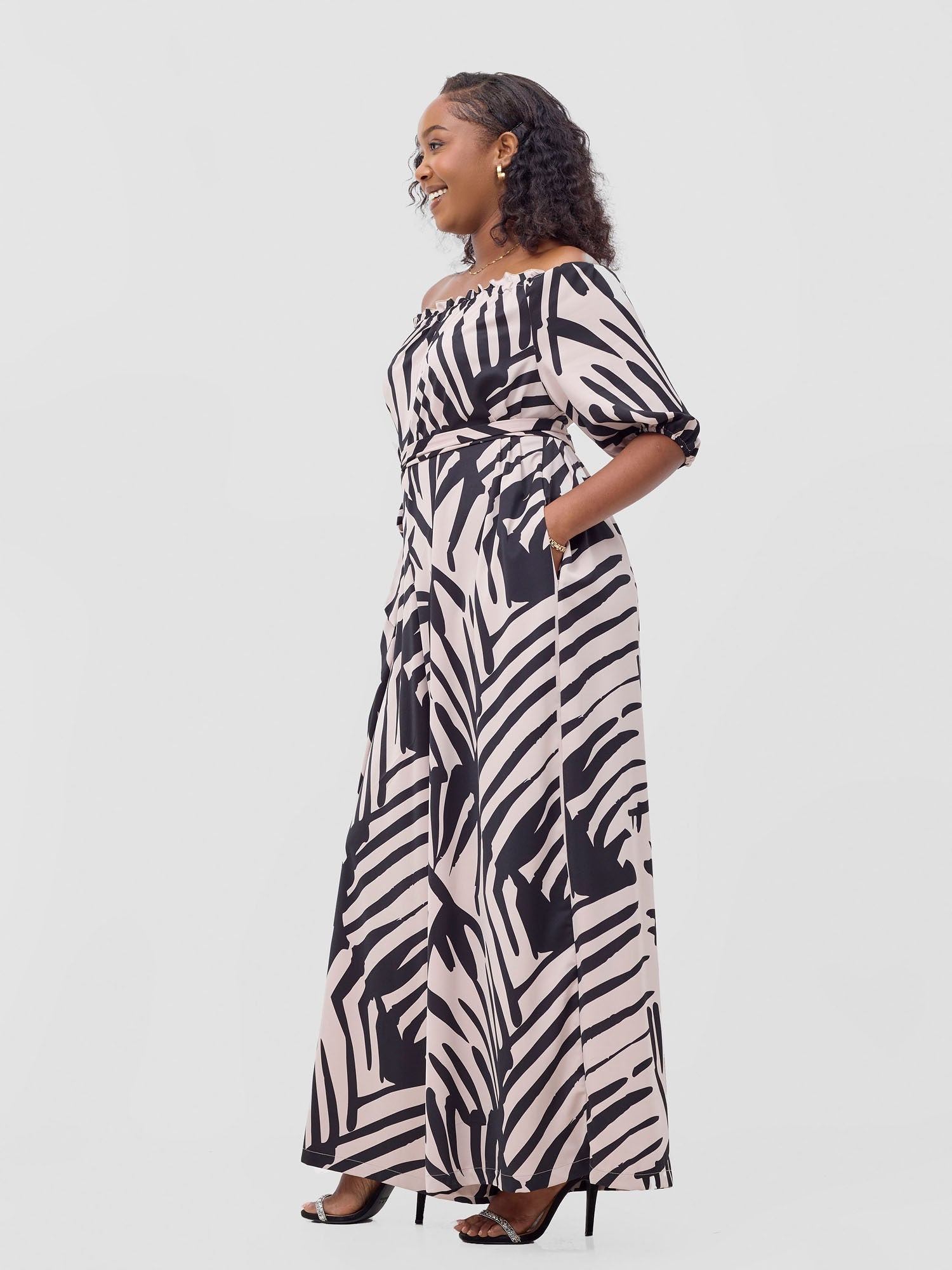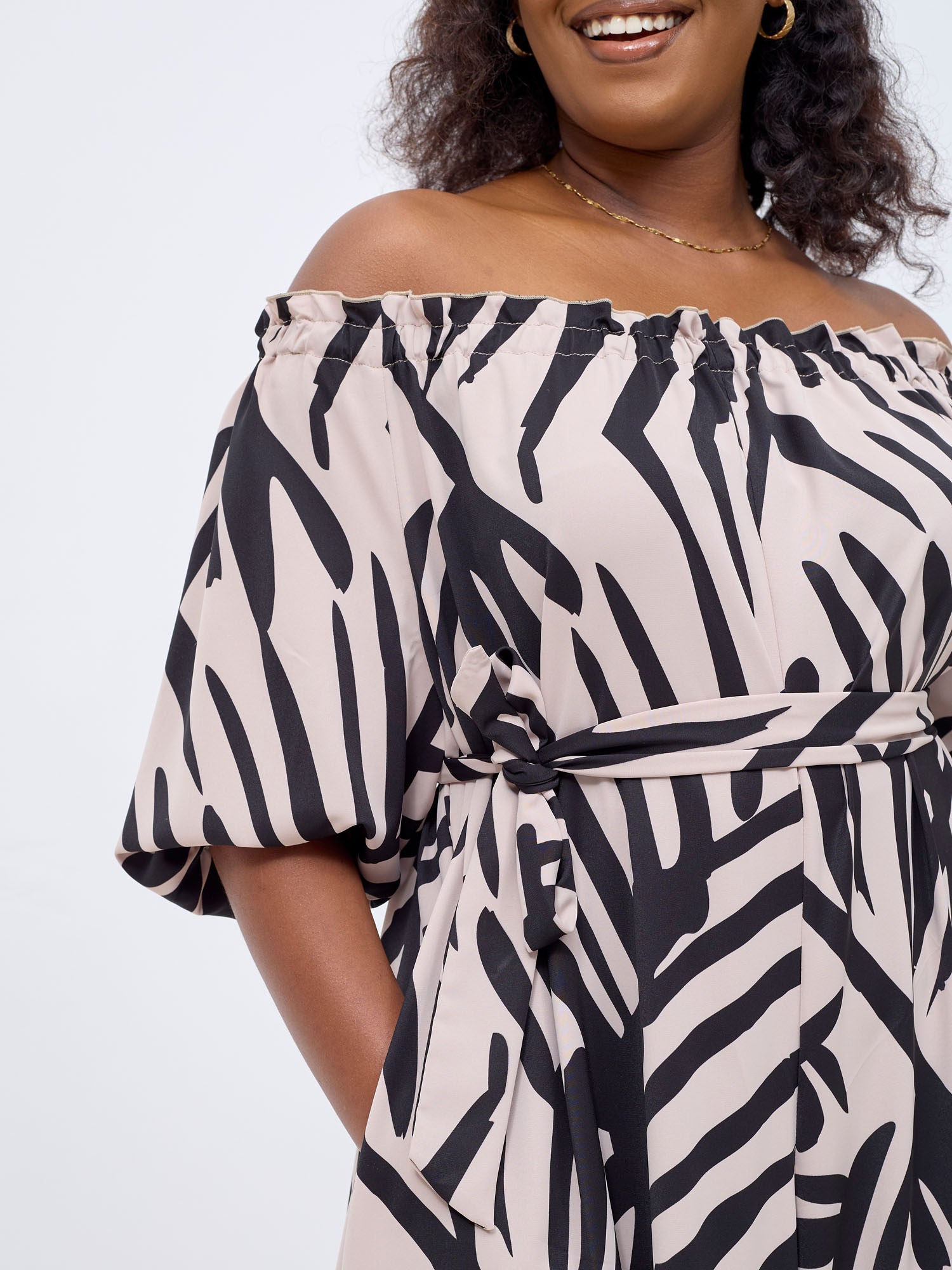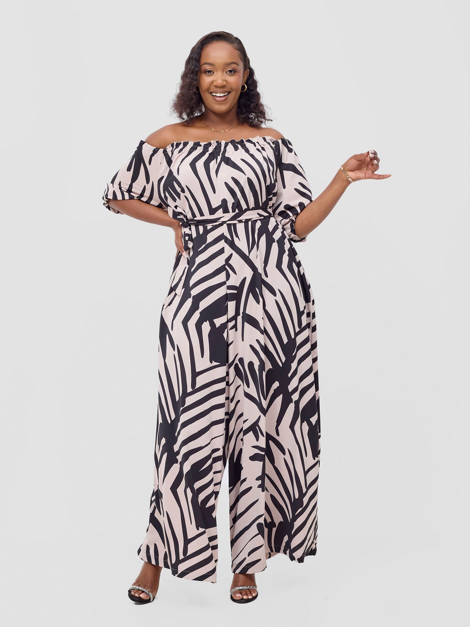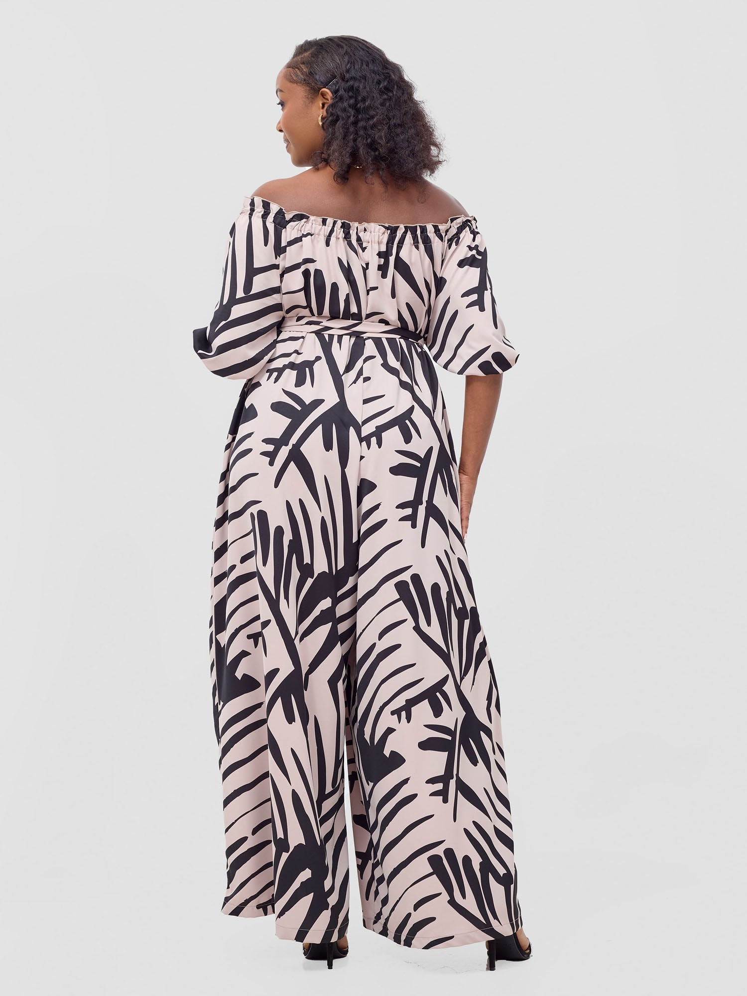 Vivo Ayla Off-Shoulder Jumpsuit - Light Taupe / Black Lala Print