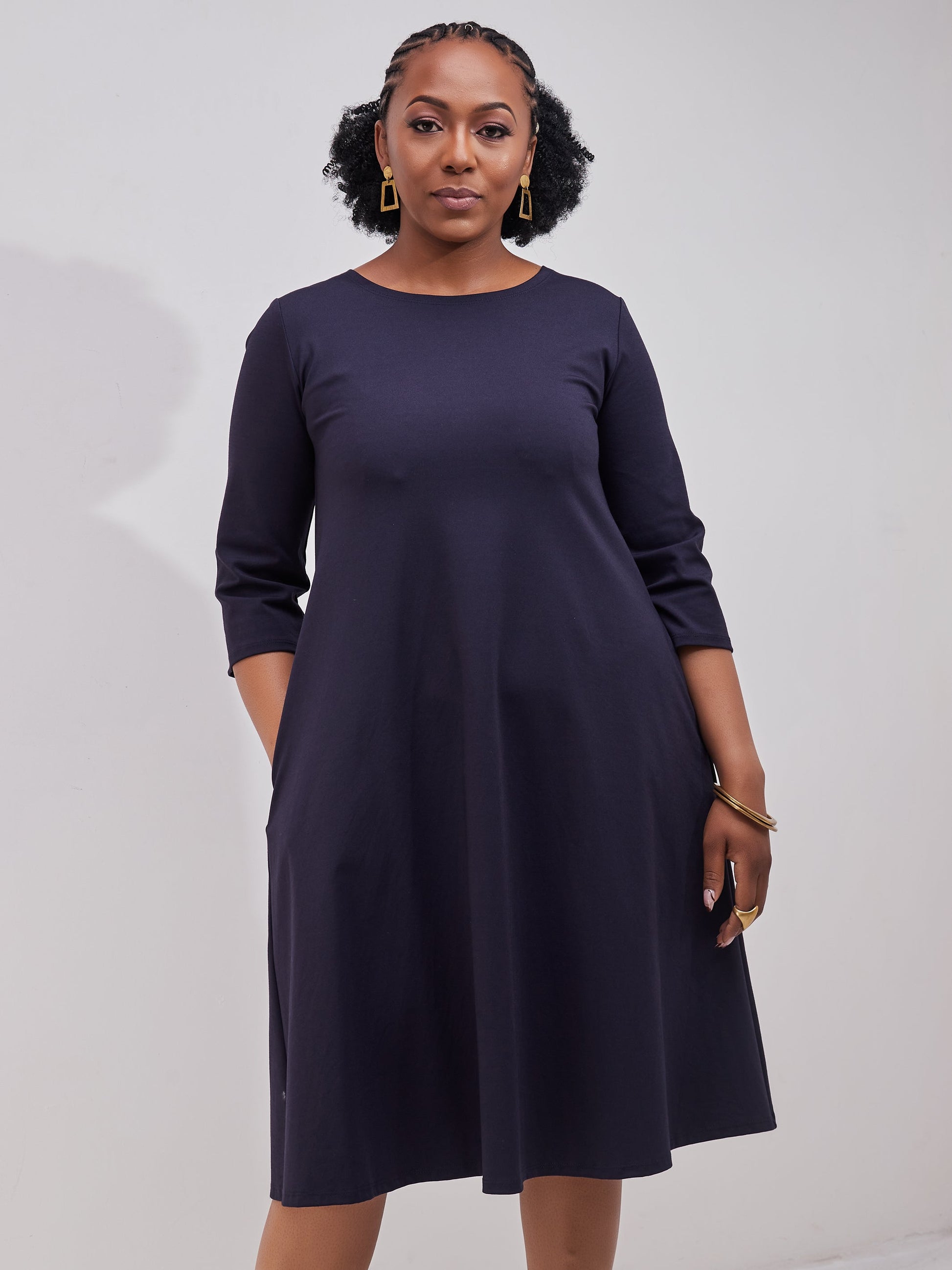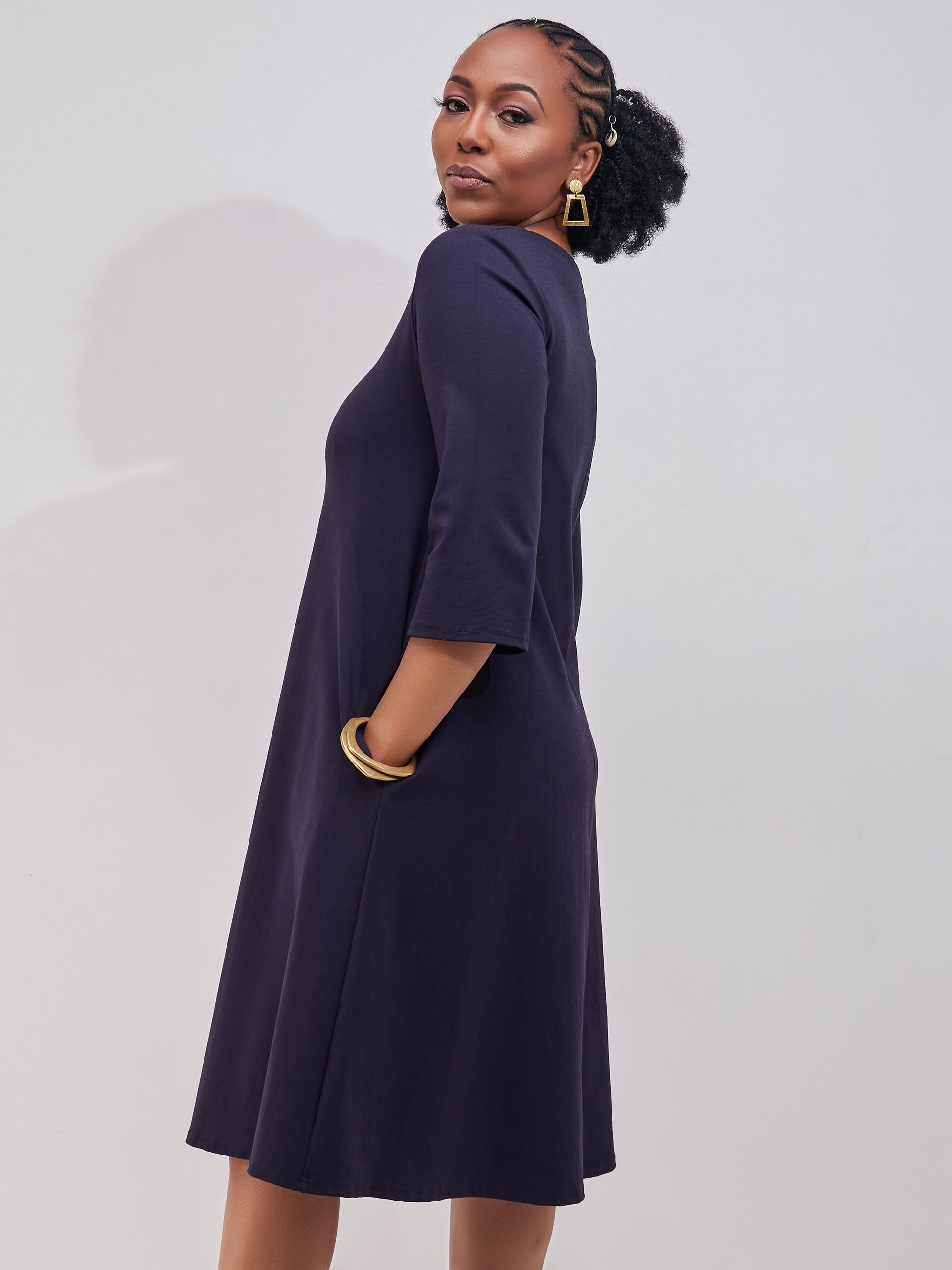 Vivo Basic 3/4 Sleeve Kena Tent Knee Length Dress - Navy Blue