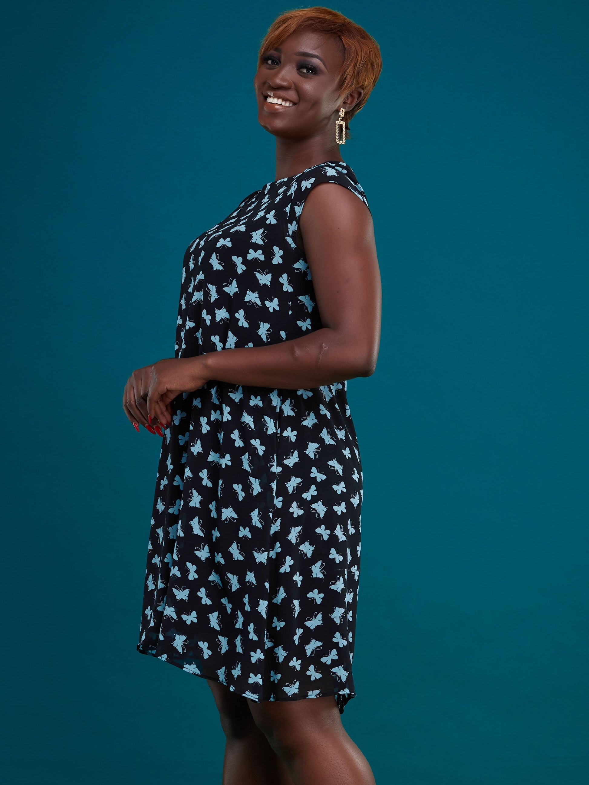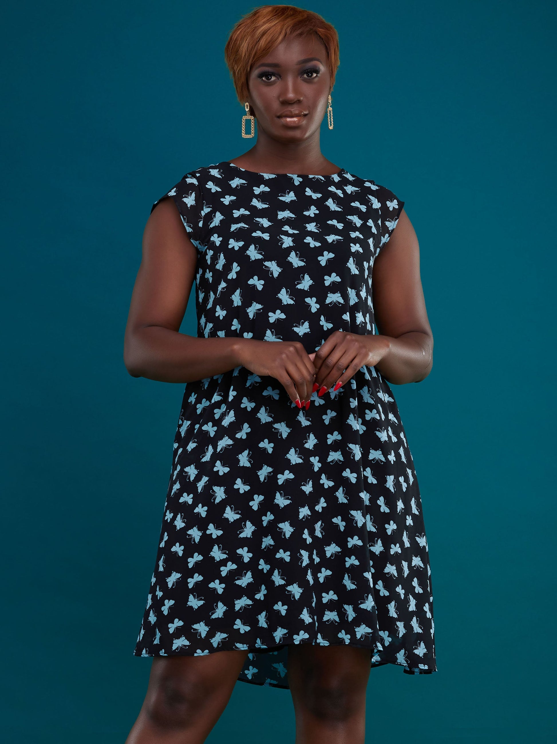Vivo Basic Cap Sleeve Knee Length Tent Dress - Black / Blue Print