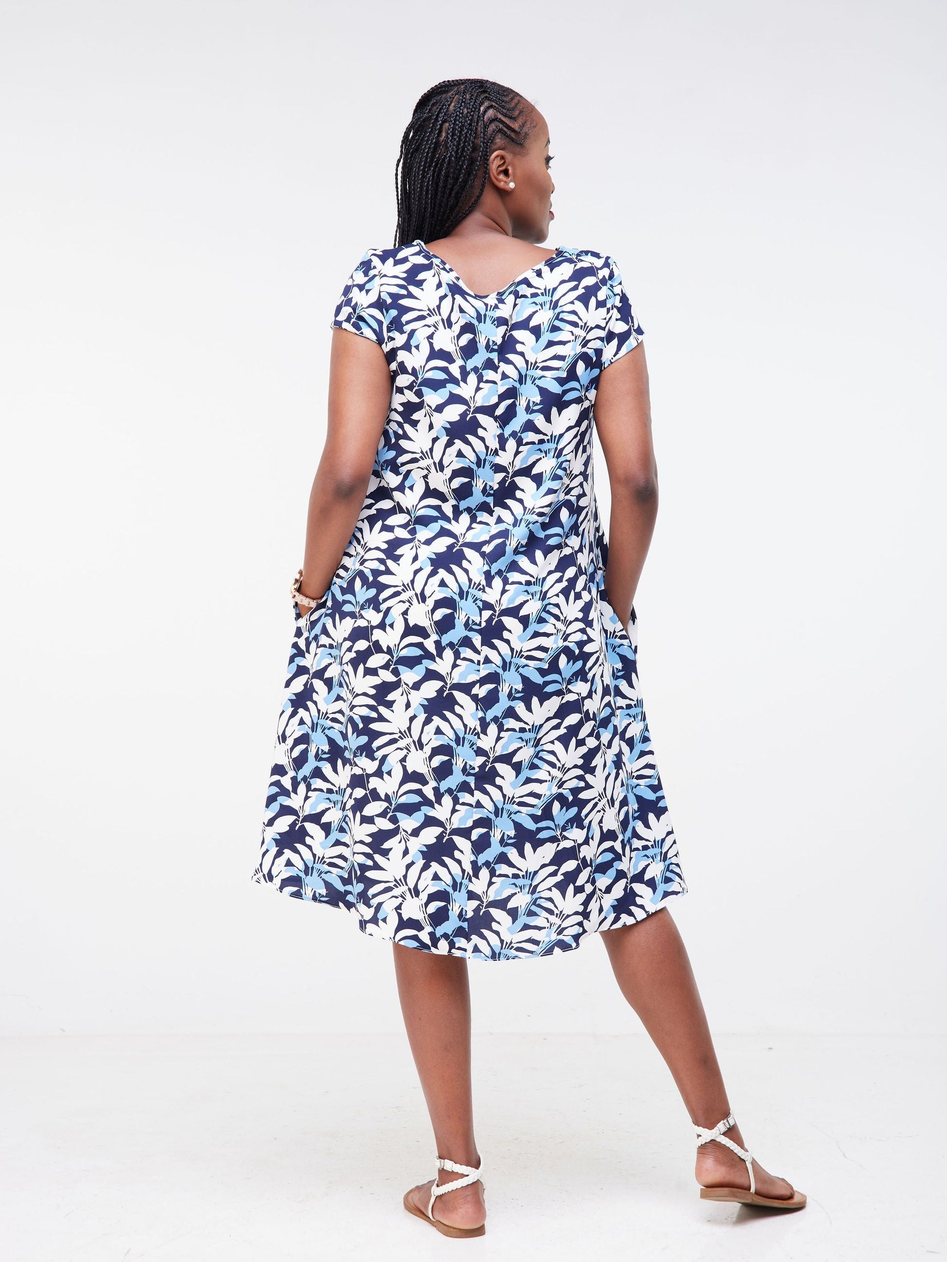 Vivo Basic Cap Sleeve Knee Length Tent Dress - Blue / Navy Blue Abstract Print
