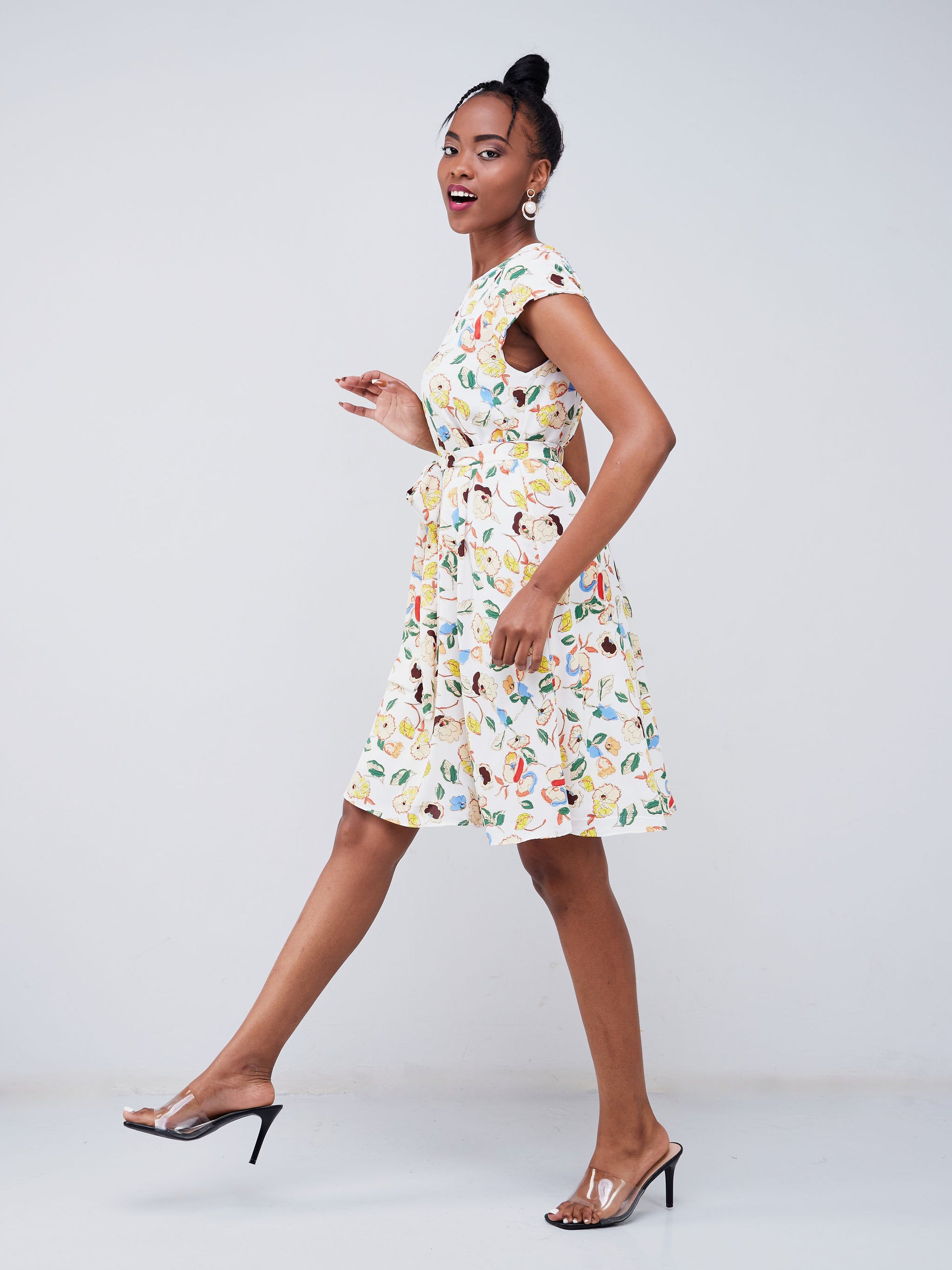 Vivo Basic Cap Sleeve Knee Length Tent Dress - Off White / Orange Floral Print