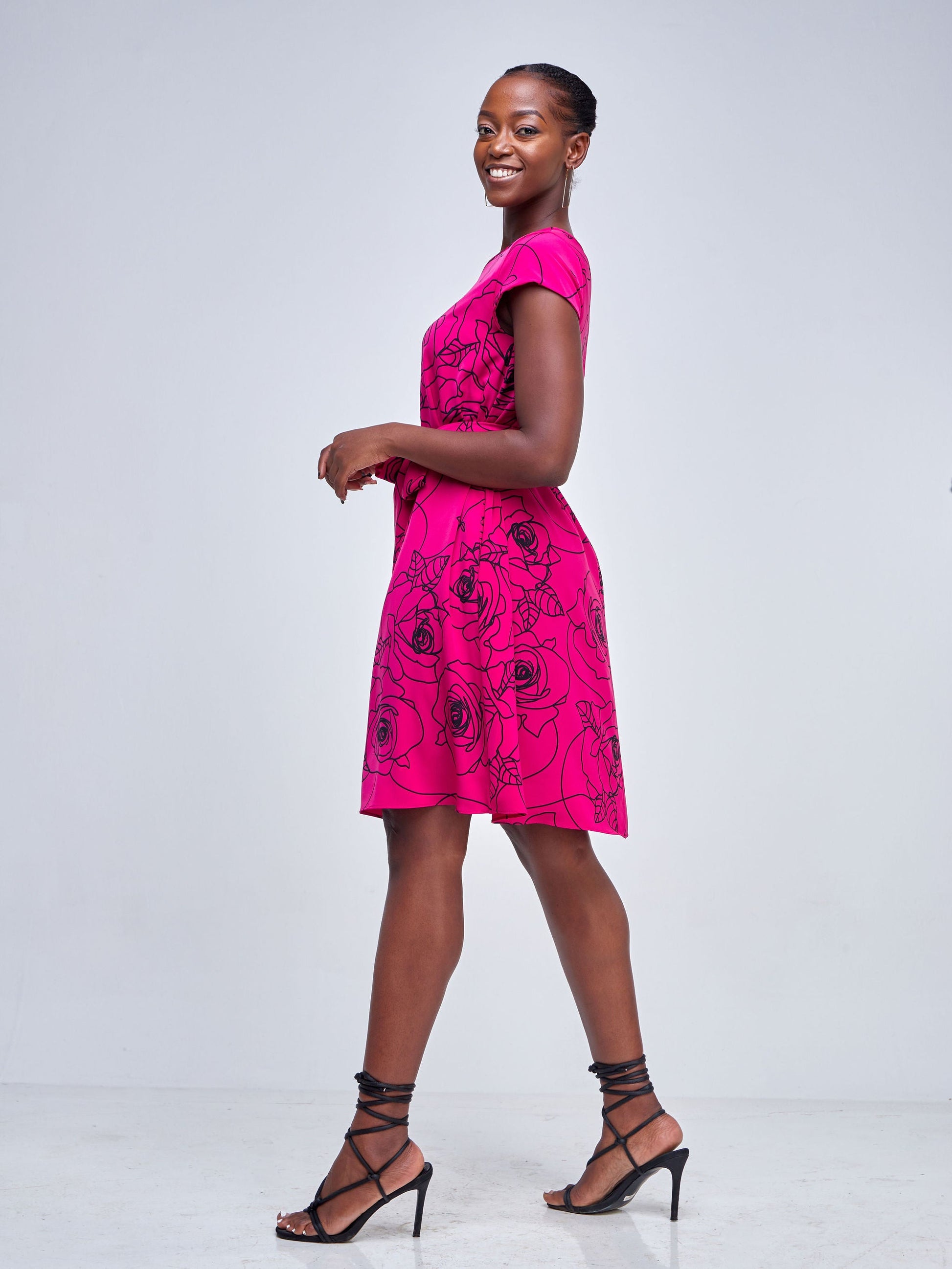 Vivo Basic Cap Sleeve Knee Length Tent Dress - Hot Pink / Black Floral Print