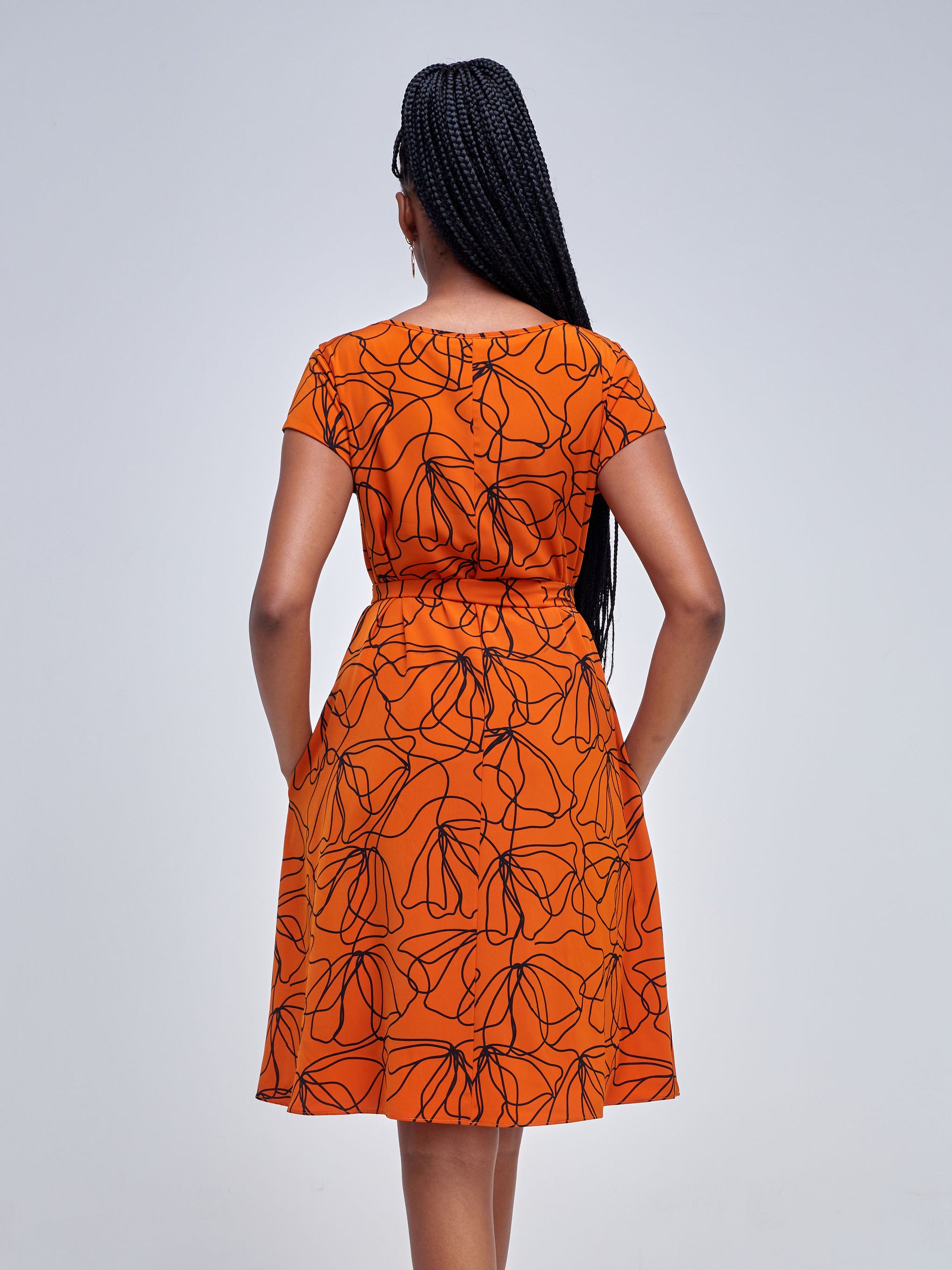 Vivo Basic Cap Sleeve Knee Length Tent Dress - Rust / Black Abstract Print