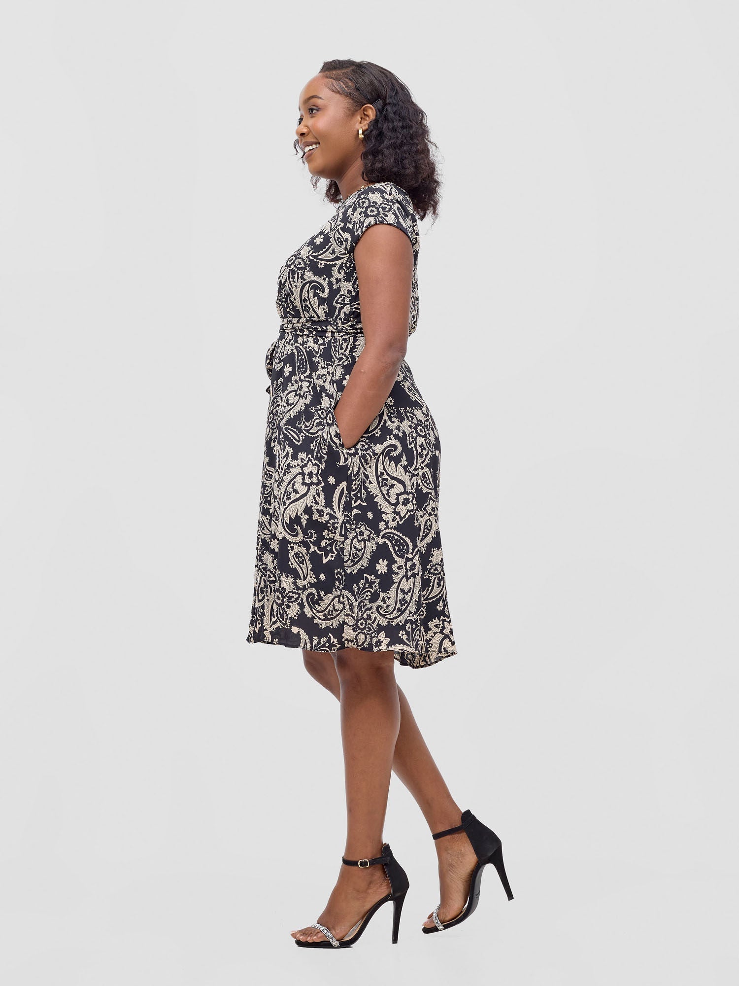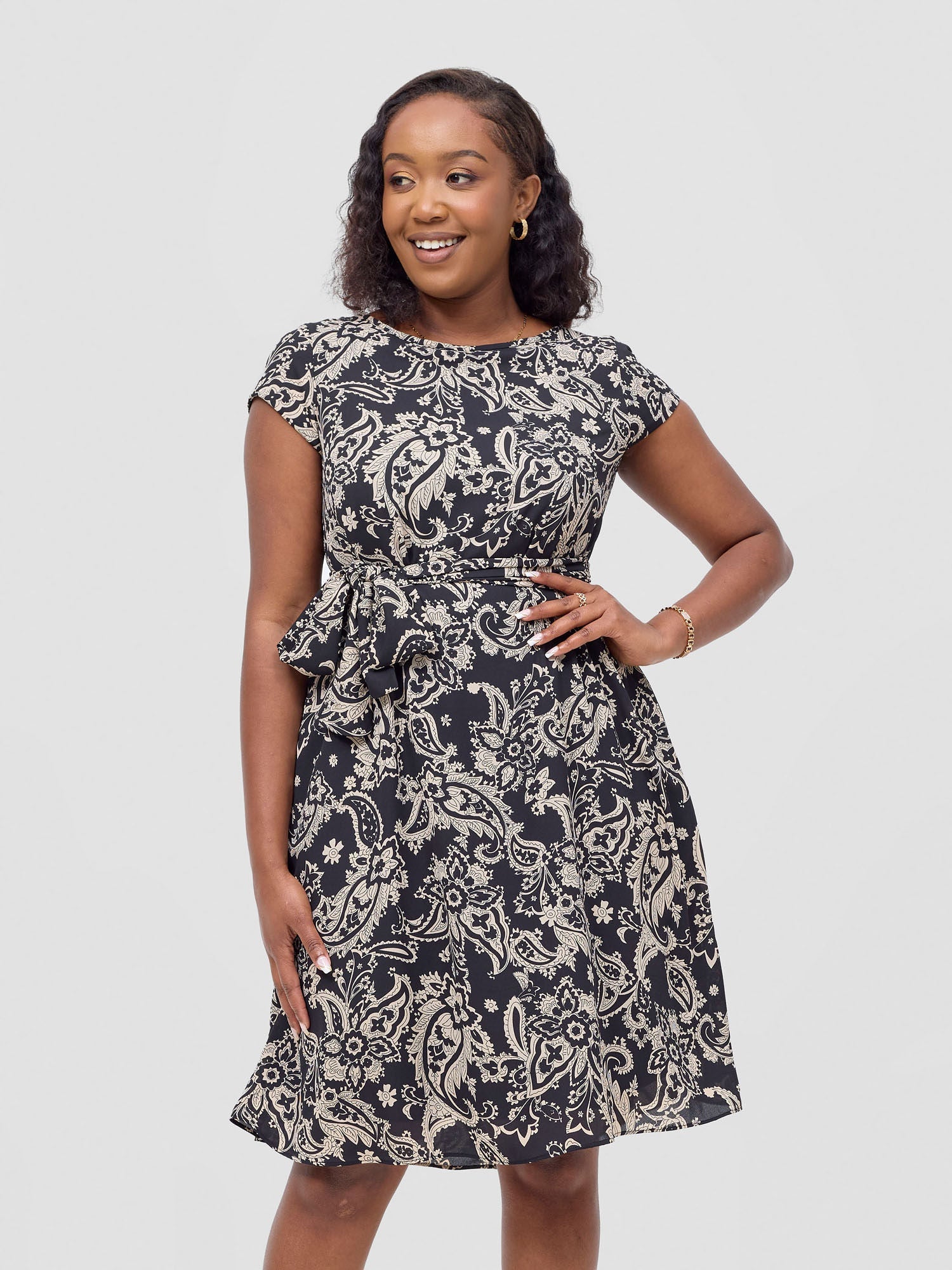 Vivo Basic Cap Sleeve Tent Knee Length Dress - Black / Beige Sedo Print