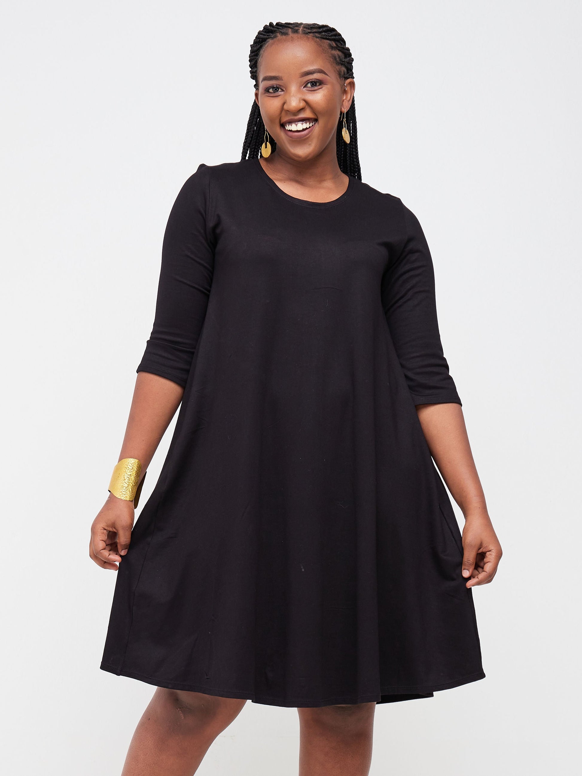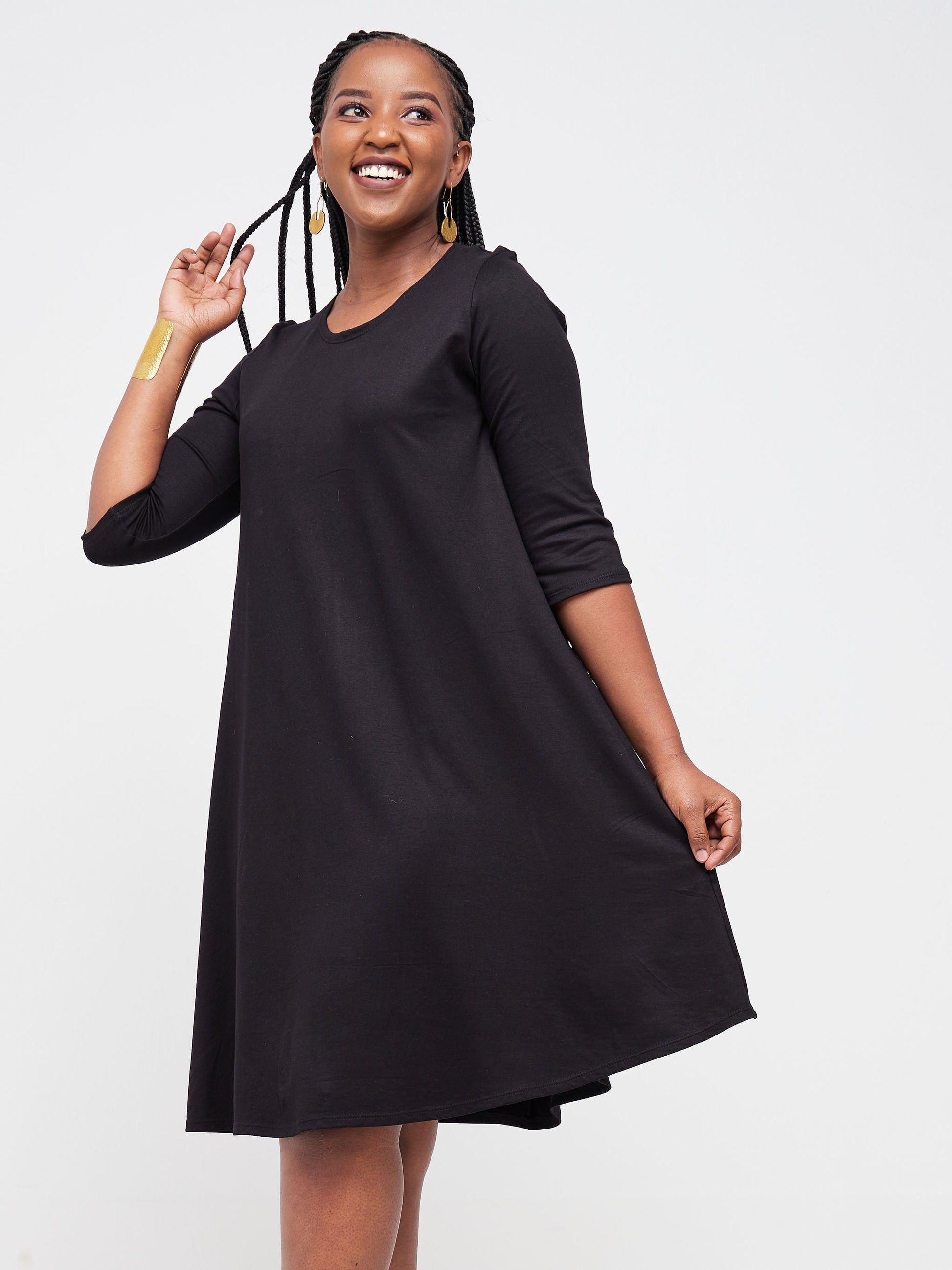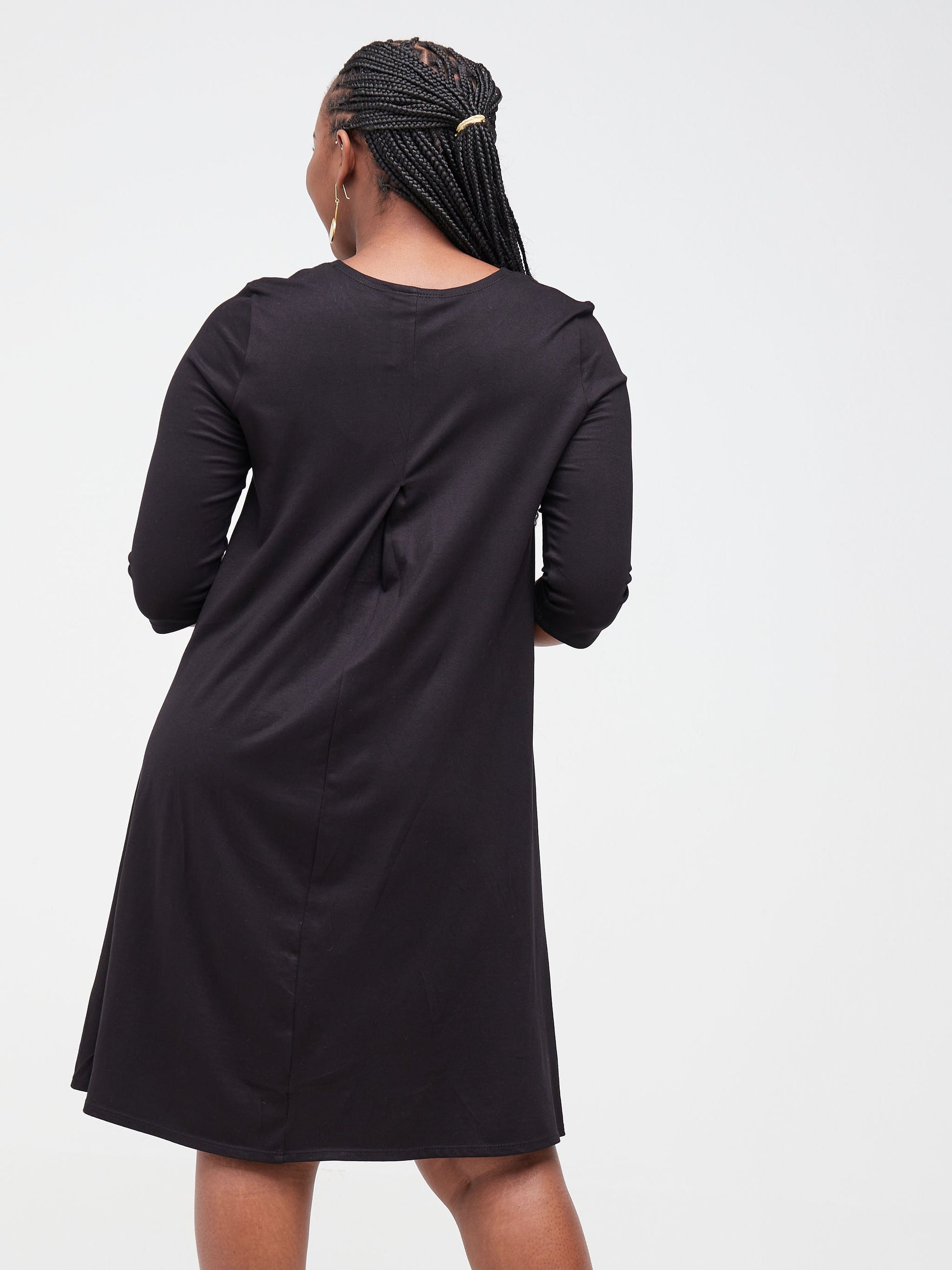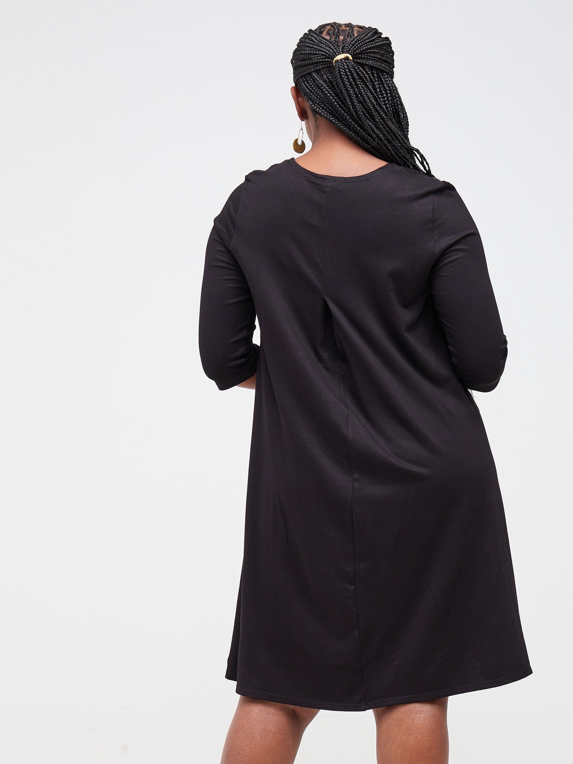 Vivo Basic Julia 3/4 Sleeve Back Pleat Knee Length Dress - Black