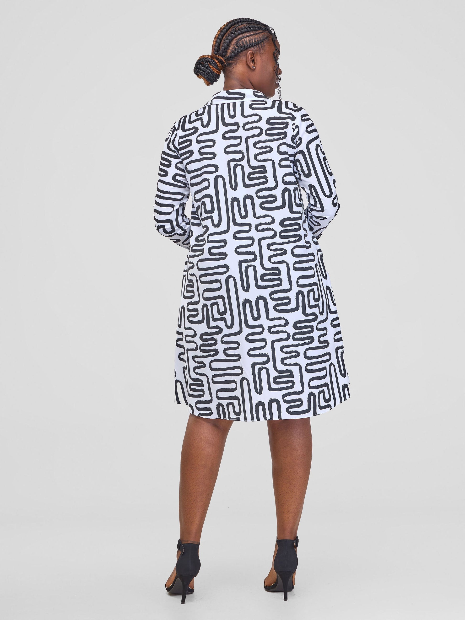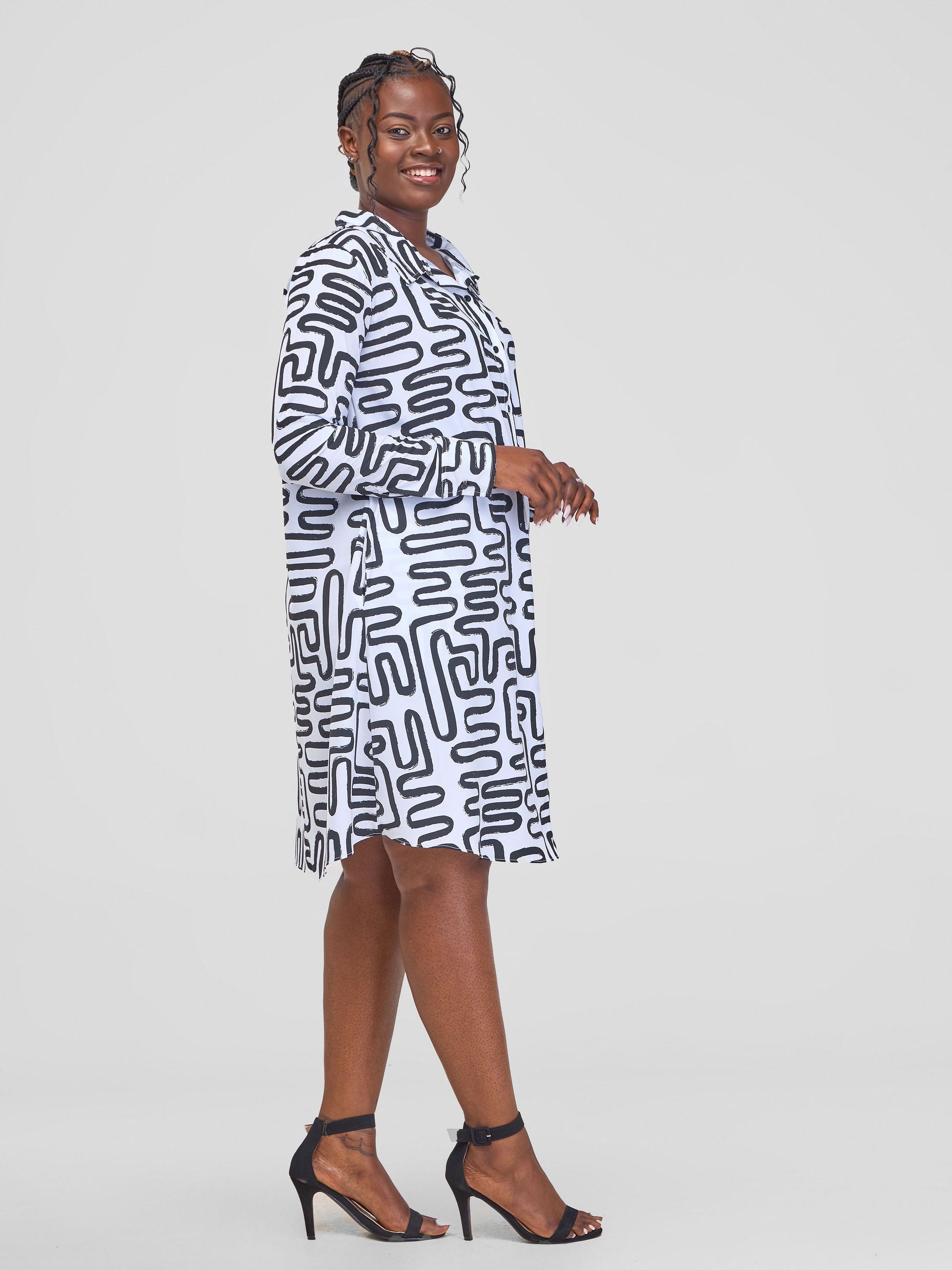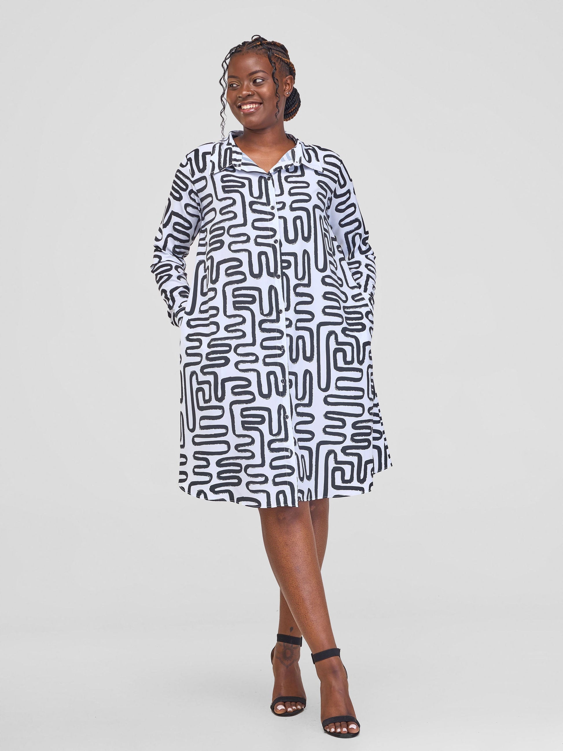 Vivo Basic Long Sleeve Tent Shirt Dress - White / Black Abstract Print