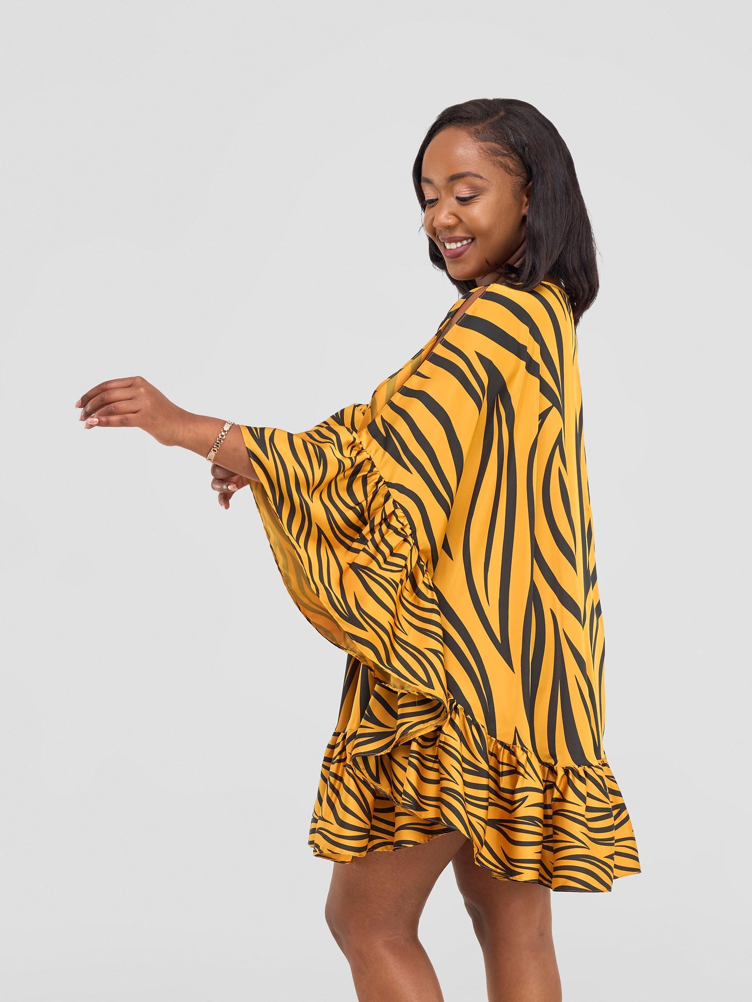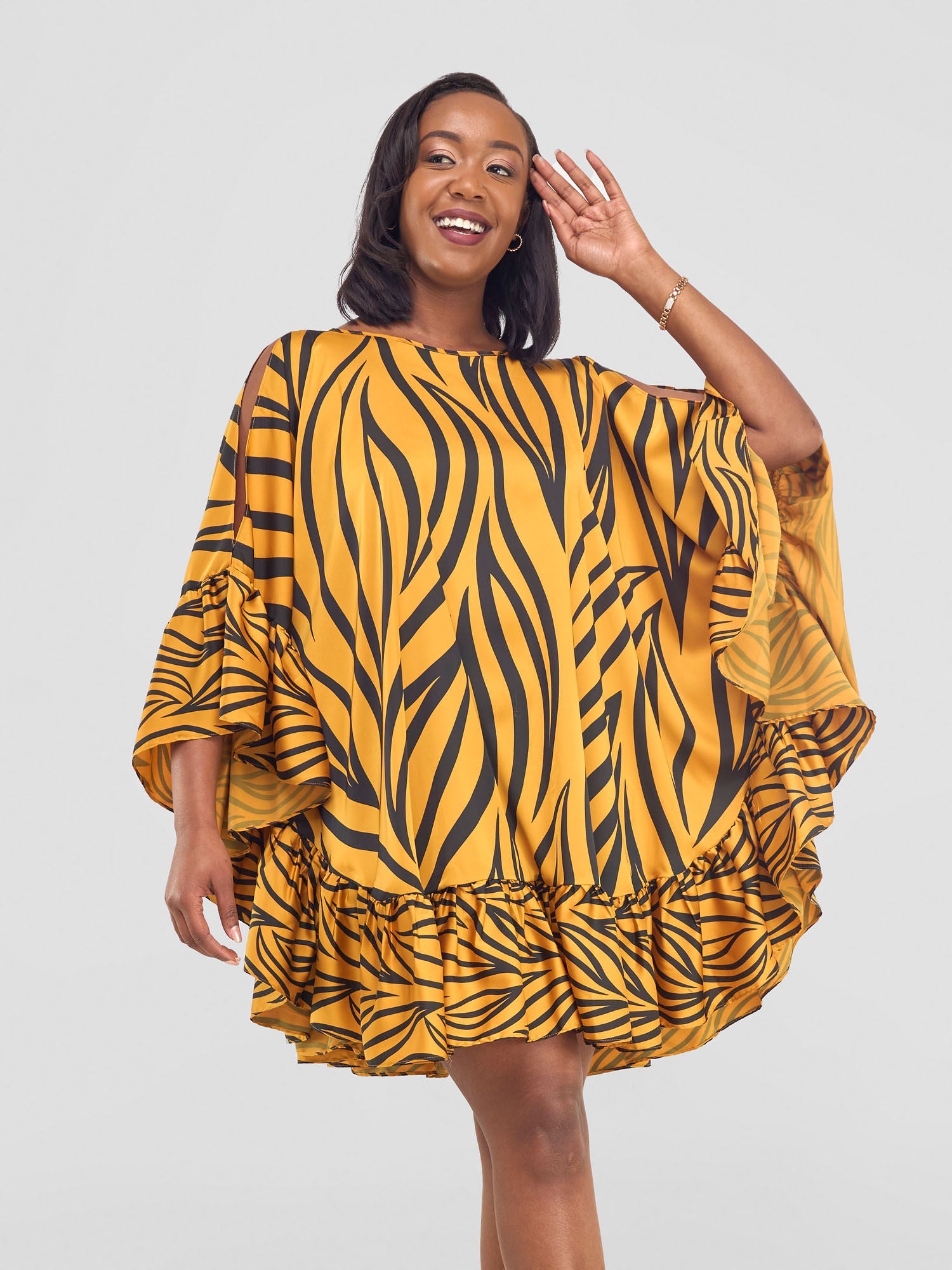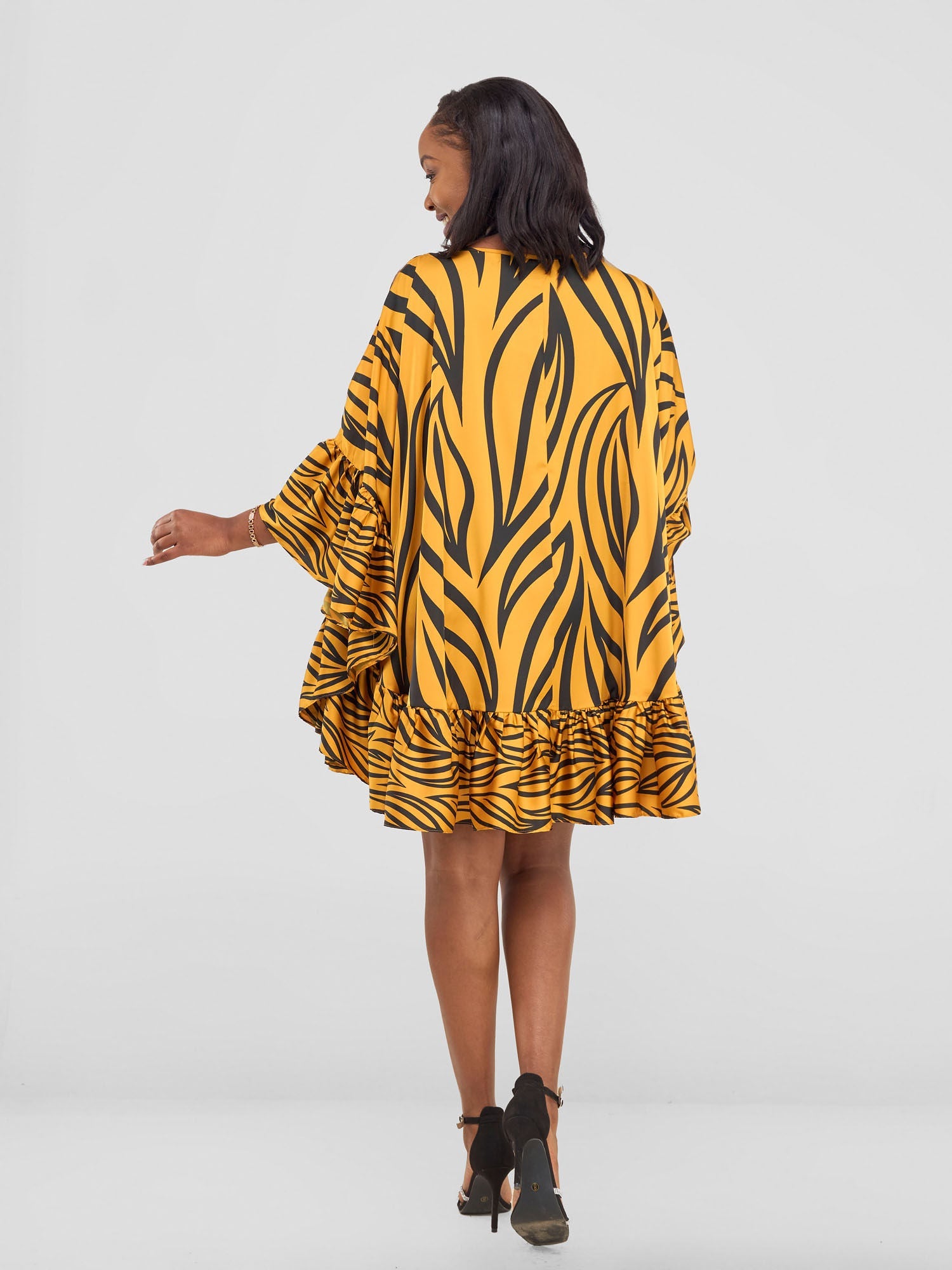 Vivo Chidii Tunic Dress With Frills - Mustard / Black Ameli Print