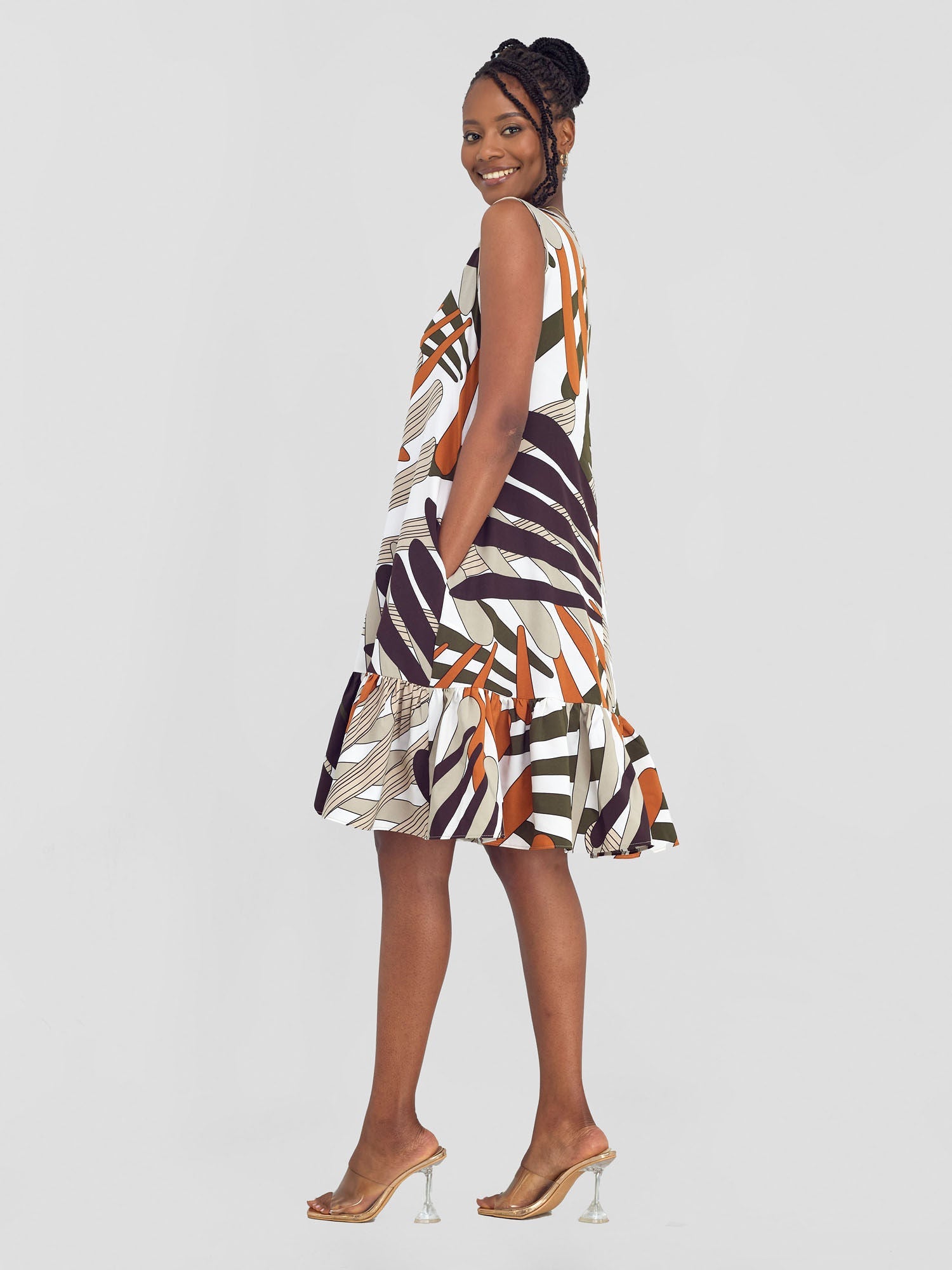 Vivo Dalia Sleeveless Gathered Tent Dress - Taupe / Brown Print