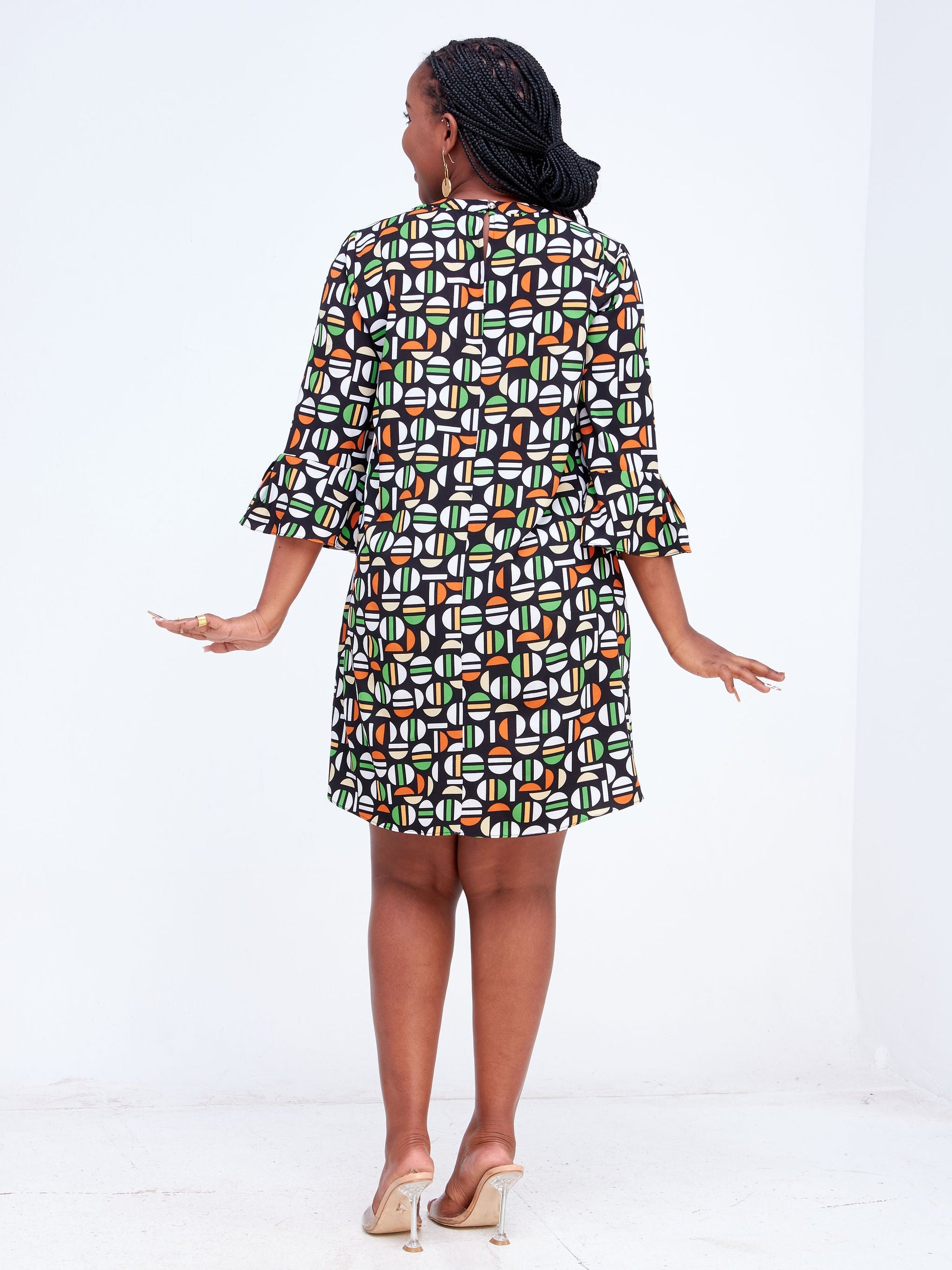 Vivo Imali Tie Sleeve Shirt Dress - Green / Brown Geometric Print