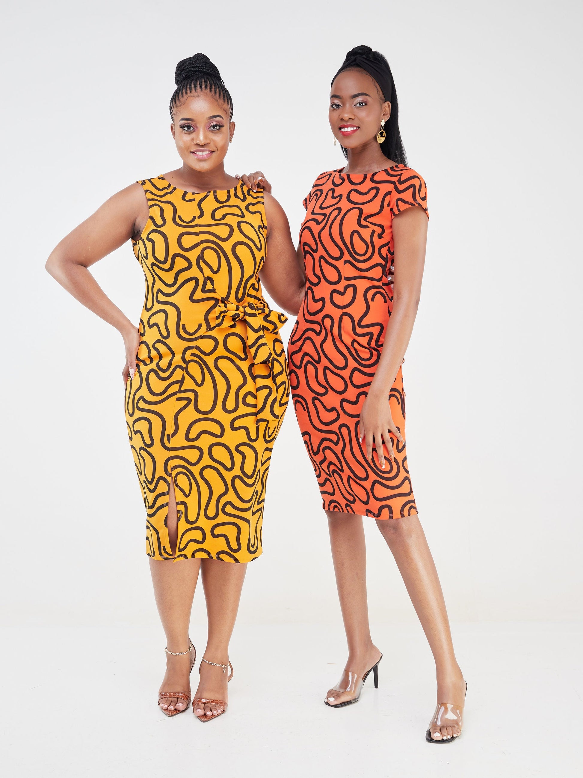 Vivo Imara Sleeveless Front Tie Dress - Mustard / Black Spiral Abstract Print