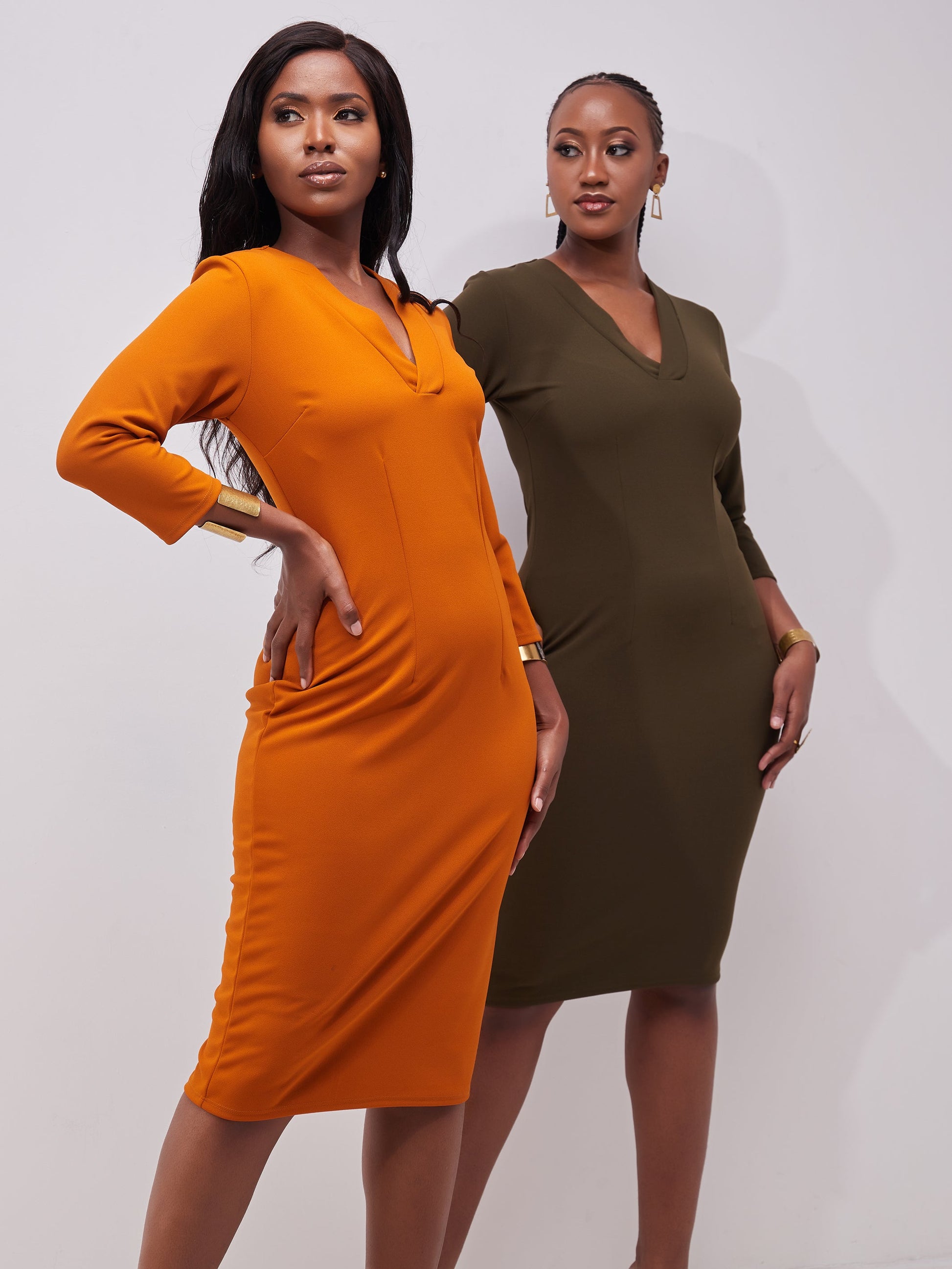 - Style: 3/4 Sleeve Sheath Dress with a V-Neckline. Can be worn with boots, flat shoes or heels.