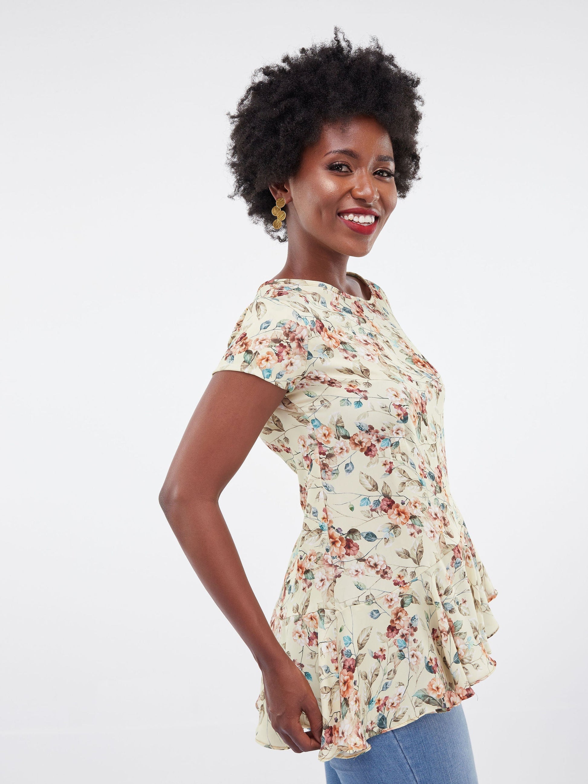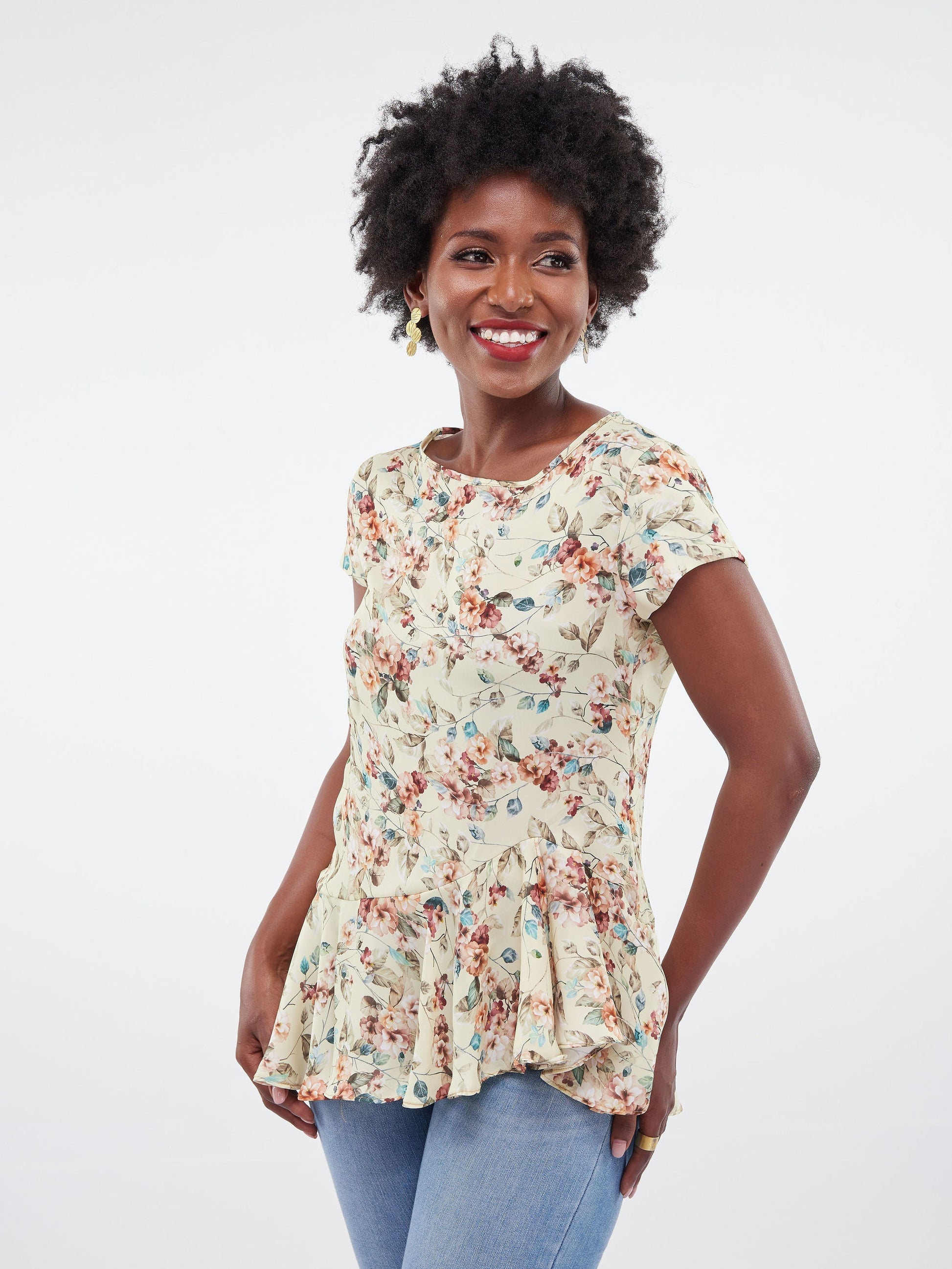 Vivo Jamila Asymetric Flounce Hem Top - Yellow Floral Print