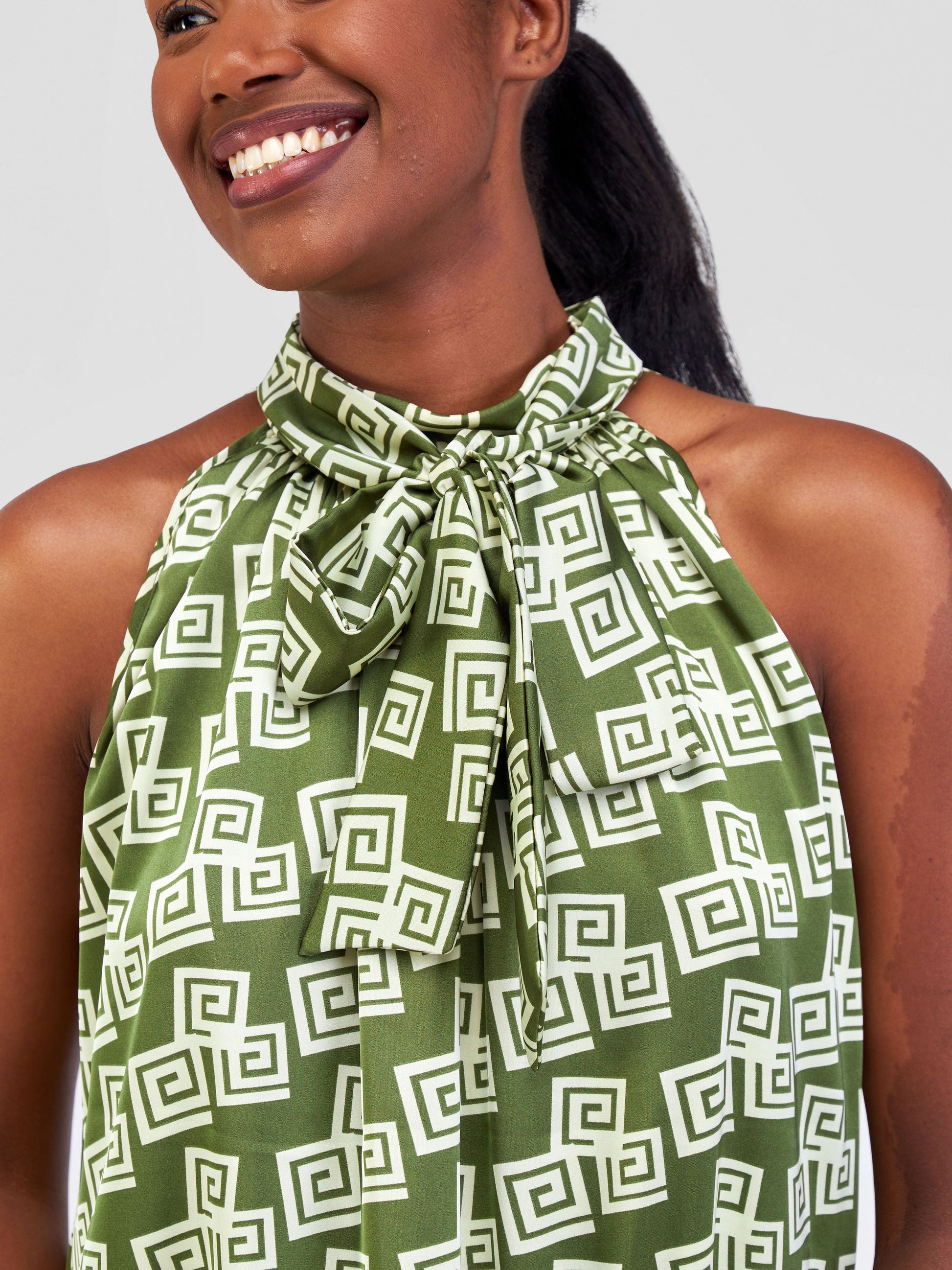 Vivo Jamila Halter Neck Knee Length Dress - Green / Cream Geometric Print