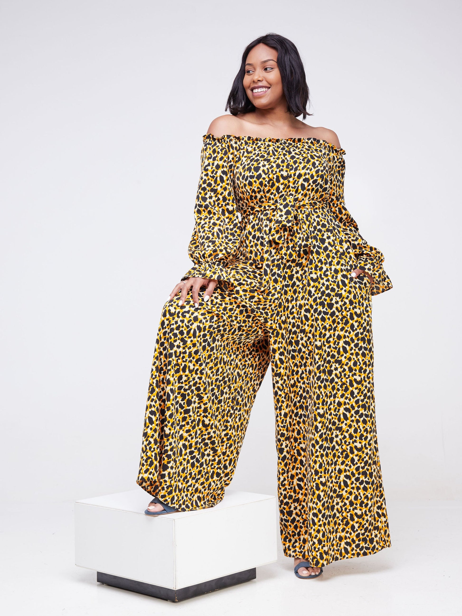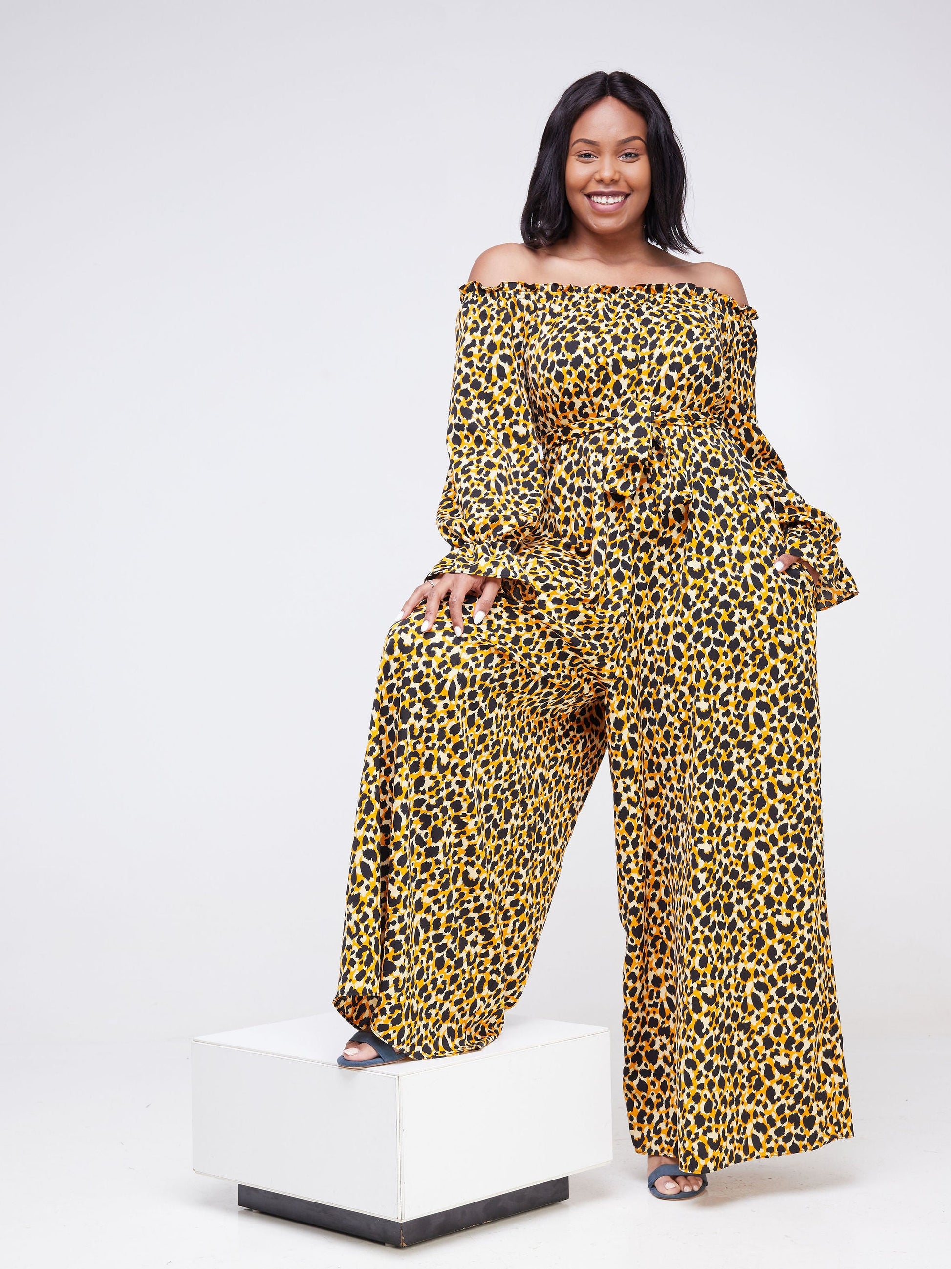 Vivo Jema Off-shoulder Long Sleeve Jumpsuit - Orange / Black Animal Print