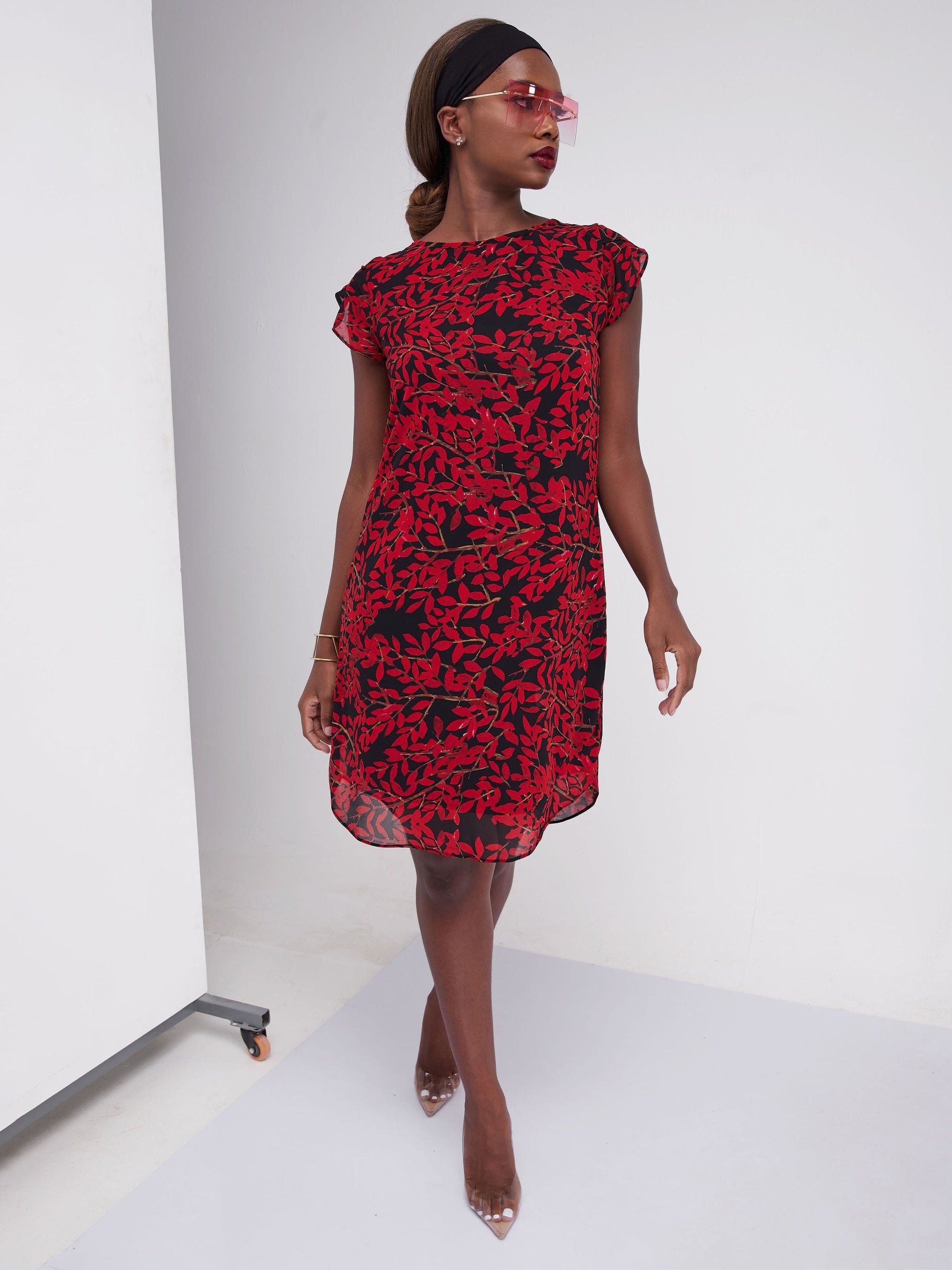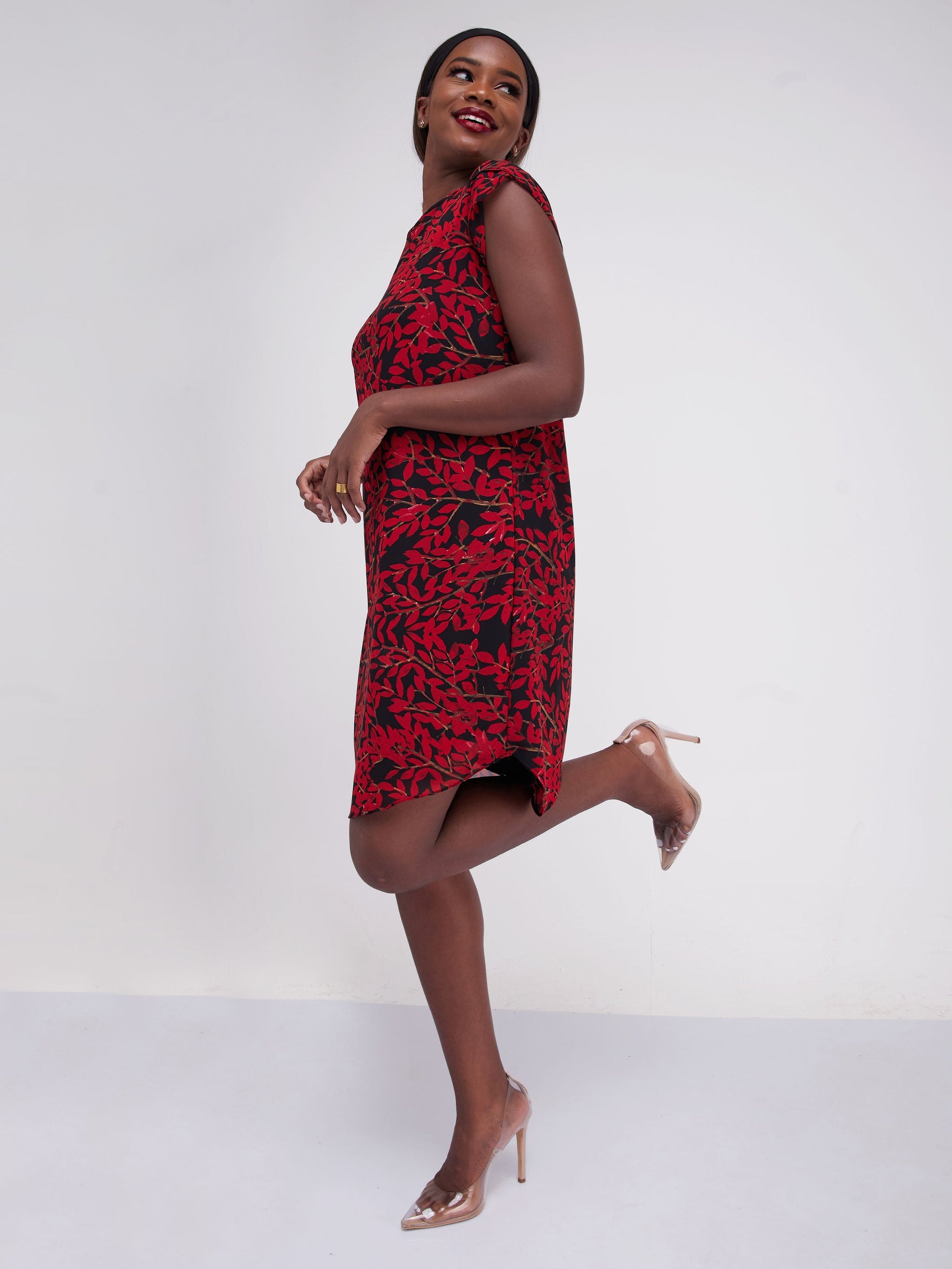 Vivo Lalea Cap Sleeve Shift Dress - Red Leaf Print