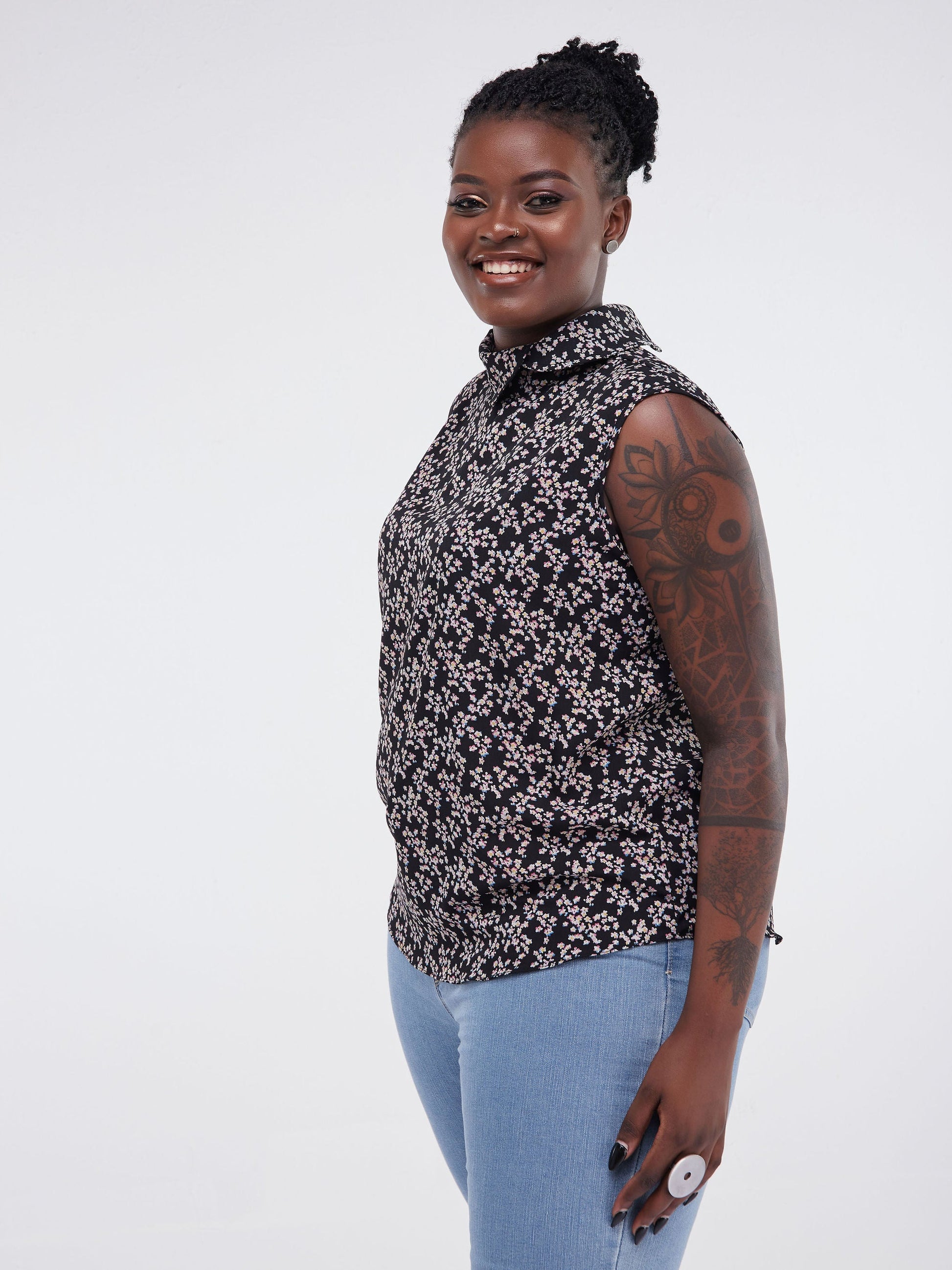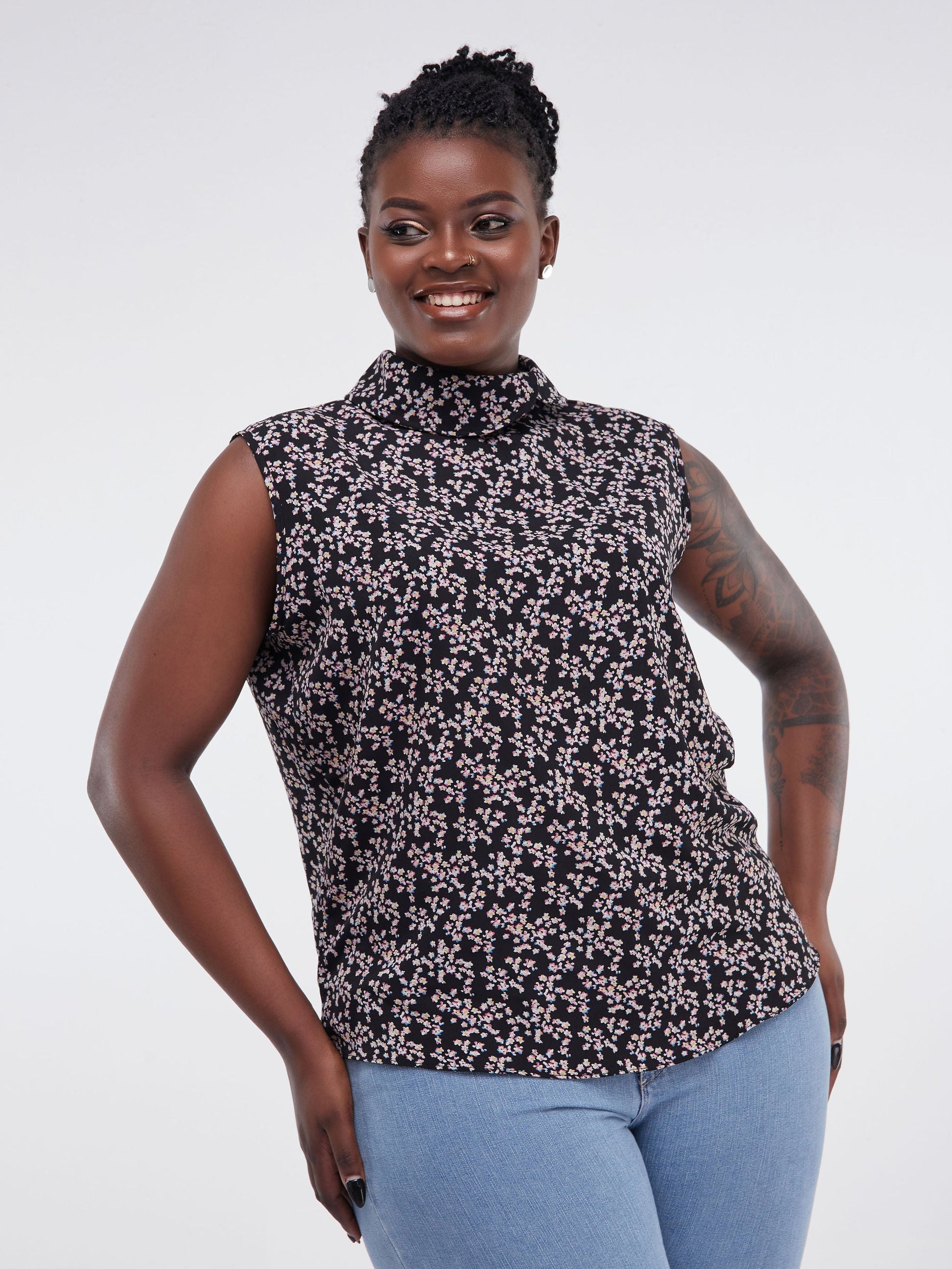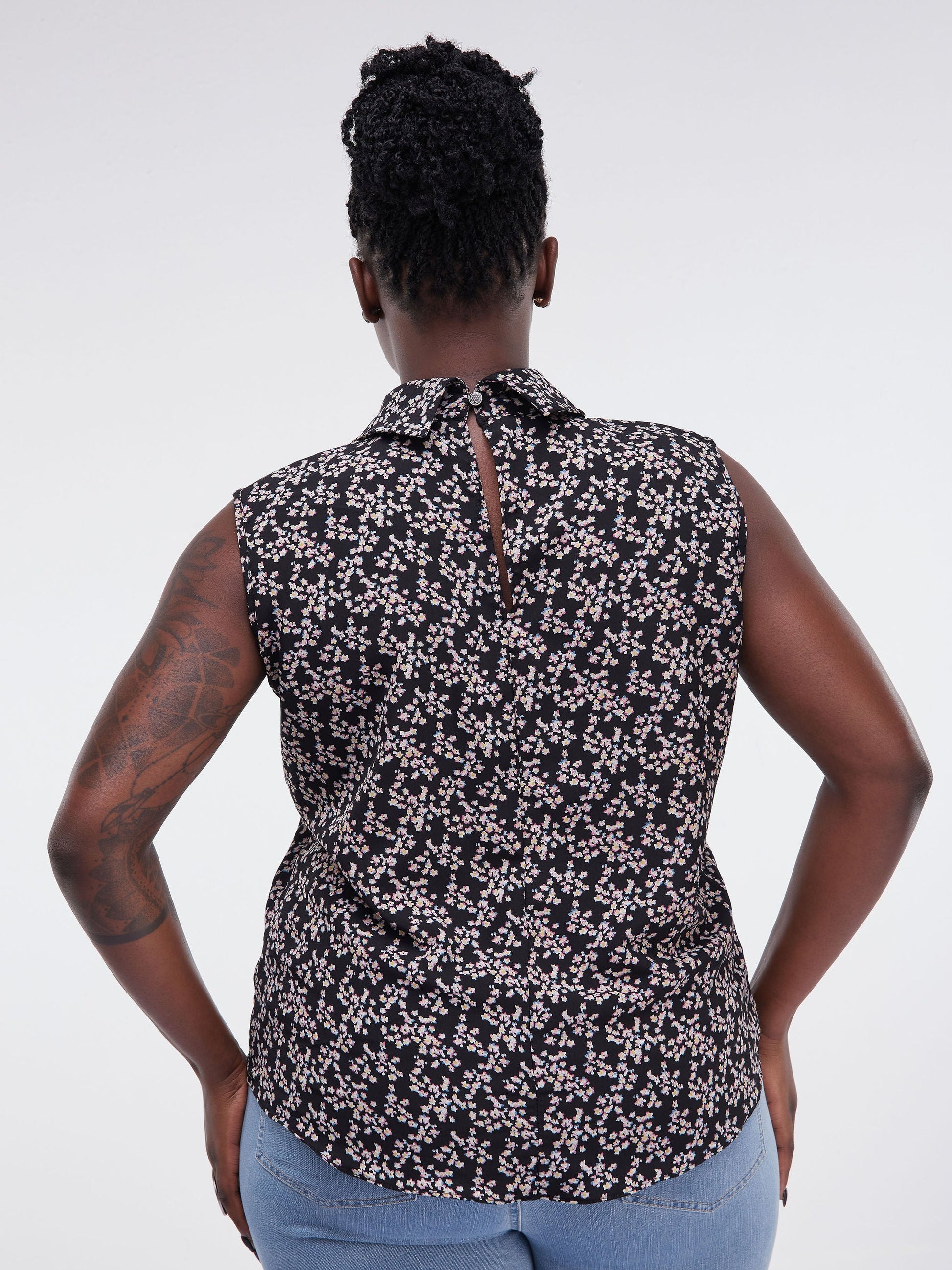 Vivo Lalea Sleeveless Tulip Collar Top - Black Print