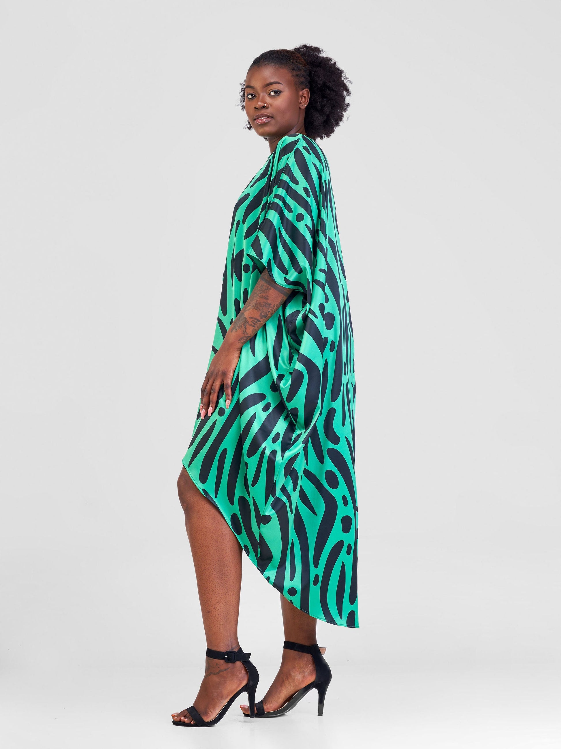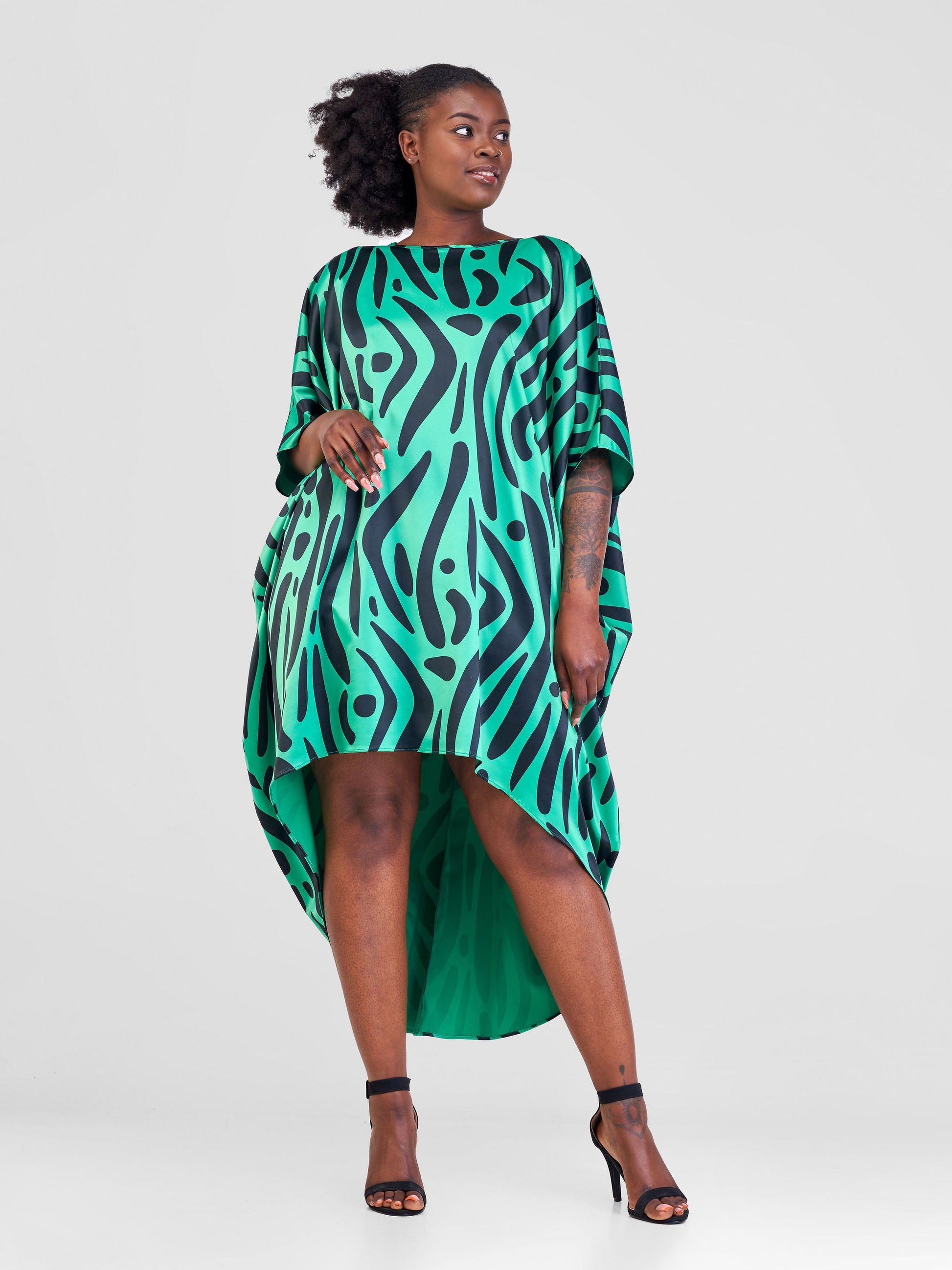 Vivo Lani Satin High Low Dress - Green / Black Print