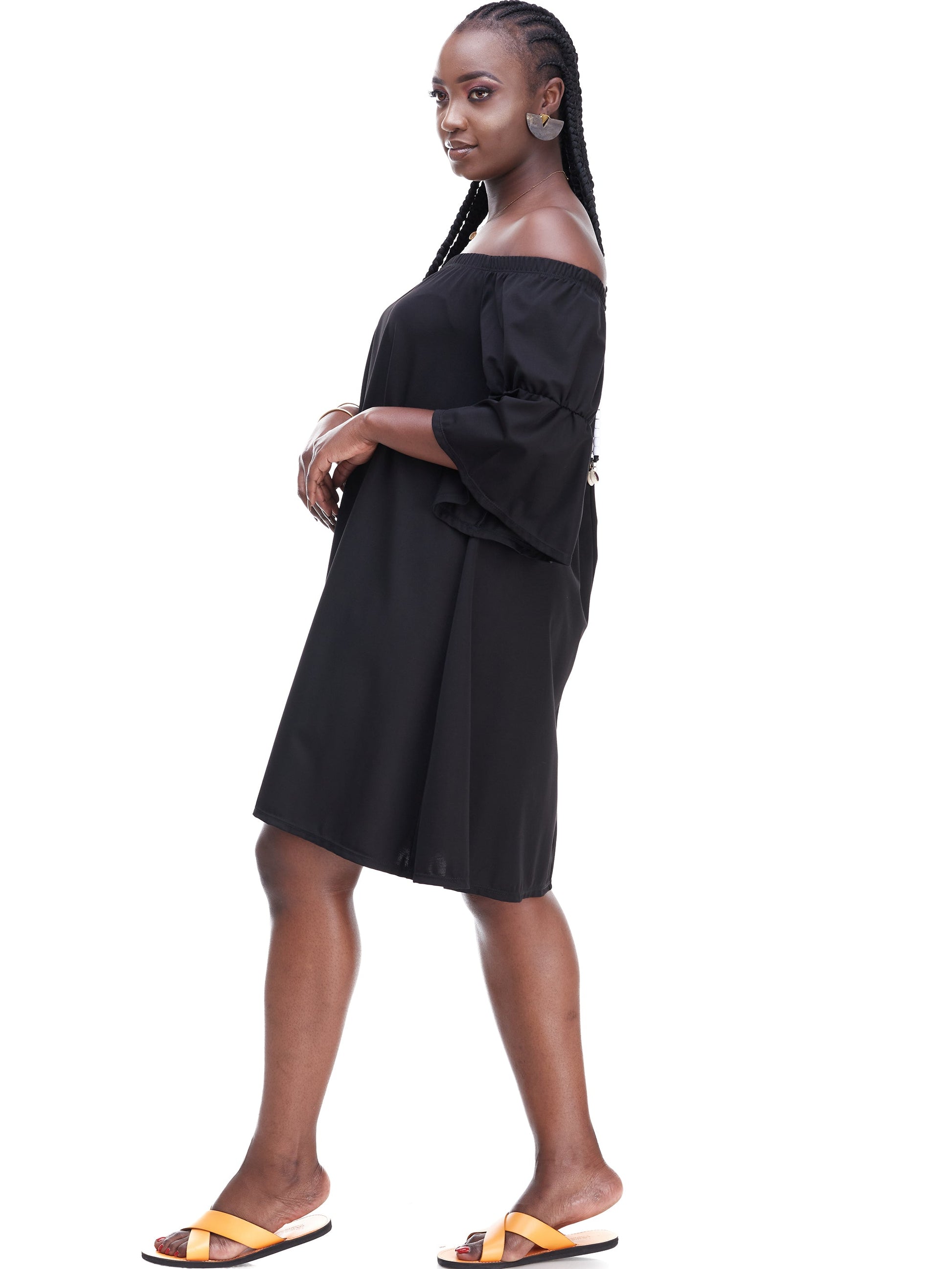 Nothing spells elegance better than a black, flirty, off-shoulder dress. Switch your basic Little Black Dress for this flowy, knee-length dress with the perfect wide 3/4 sleeves. Wear it to your weekend parties, wedding events, intimate brunch picnics with the girls or a dinner date with your favorite person. The options are endless!