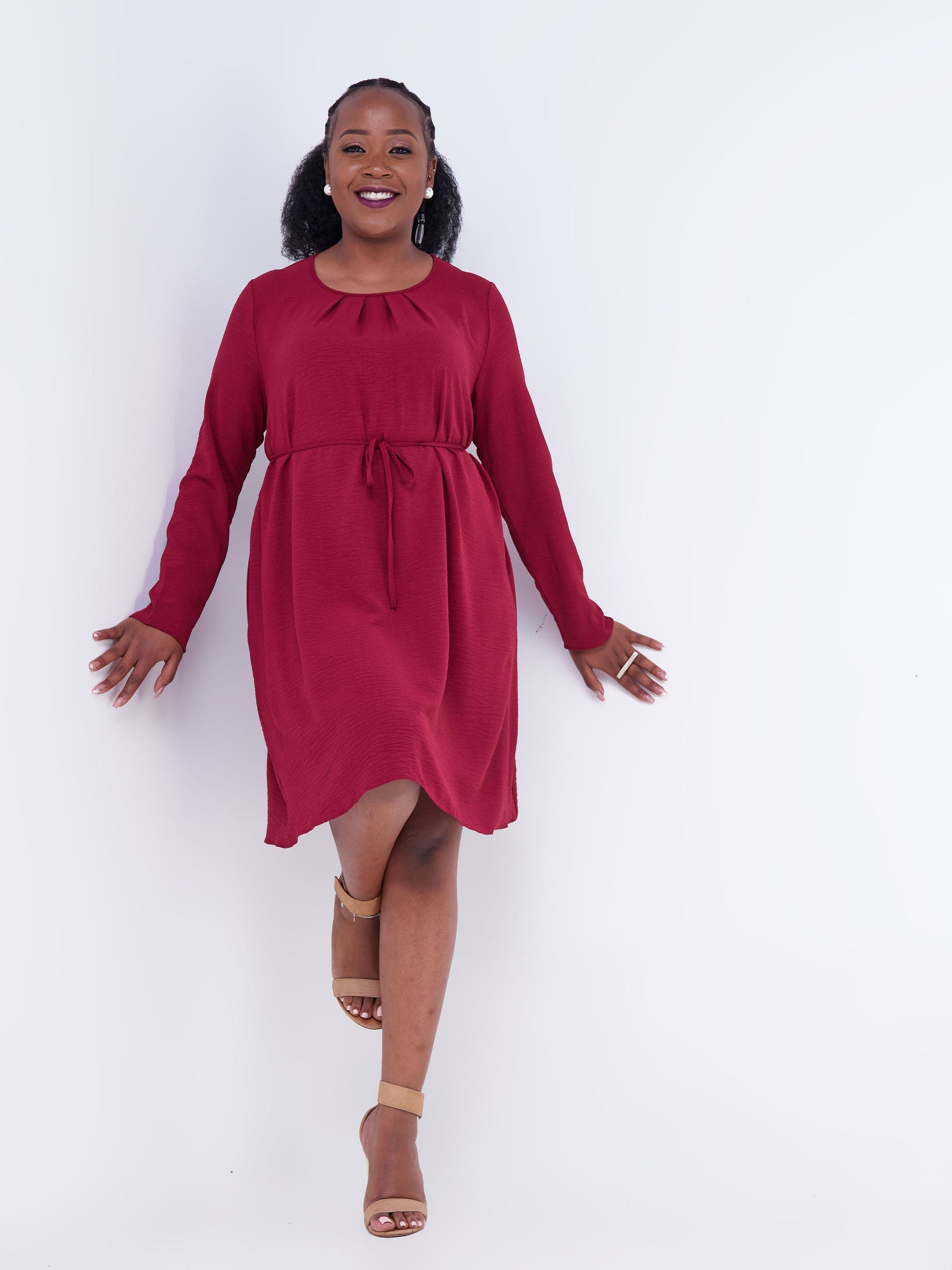 Vivo Tunu Long Sleeve Front Pleat Knee Length Dress - Maroon