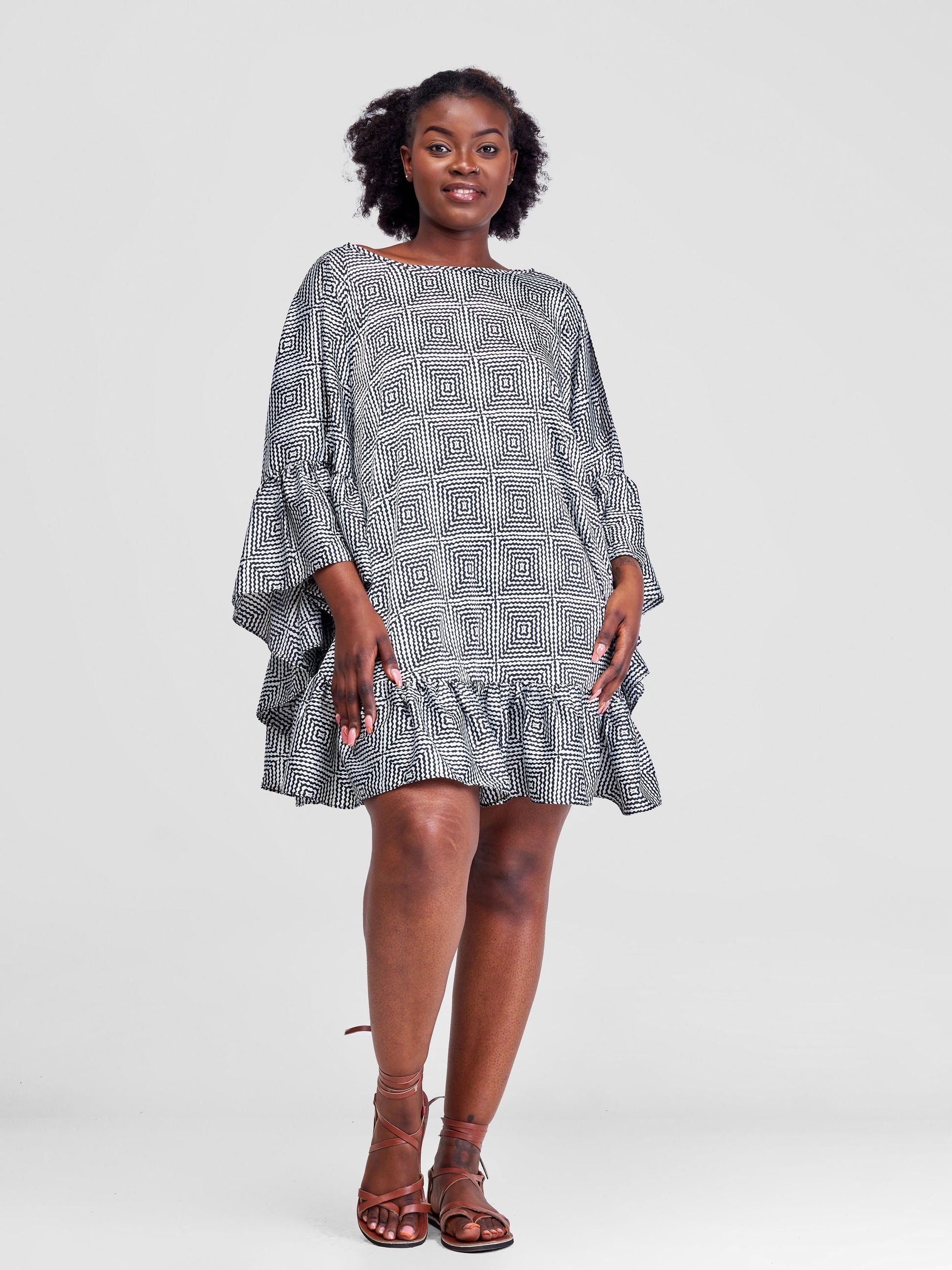 Vivo Malindi Tunic Dress With Frills - Black / White Abstract Print