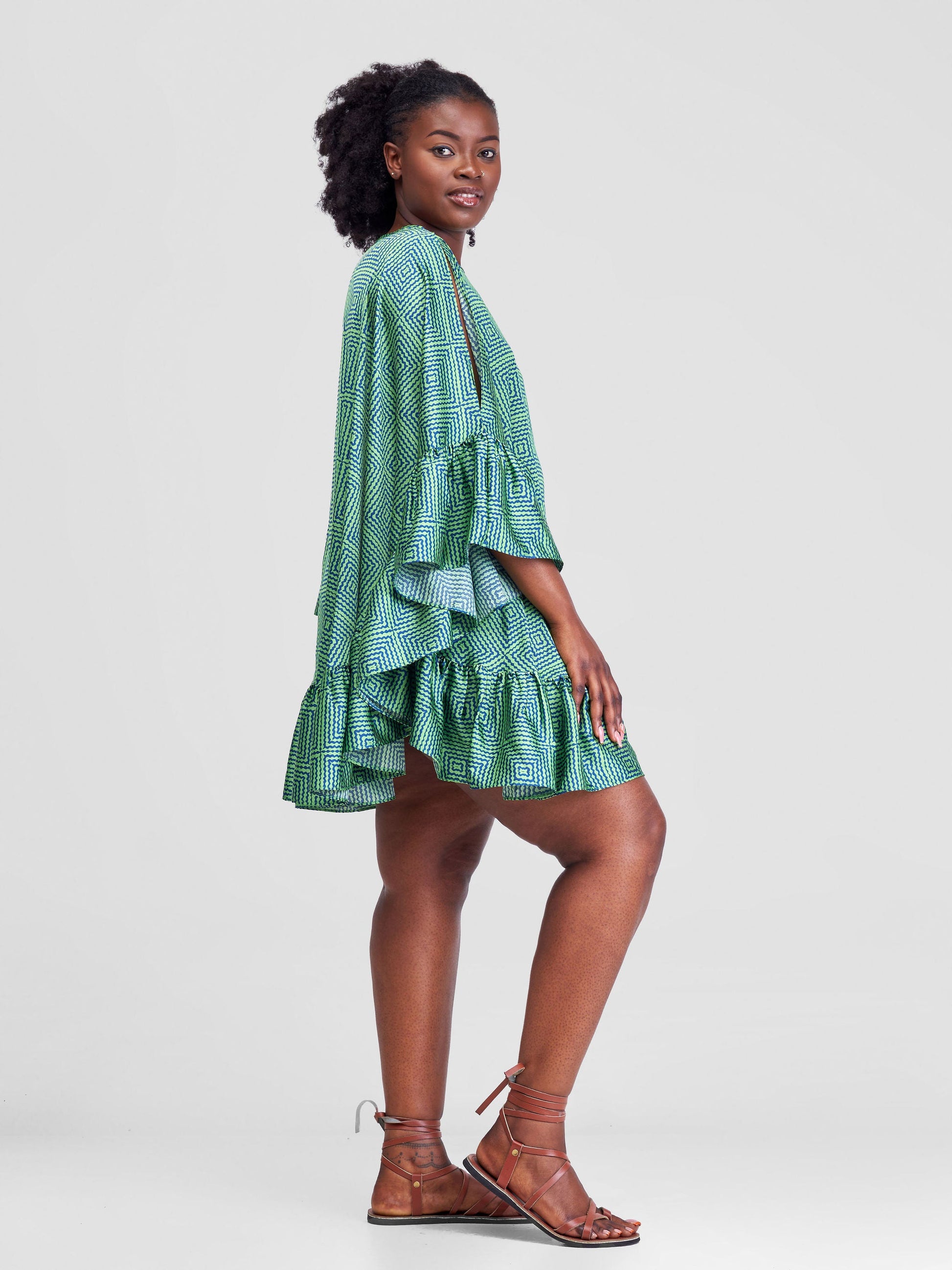 Vivo Malindi Tunic Dress With Frills - Green / Blue Abstract Print