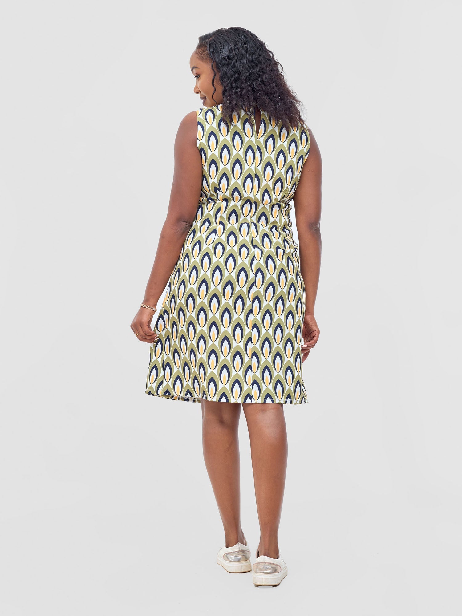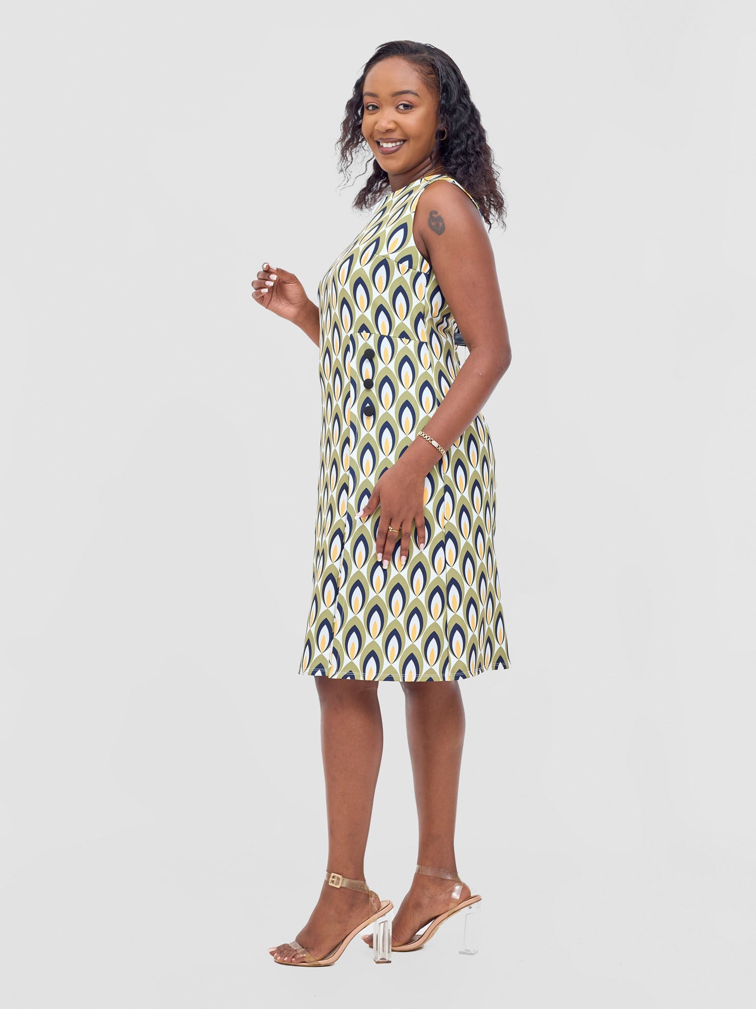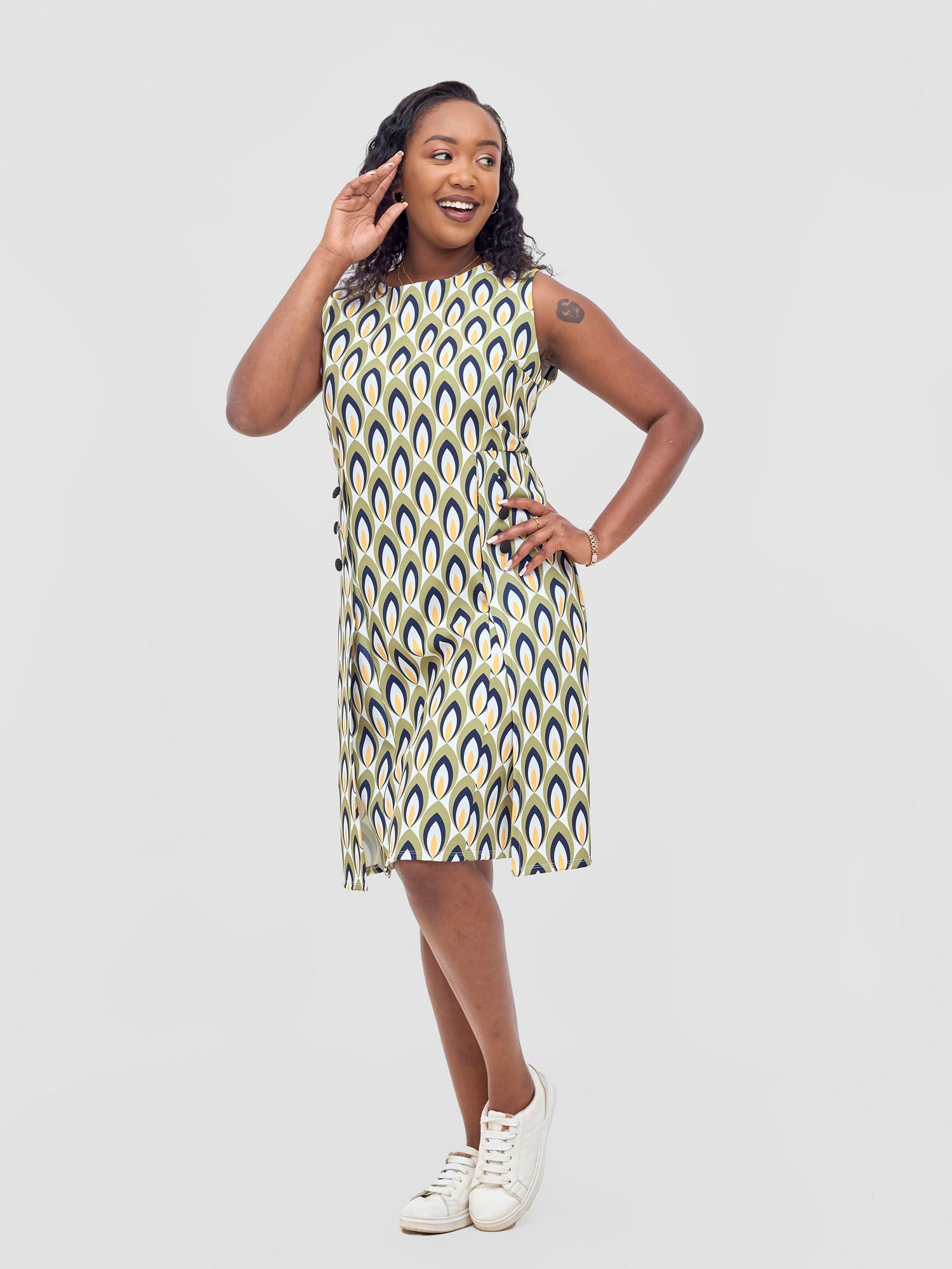 Vivo Mandla Side Flap A-Line Dress - Green / Mustard Manla Print