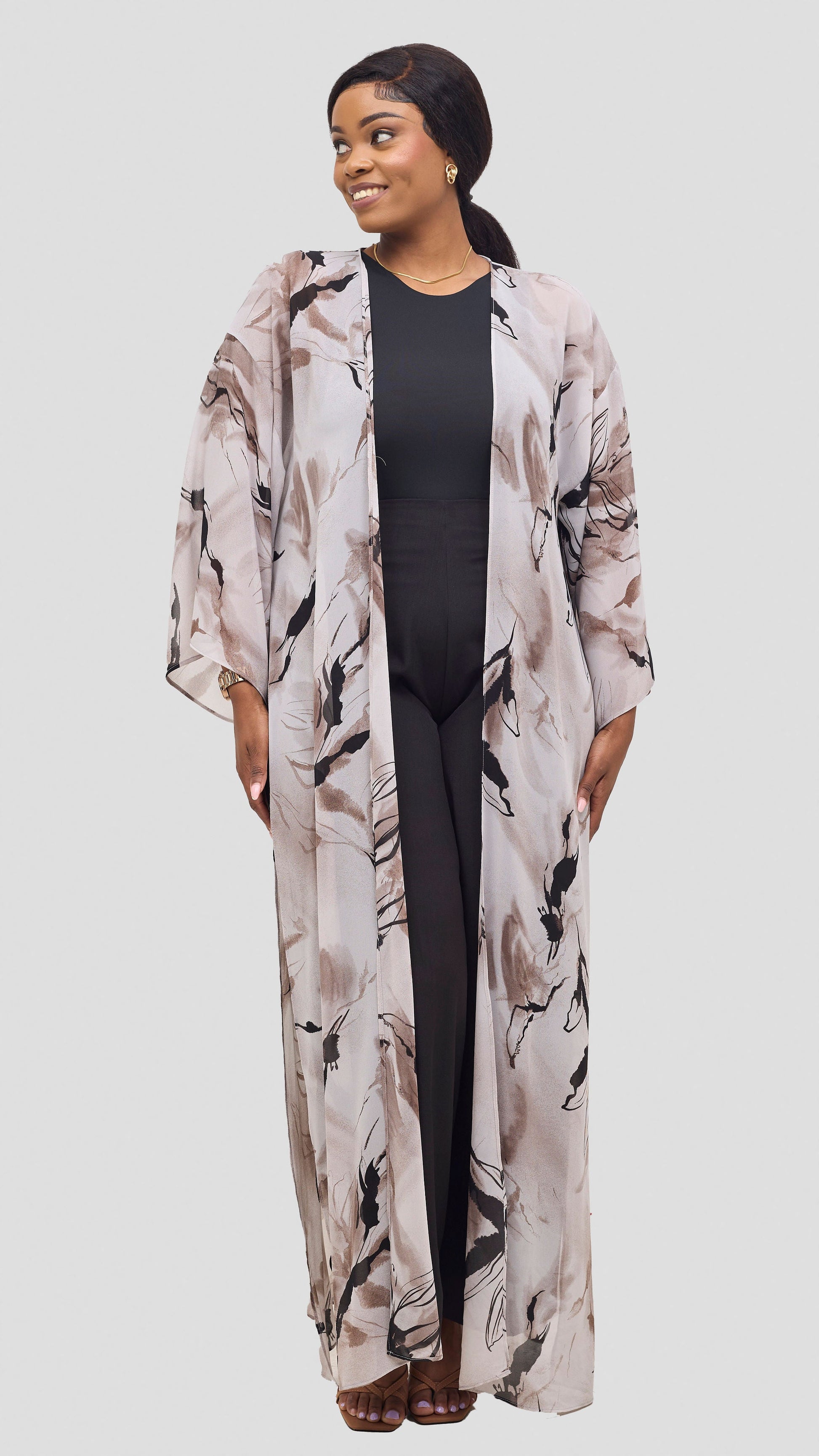 The Vivo Nandi High Slit Kimono in Light Taupe with Black print offers a perfect blend of elegance and boldness. Its flowing fabric and high slit design ensure both comfort and a striking look, effortlessly enhancing your outfit for any occasion. With its sophisticated color palette, this kimono is ideal for making a stylish statement with ease and confidence.