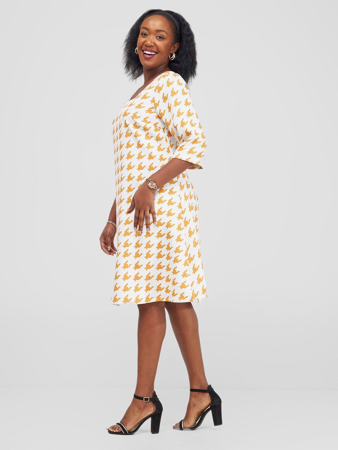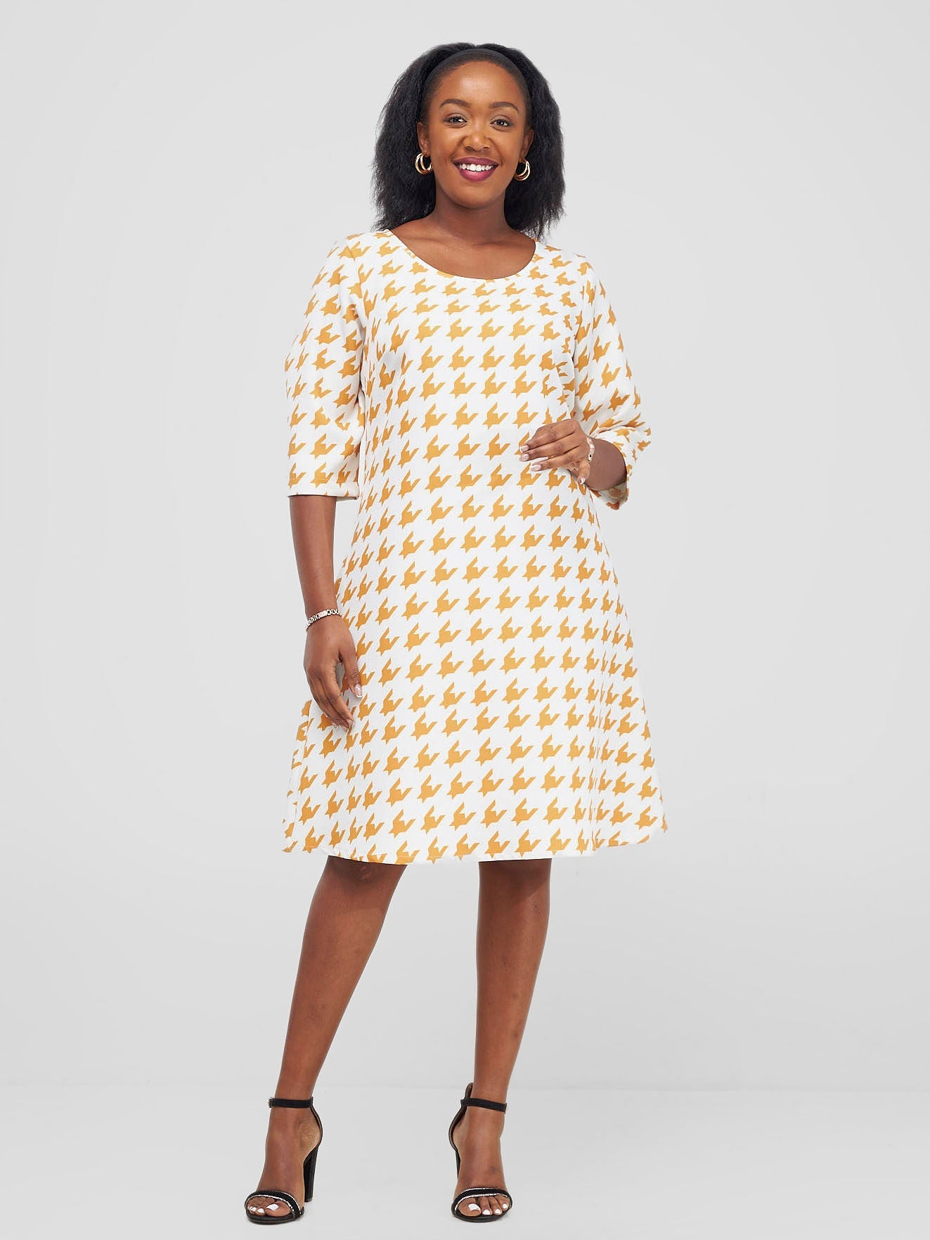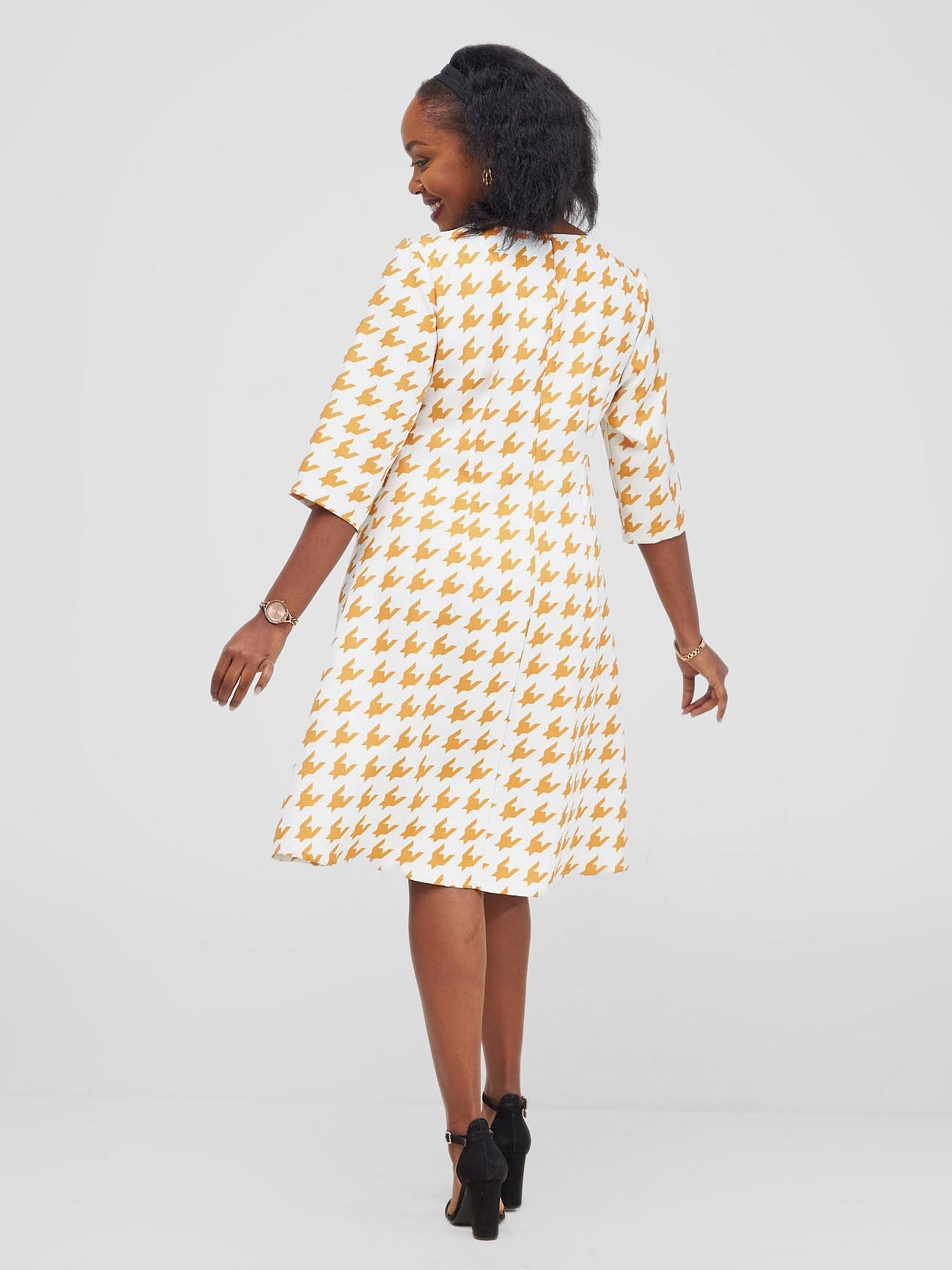 Vivo Pendo 3/4 Sleeve A Line Dress - White / Mustard Houndstooth Print