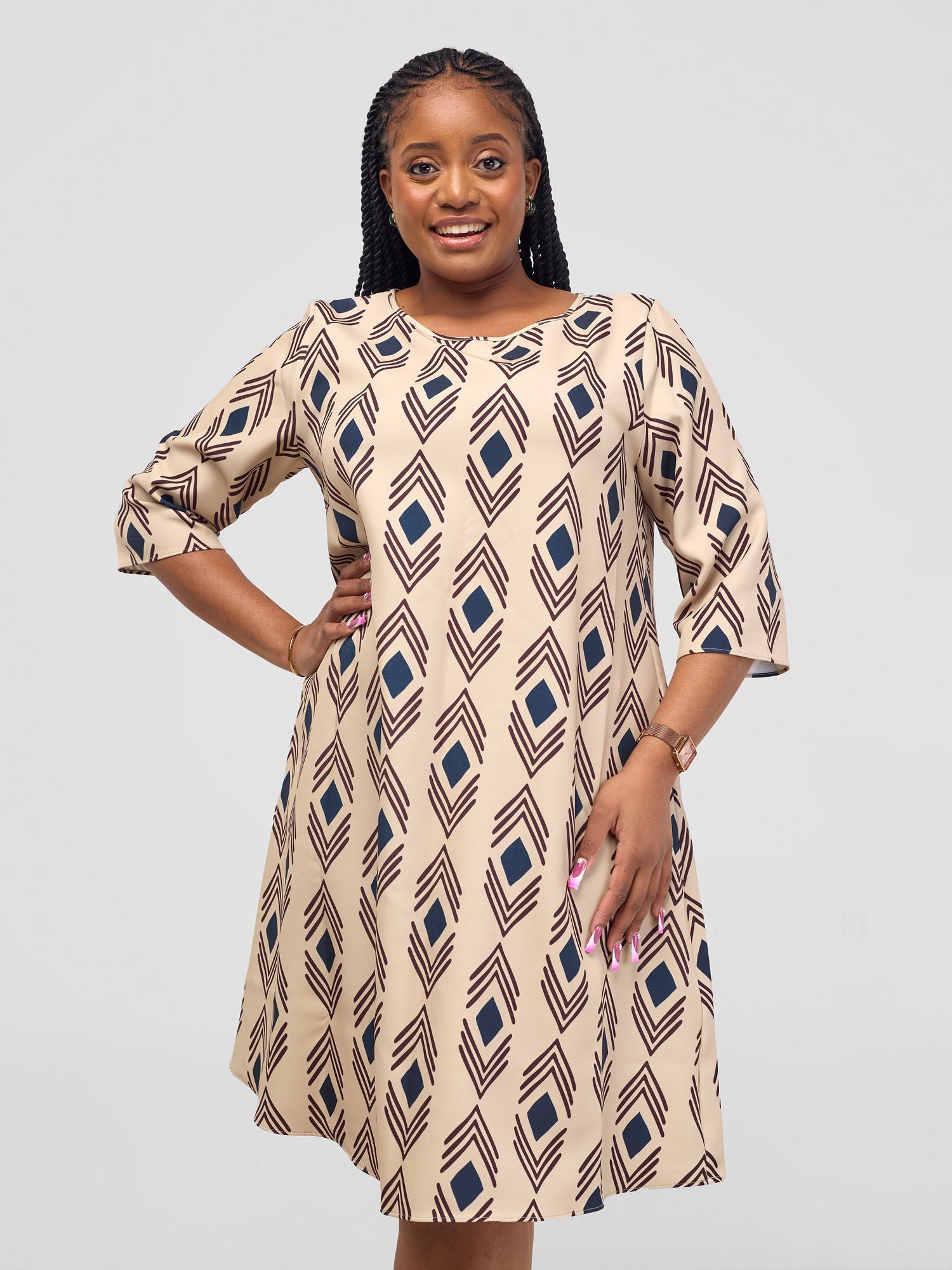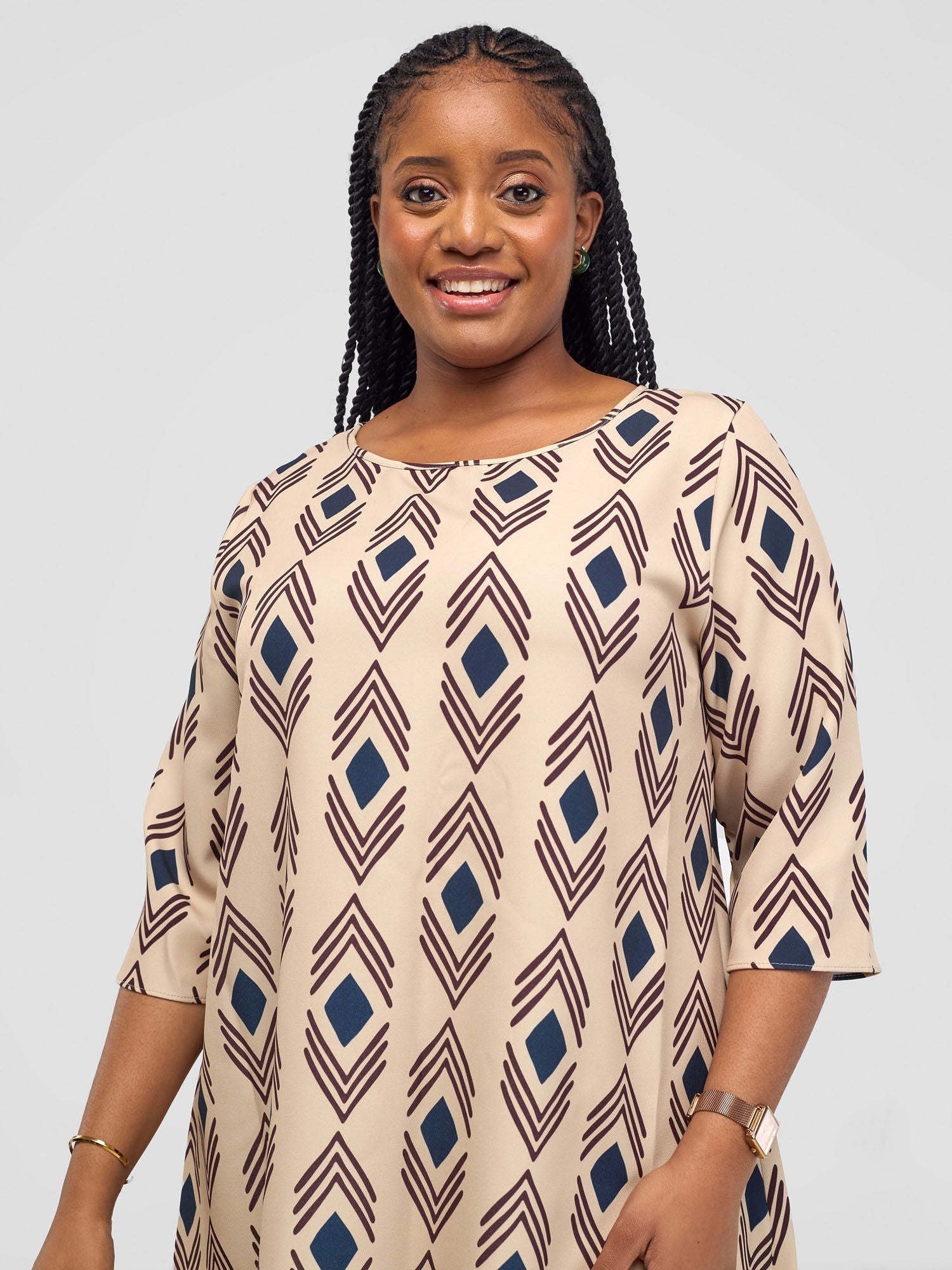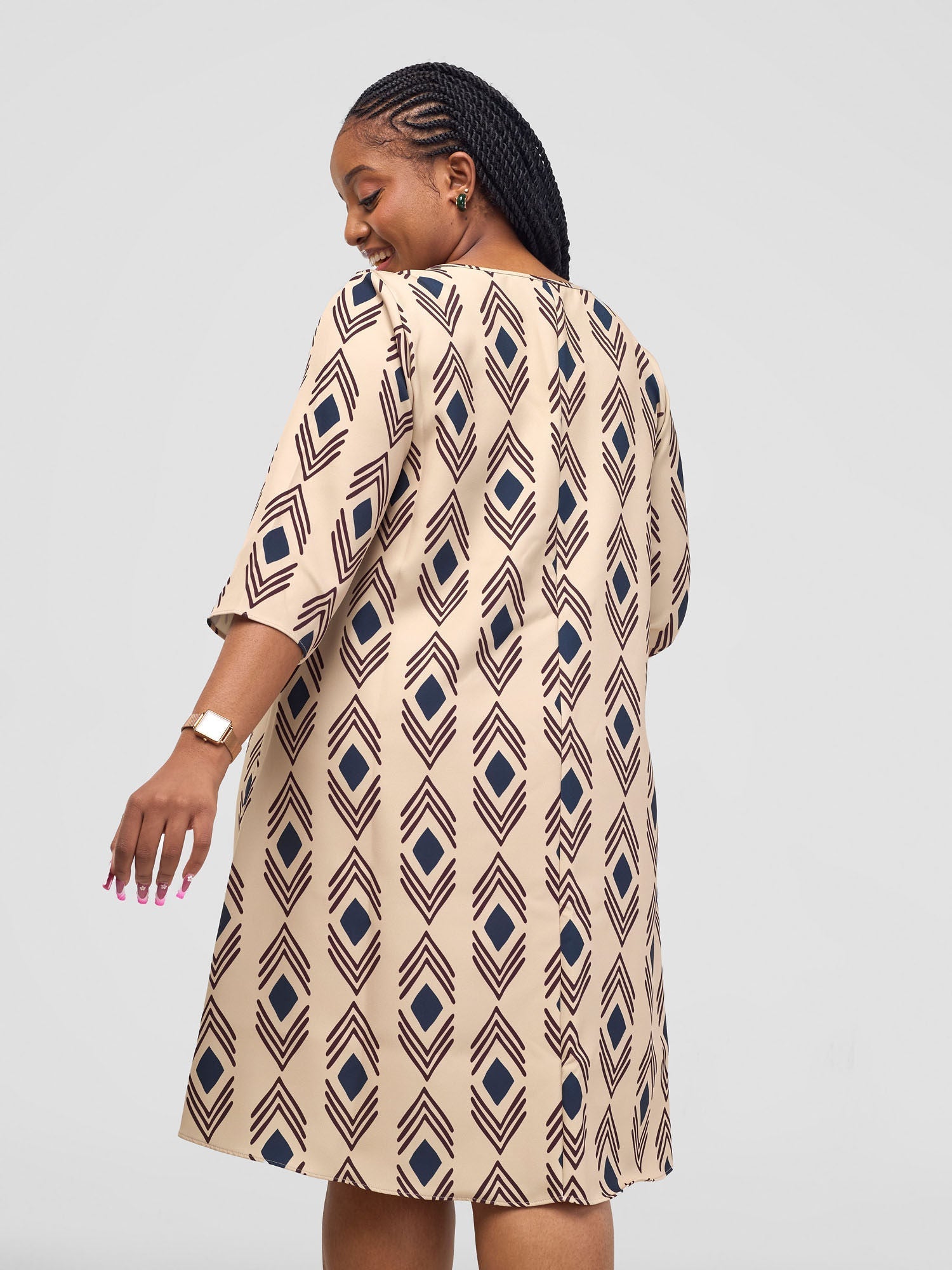 Vivo Pendo 3/4 Sleeve Knee Length Tent Dress - Taupe / Black Shale Print