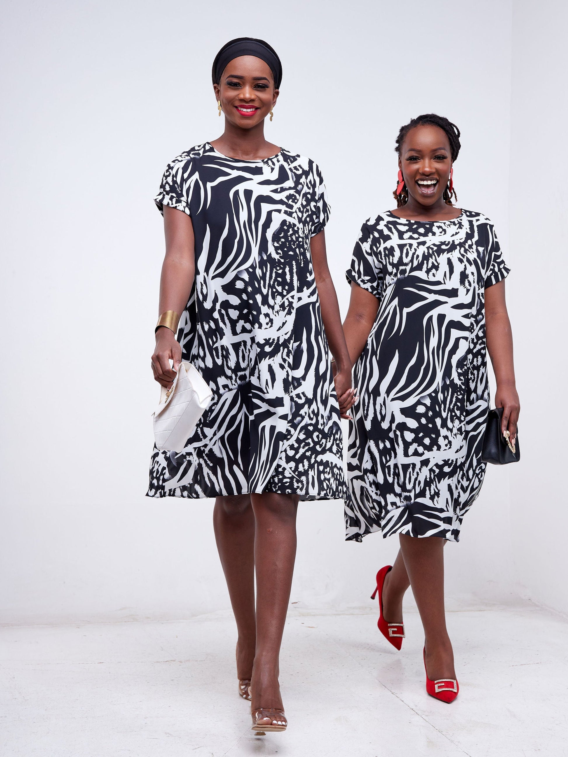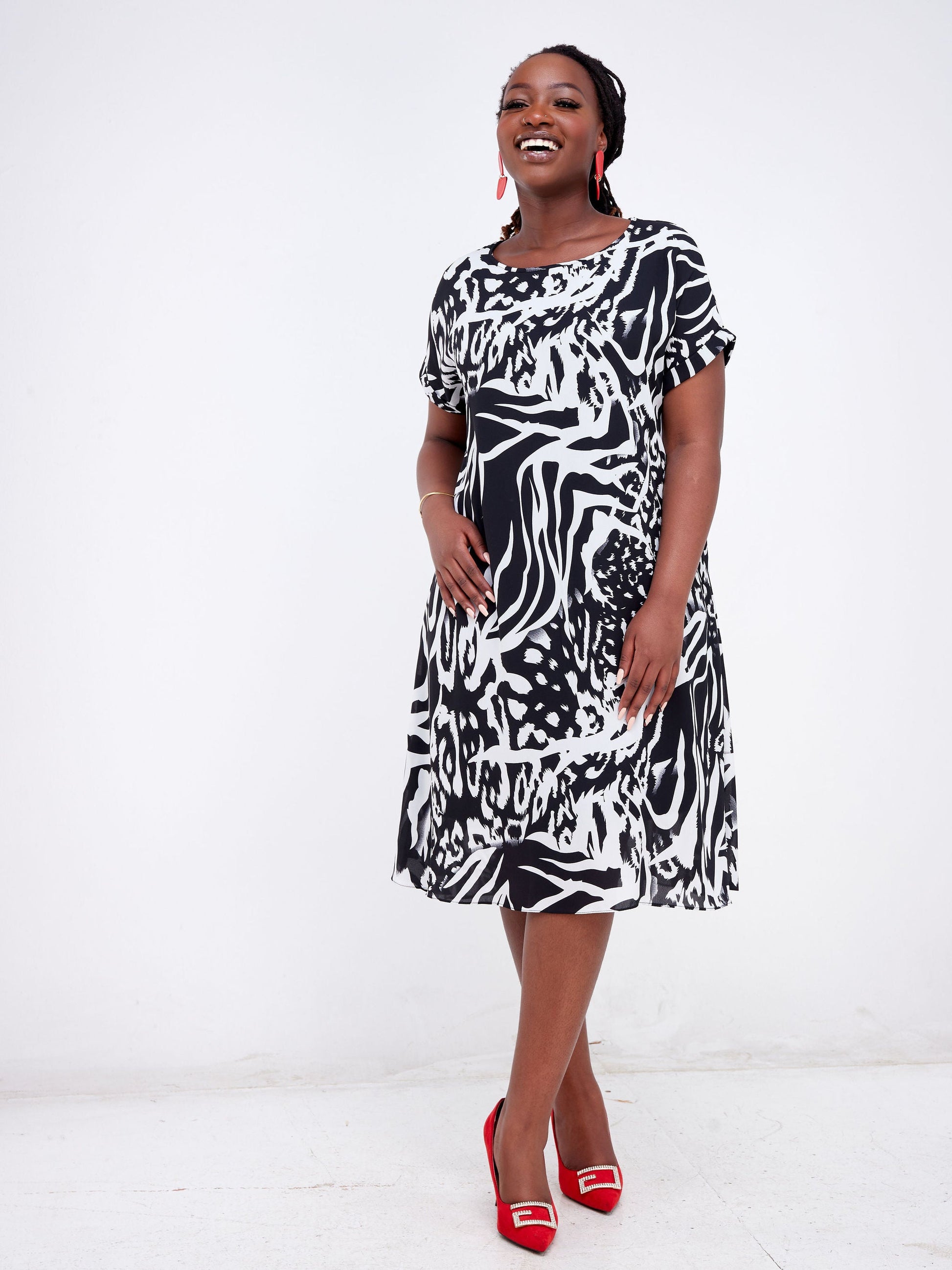 Vivo Pesi Drop Shoulder Tent Dress - Black / White Animal Print