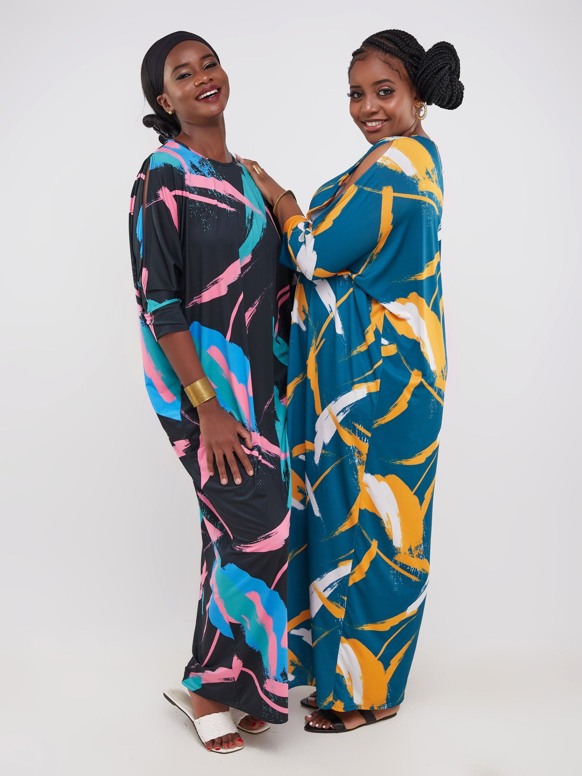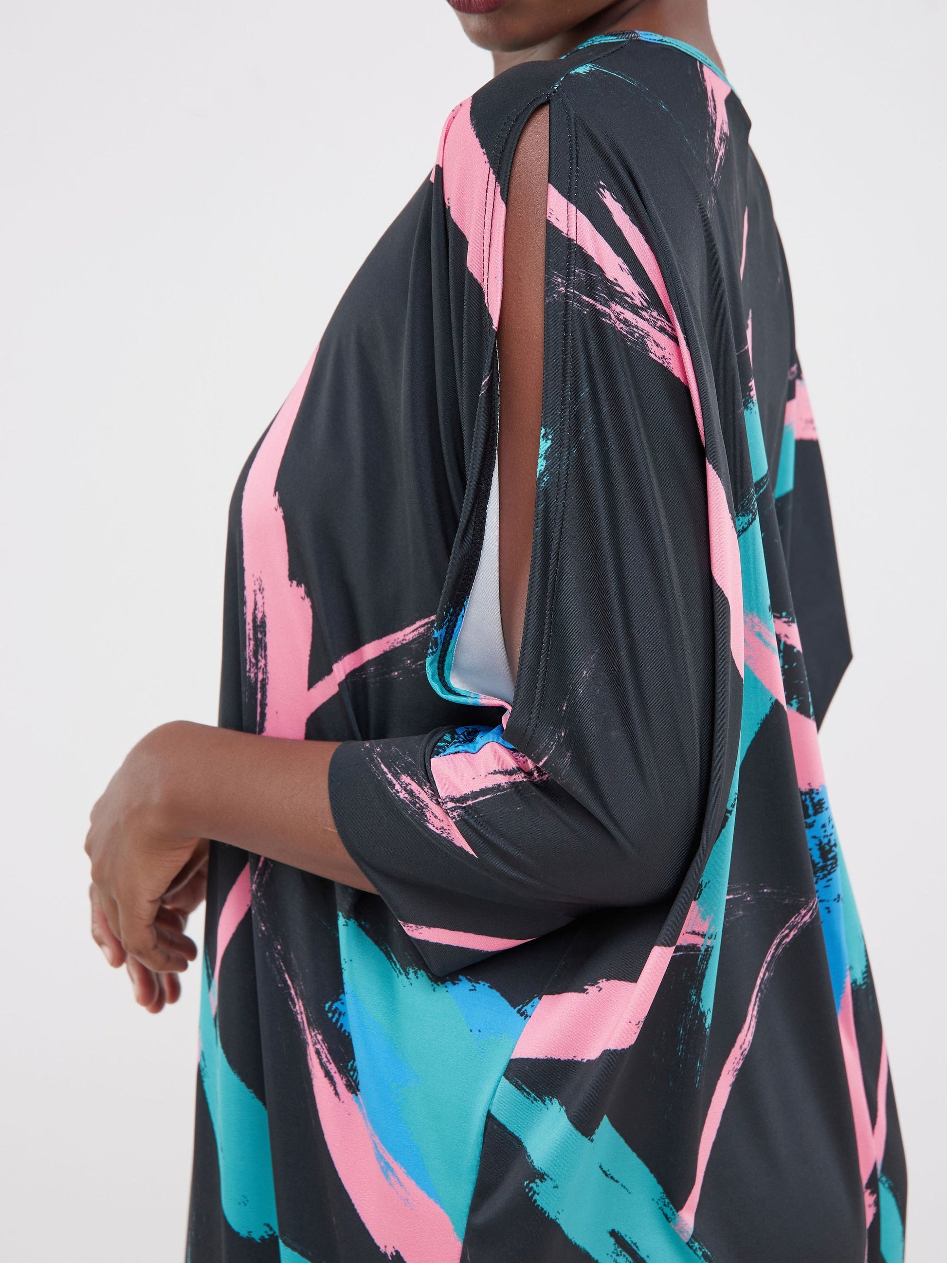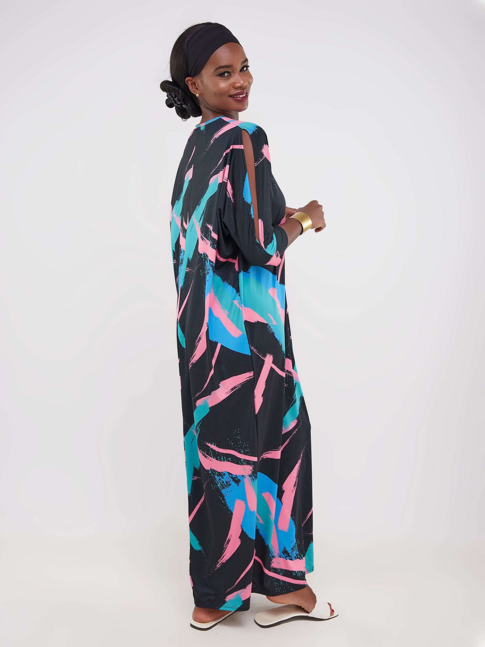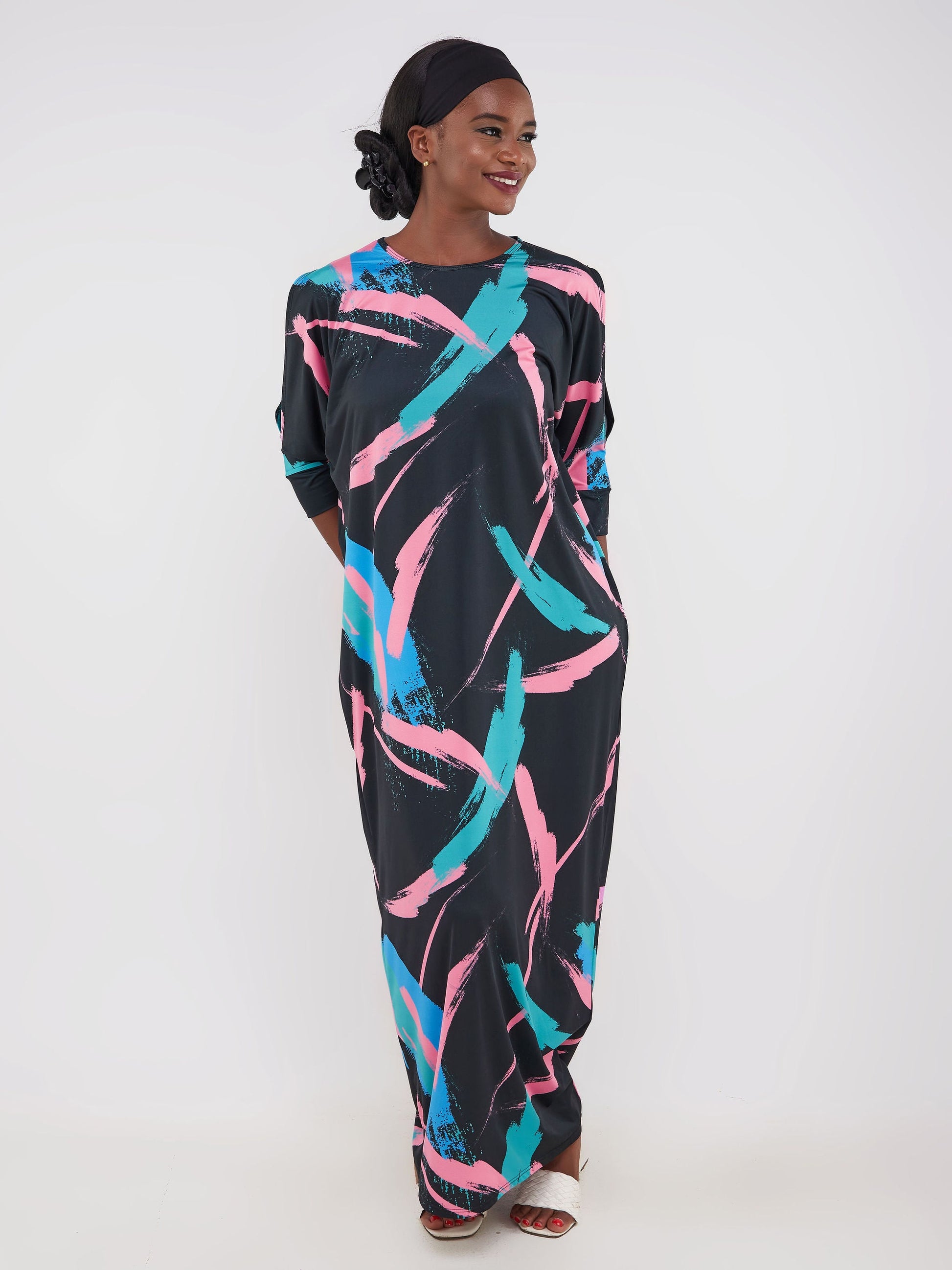 Vivo Ruwa Cold Shoulder Dolman Maxi Dress - Black / Pink Abstract Print
