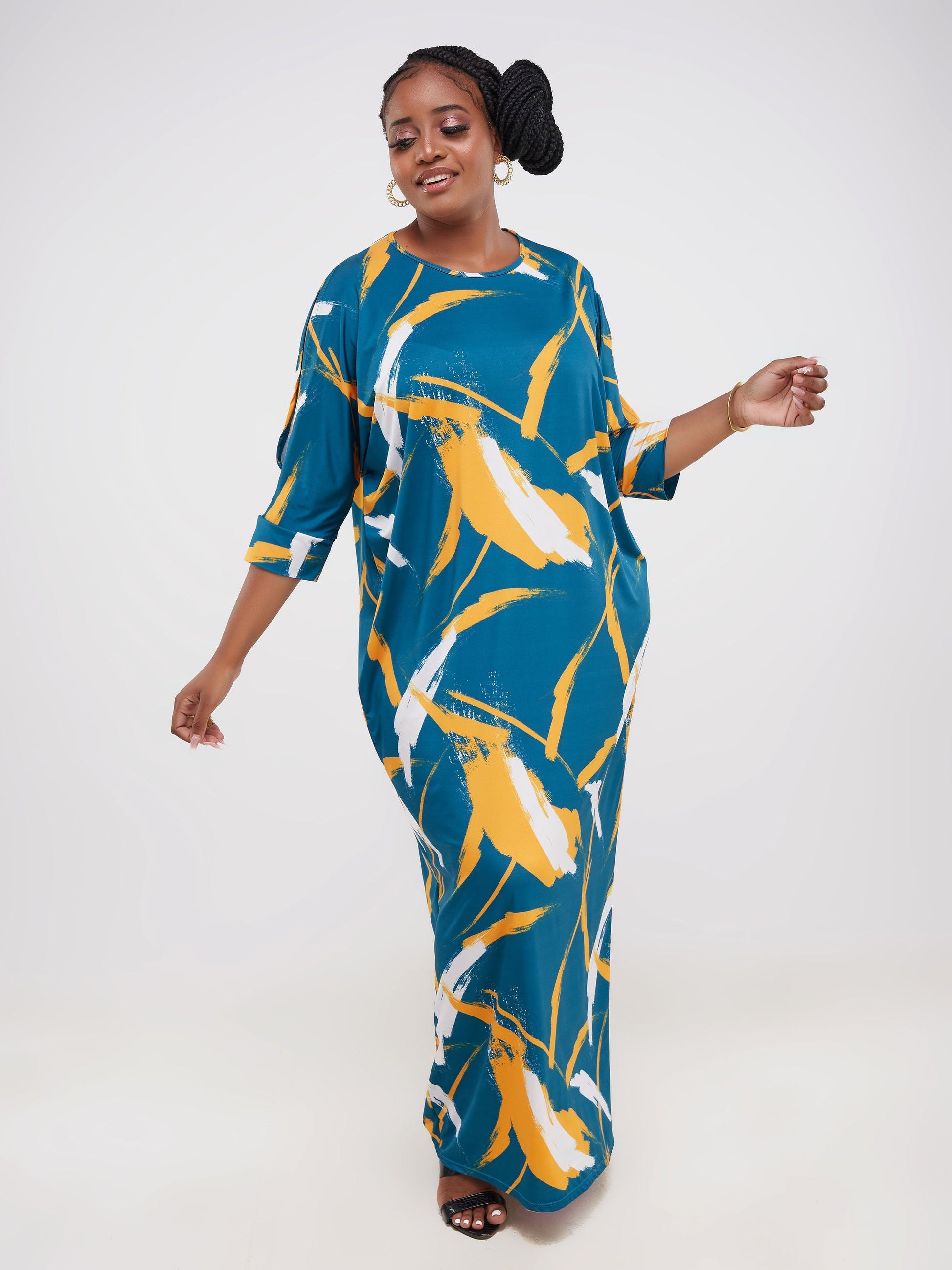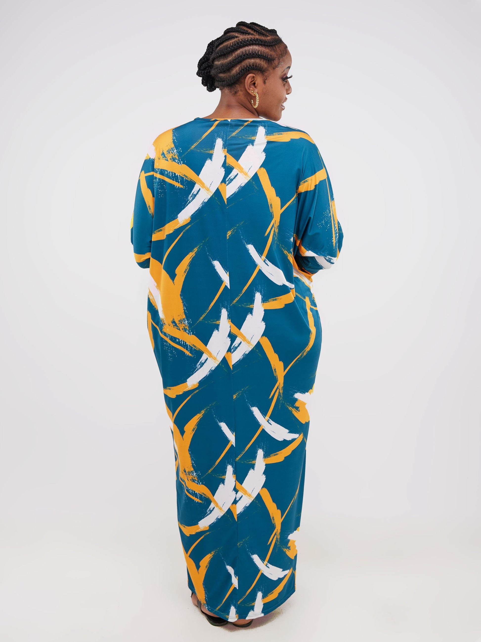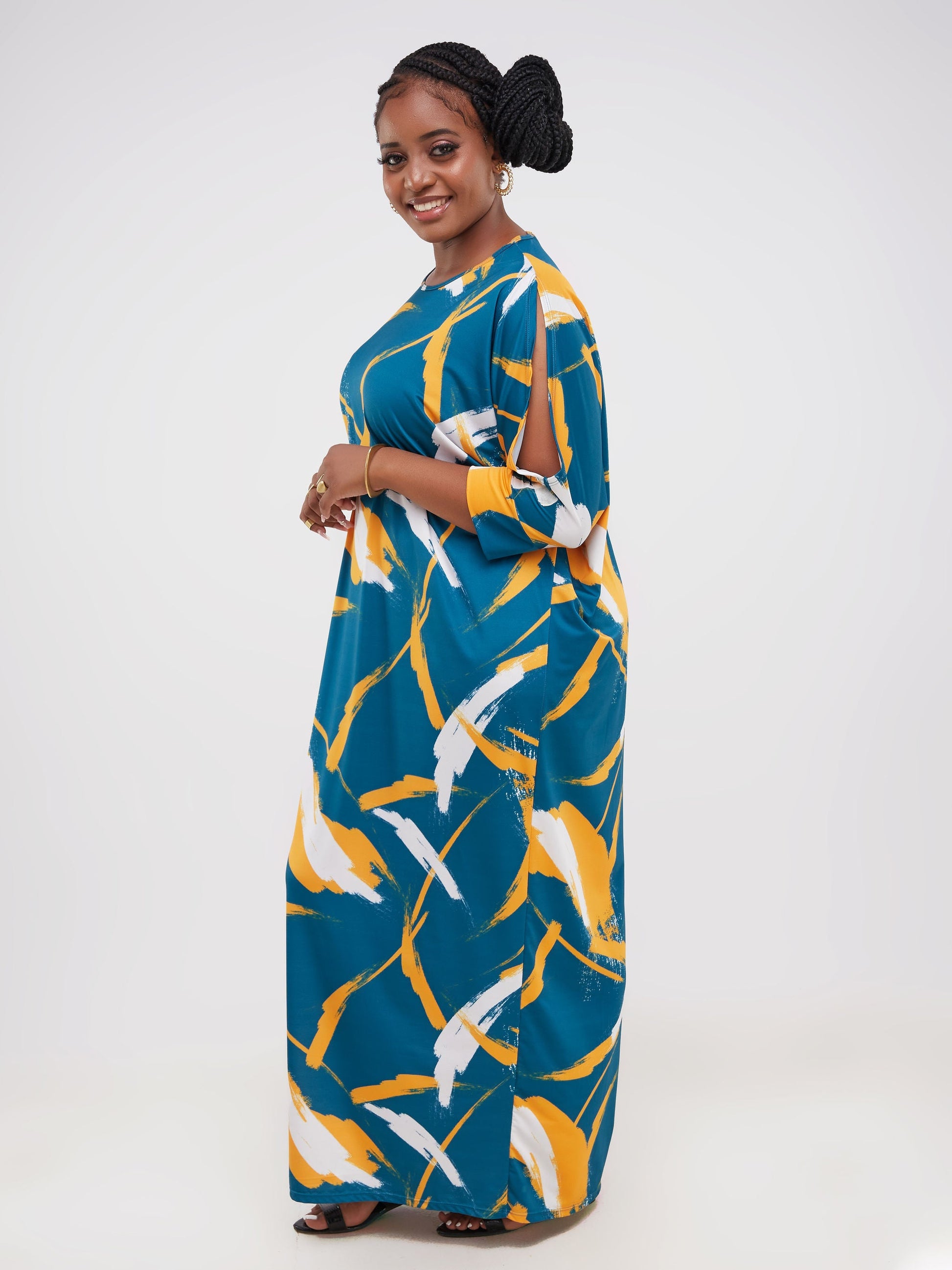 Vivo Ruwa Cold Shoulder Dolman Maxi Dress - Teal / Yellow Abstract Print