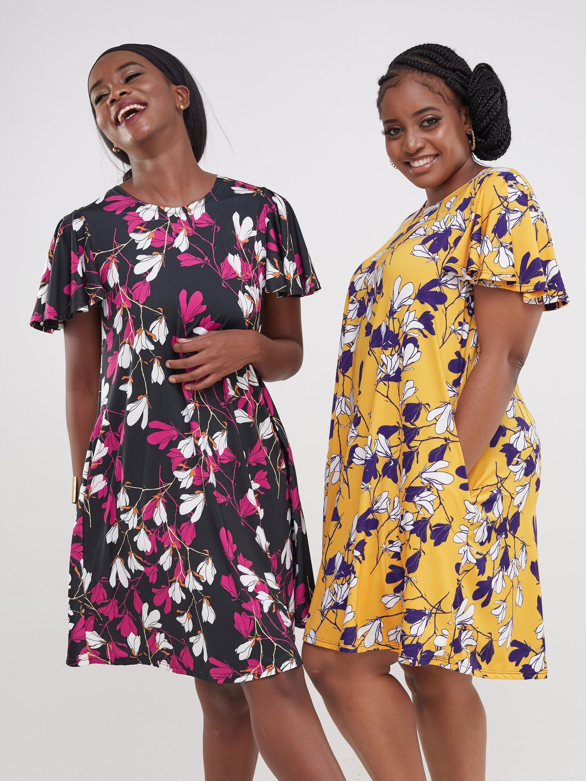 Vivo Ruwa Flounce Sleeve Knee Length Tent Dress - Yellow / Purple Flowers Print