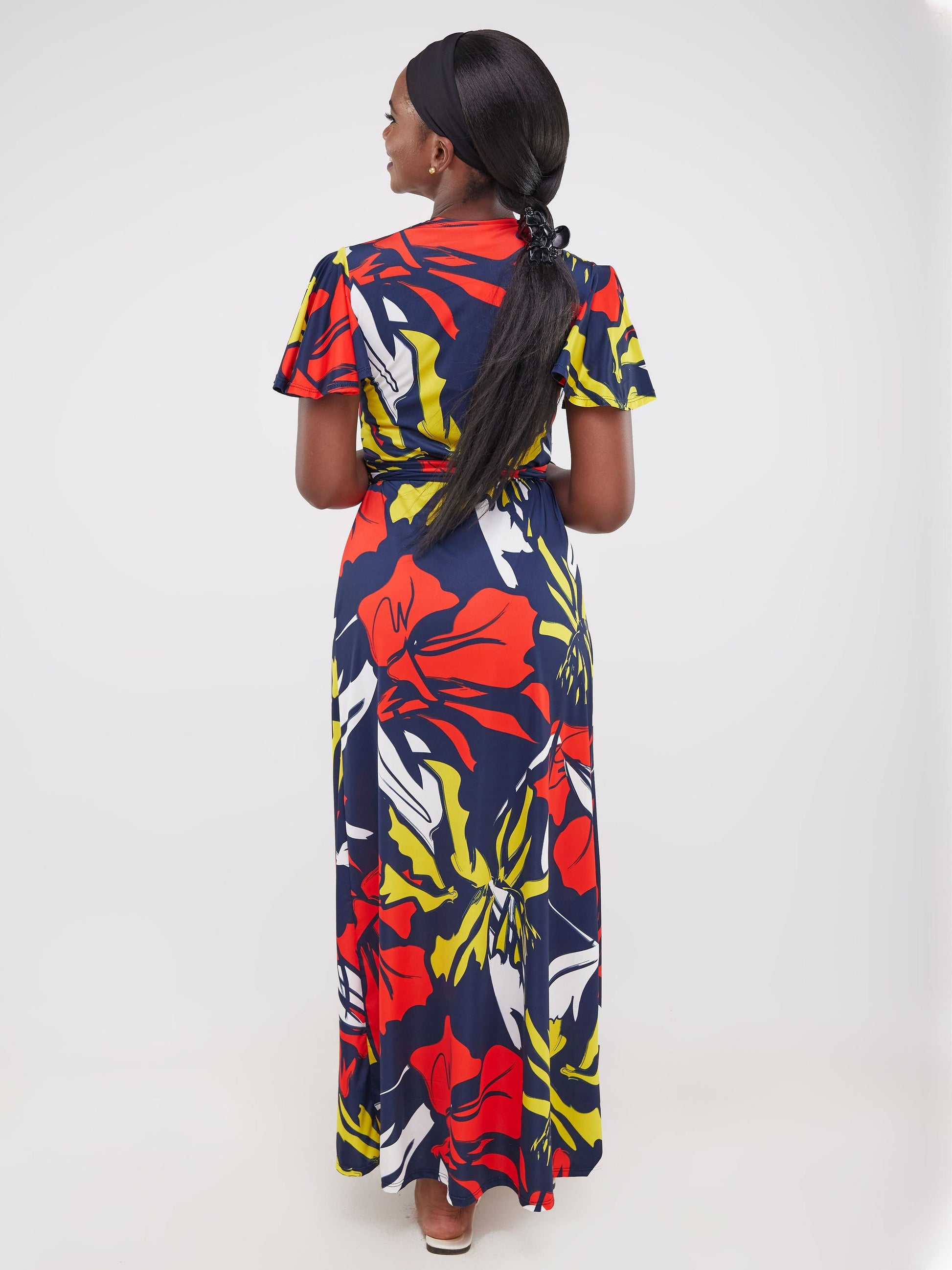 Vivo Ruwa Flounce Sleeve Wrap Maxi Dress - Navy / Orange Print