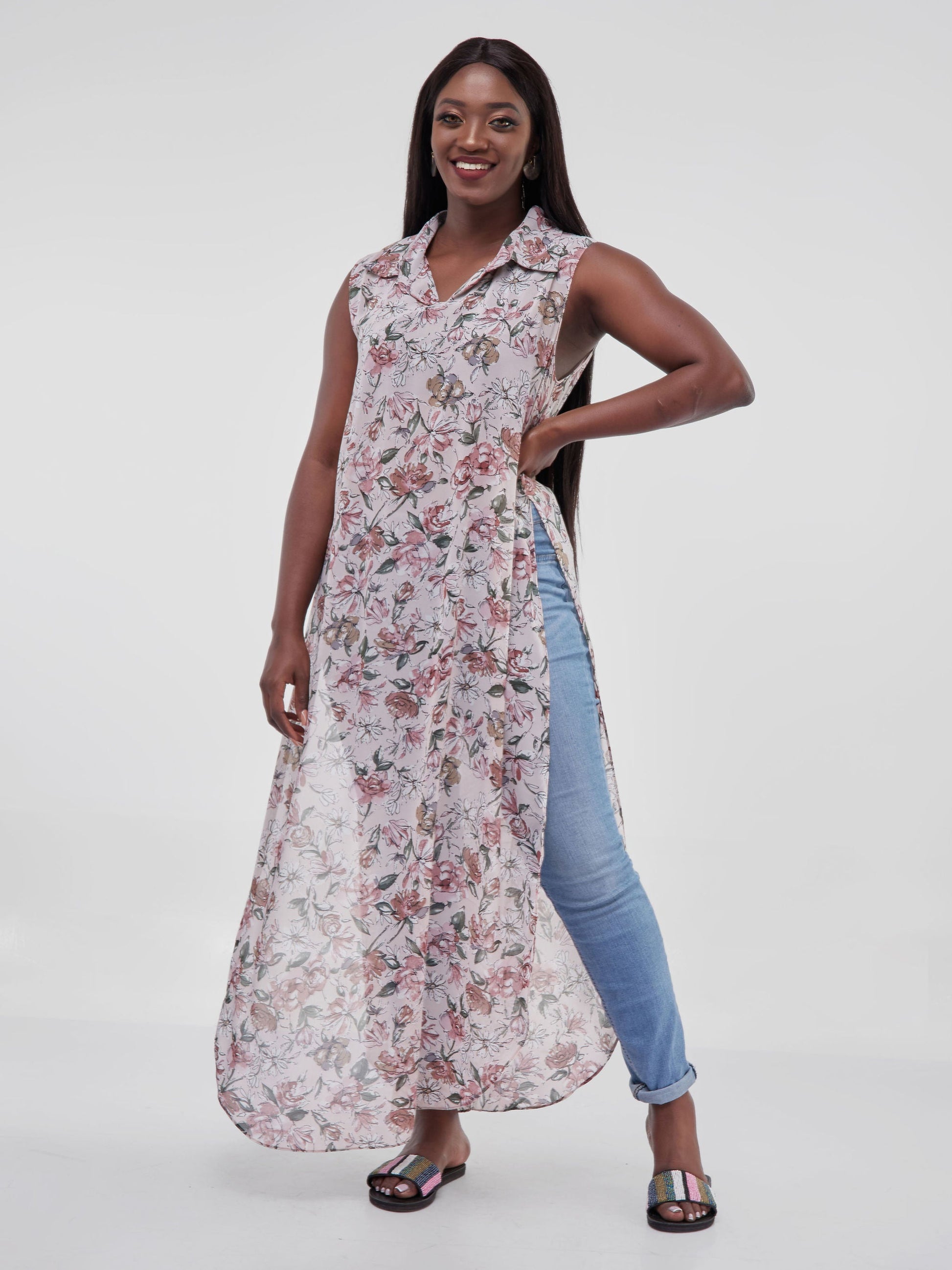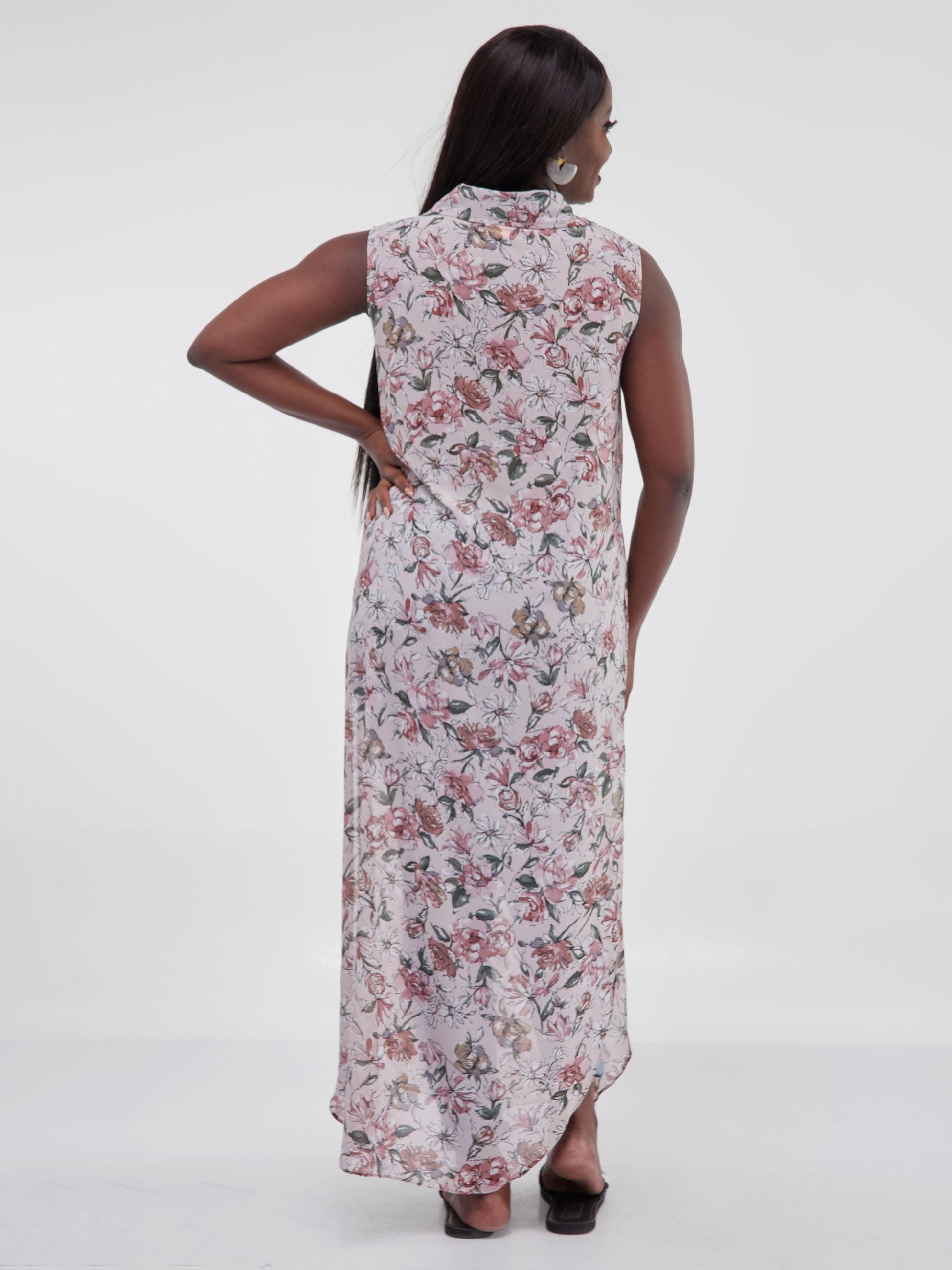 Vivo Sana Chiffon Maxi Side Slit Top - Pink / Maroon Floral Print