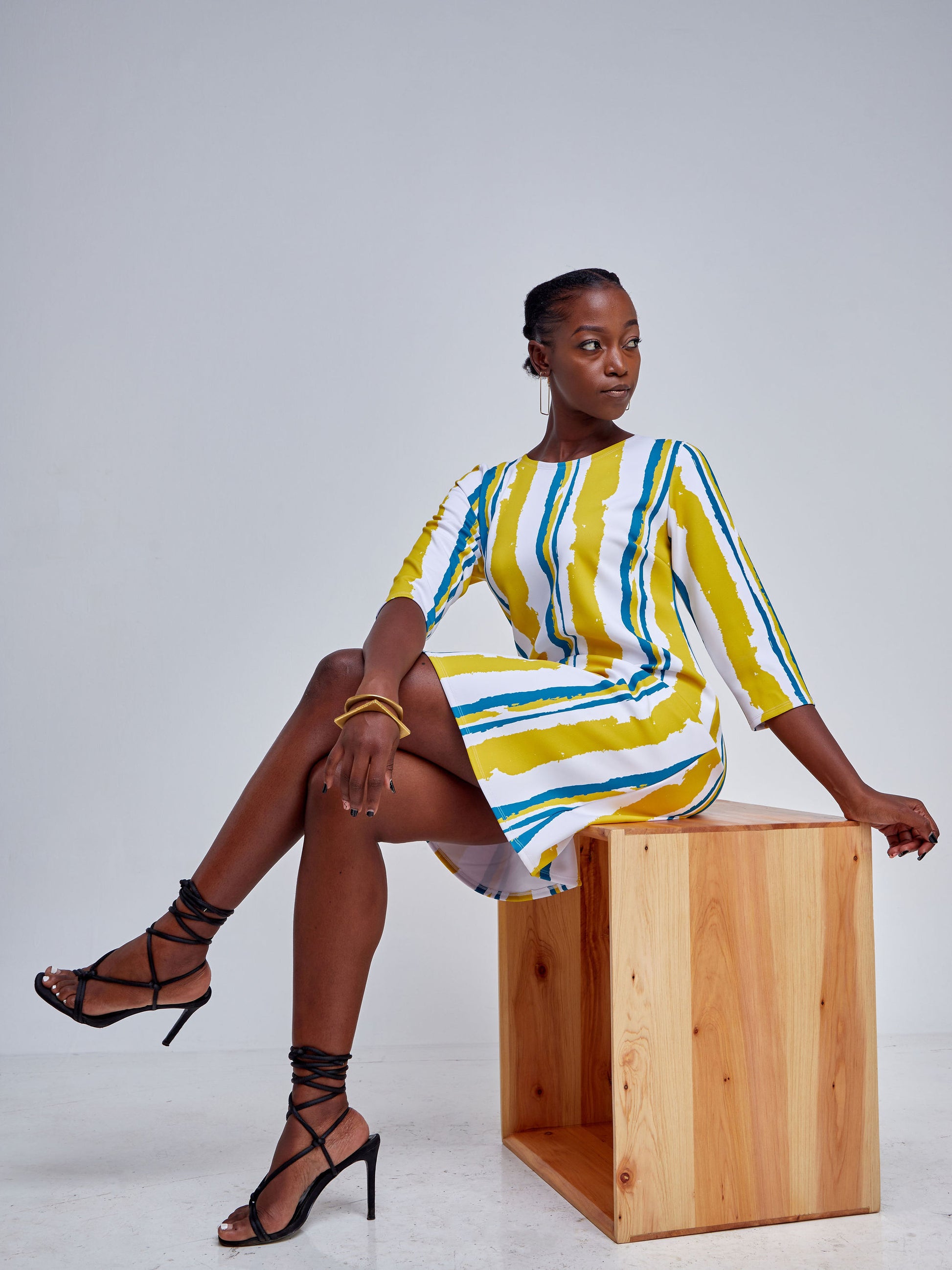 Vivo Tatili 3/4 Sleeve A Line Dress - Dark Teal / Mustrad Abstract Stripes Print
