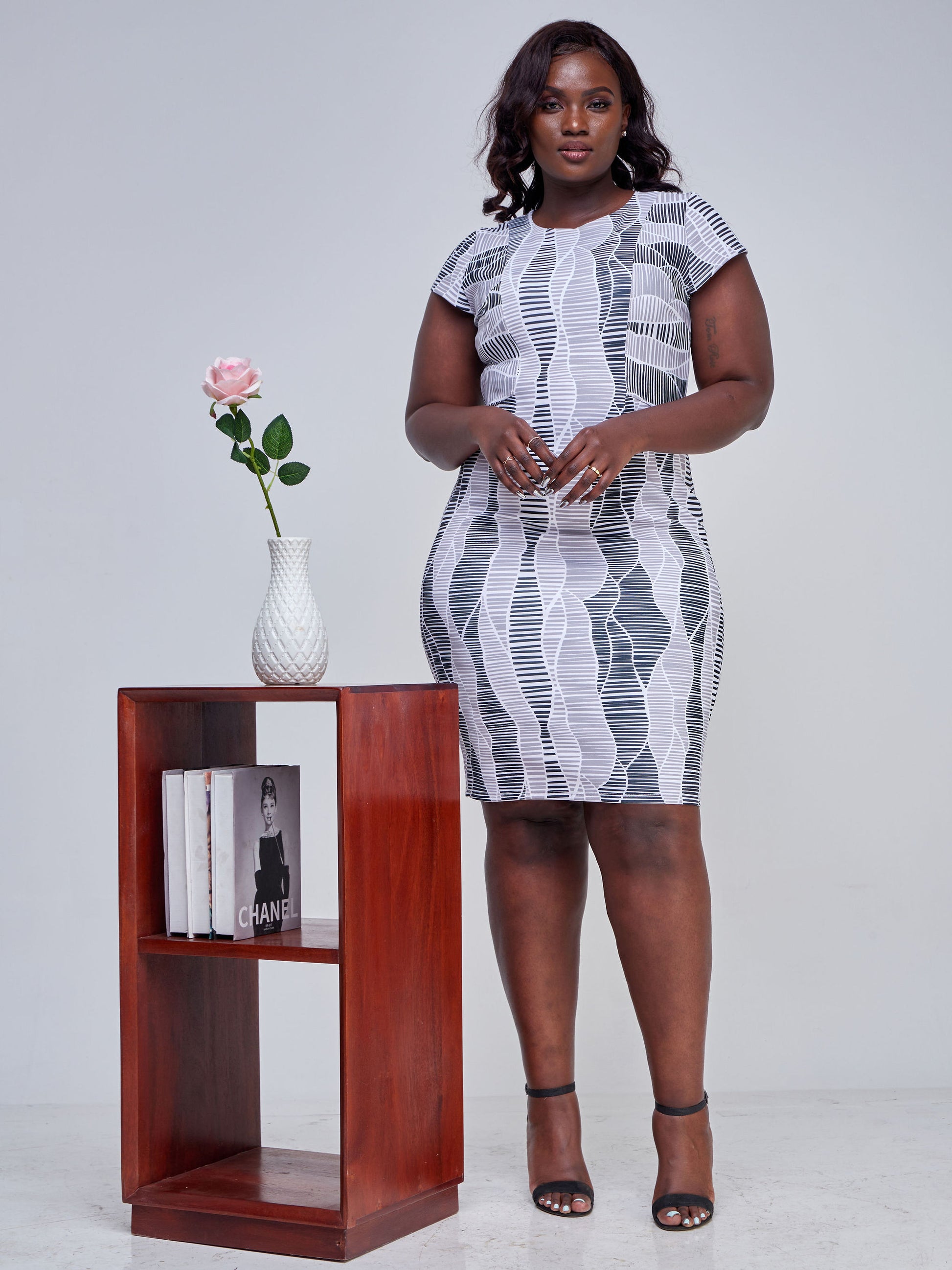 Vivo Tatili Cap Sleeved Panel Sheath Dress - Black / Grey Stripes Print