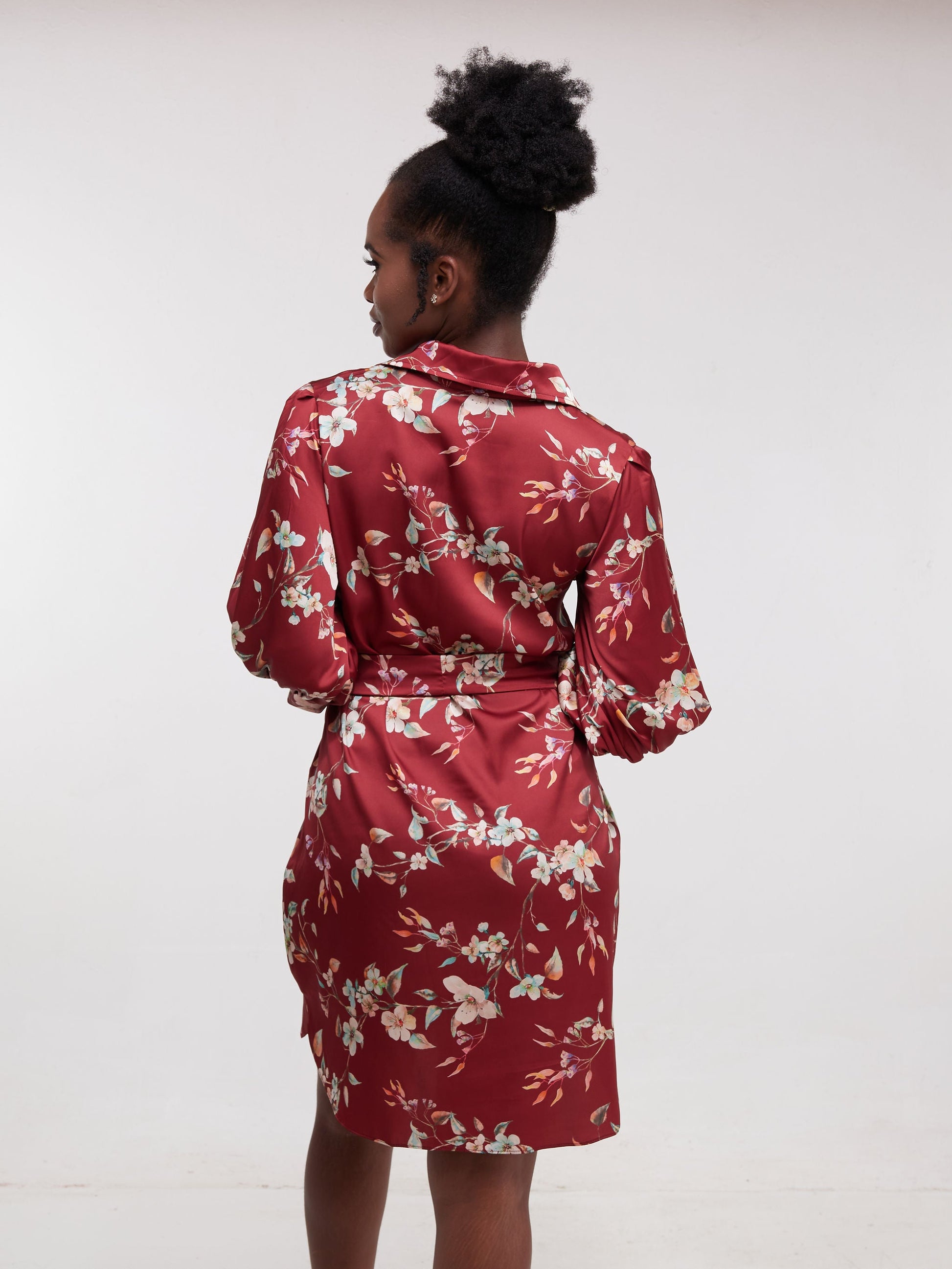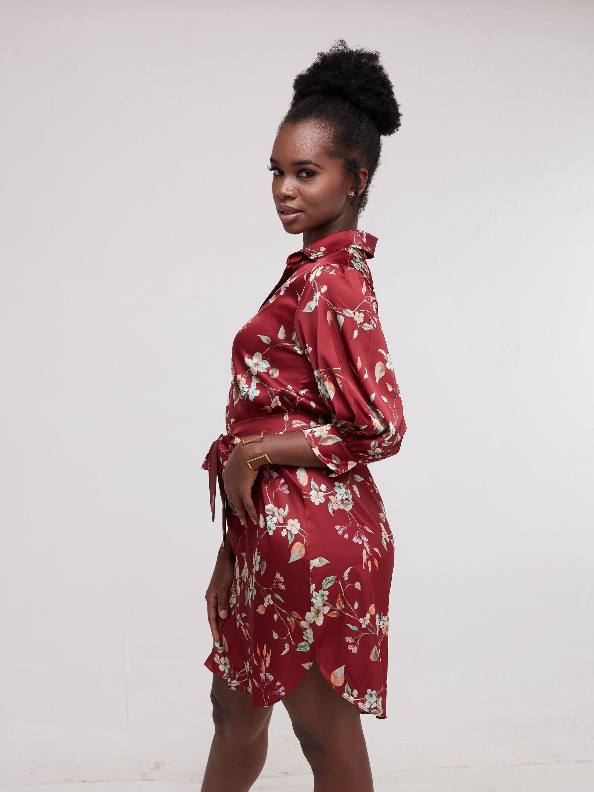 Vivo Thando 3/4 Bishop Sleeve Shirt Dress - Maroon Floral Print