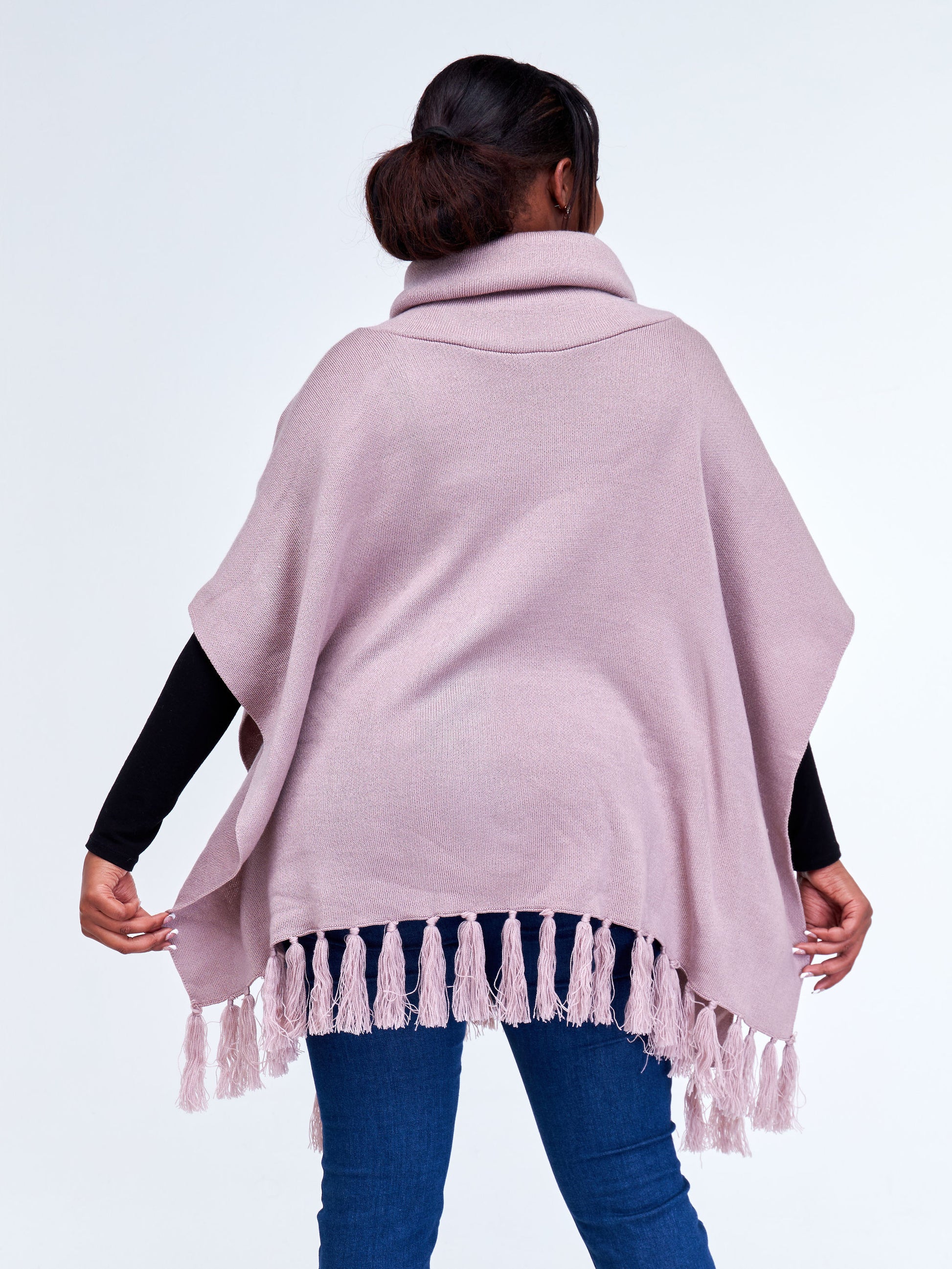 Vivo Turtleneck Knit Fringe Poncho - Light Taupe