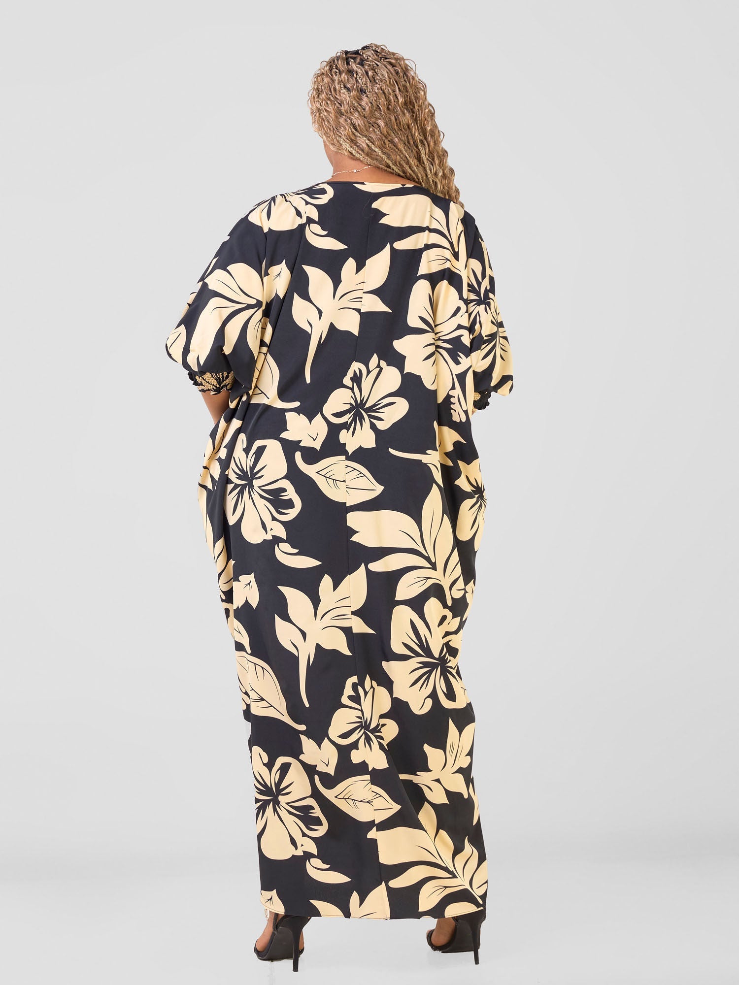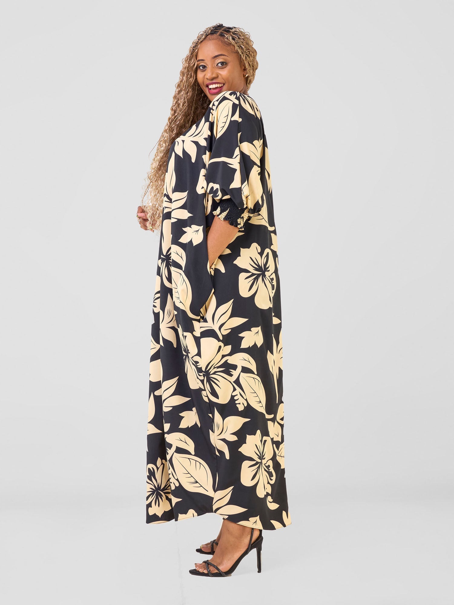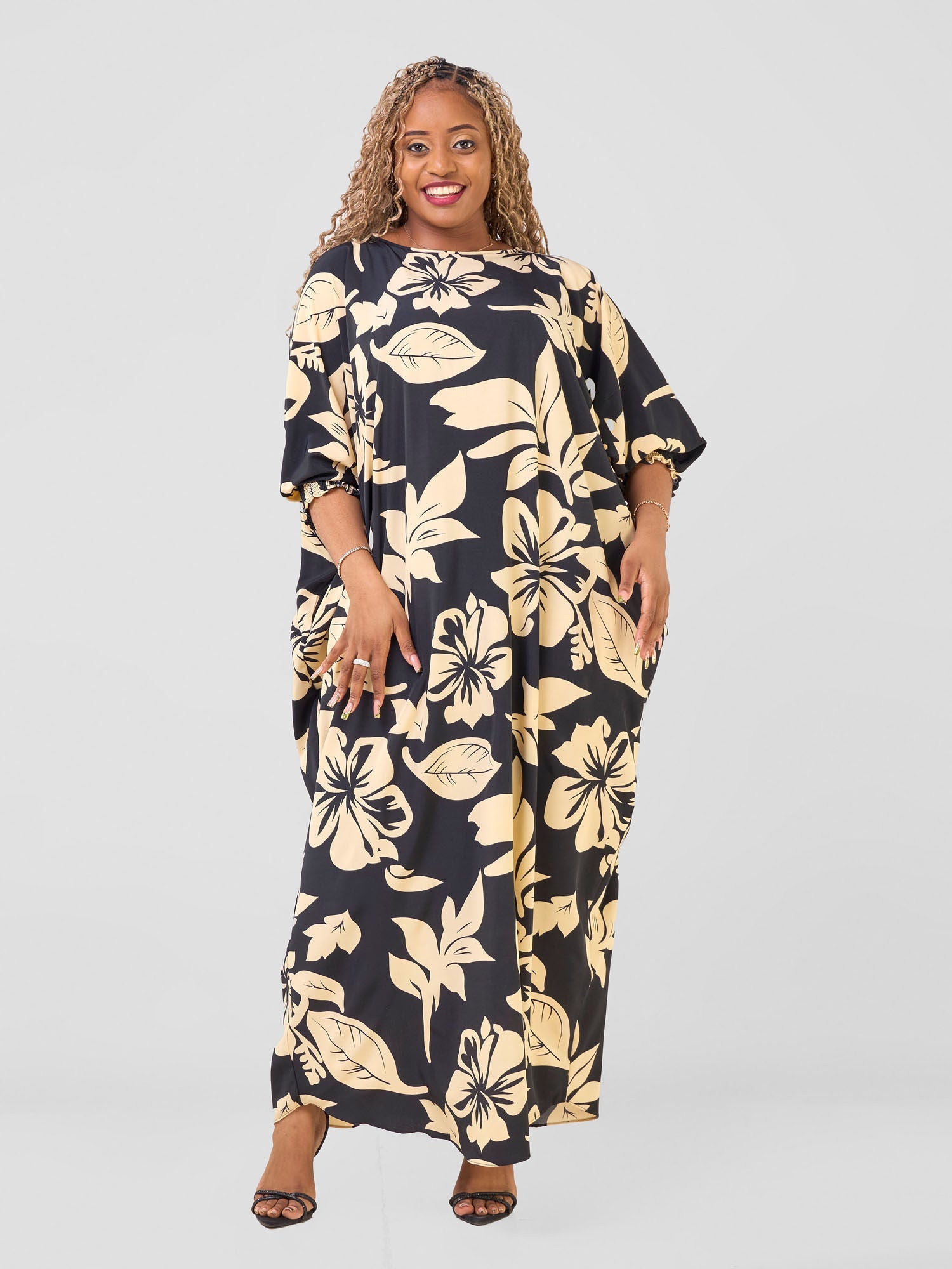 Vivo Wastani Boat Neck Shirred Sleeve Kaftan - Beige / Black Fila Print