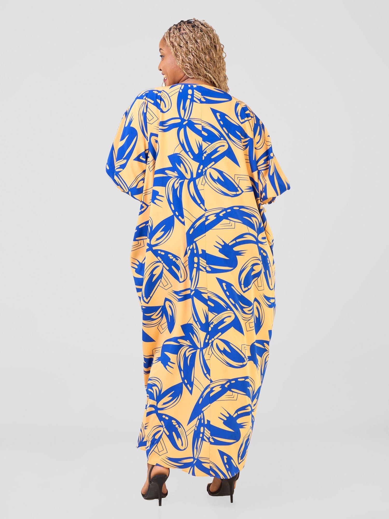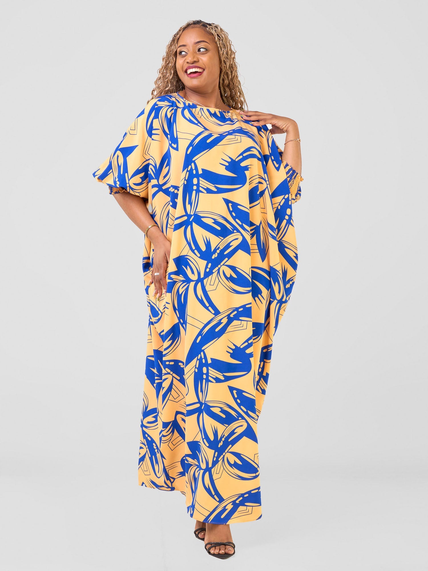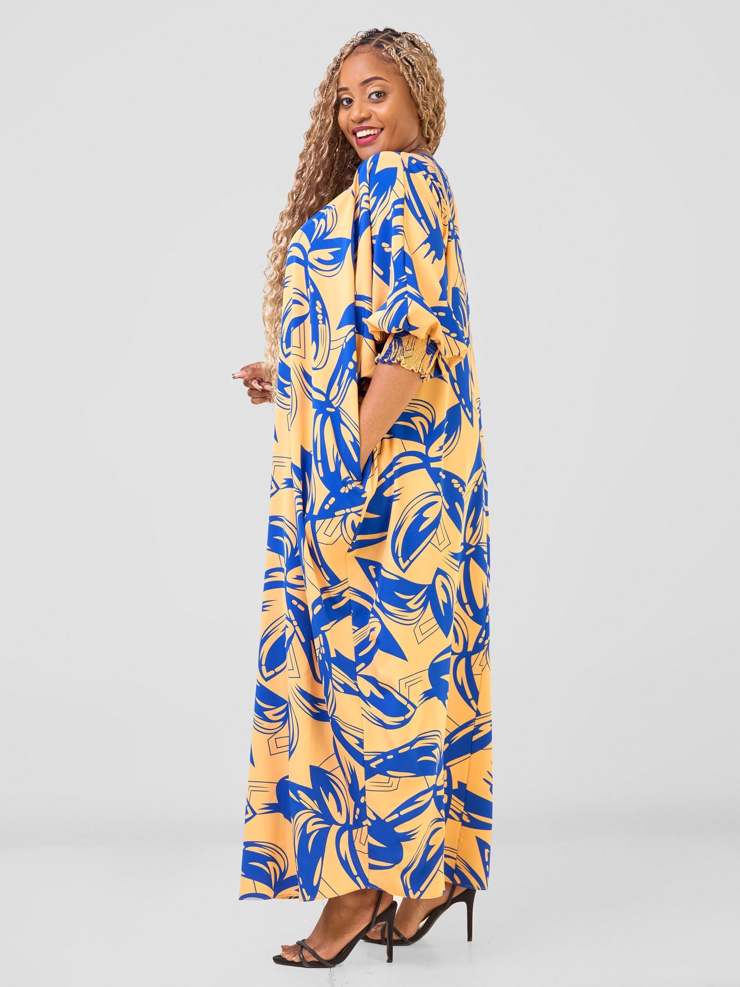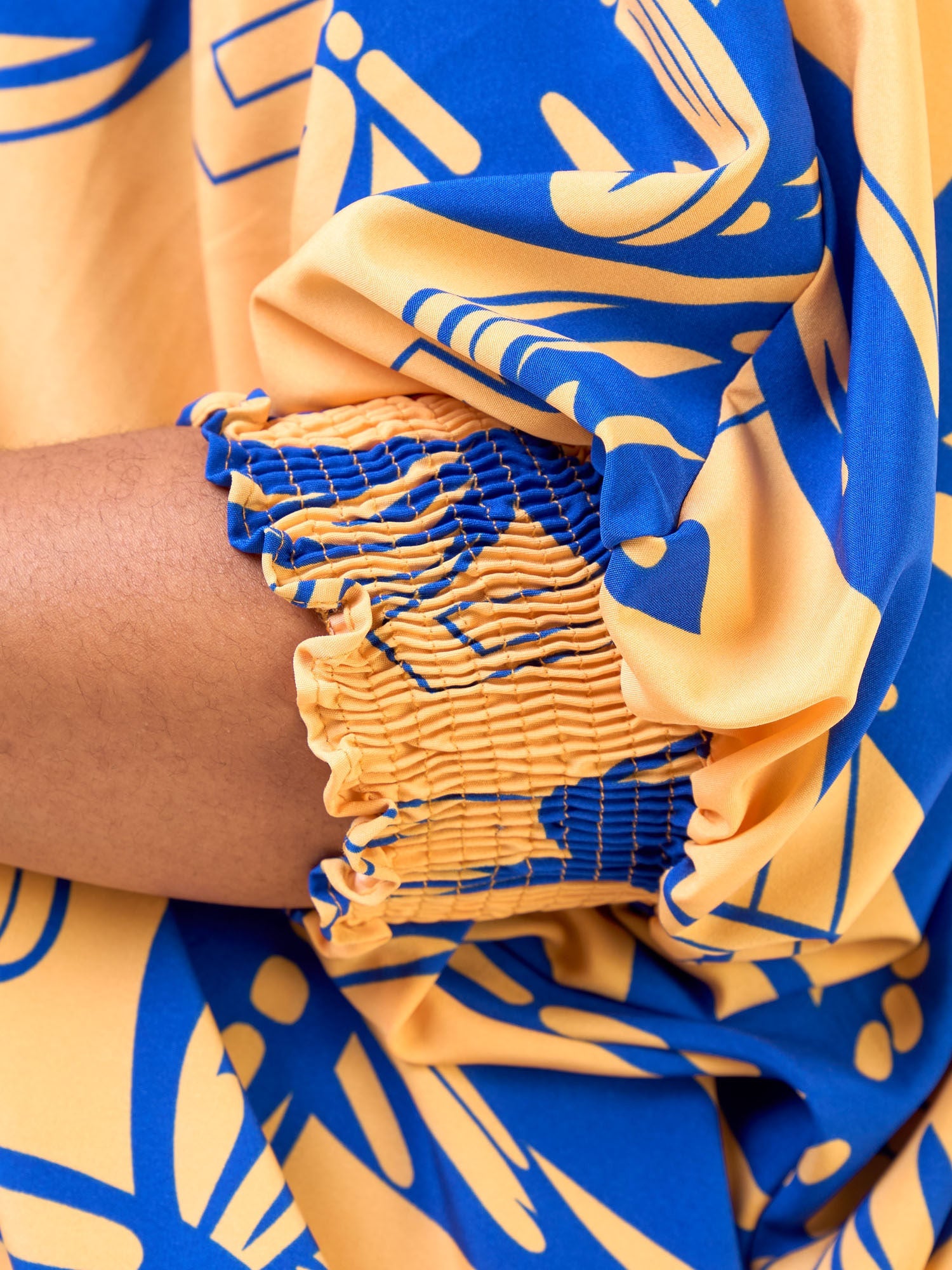 Vivo Wastani Boat Neck Shirred Sleeve Kaftan - Mustard / Blue Abstract Print