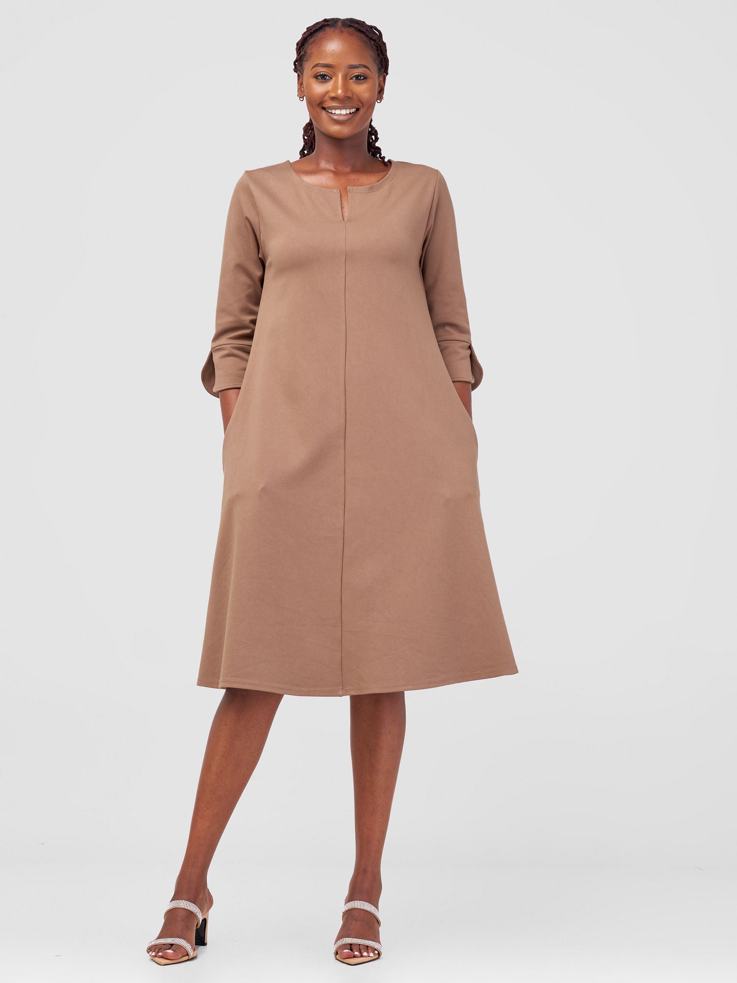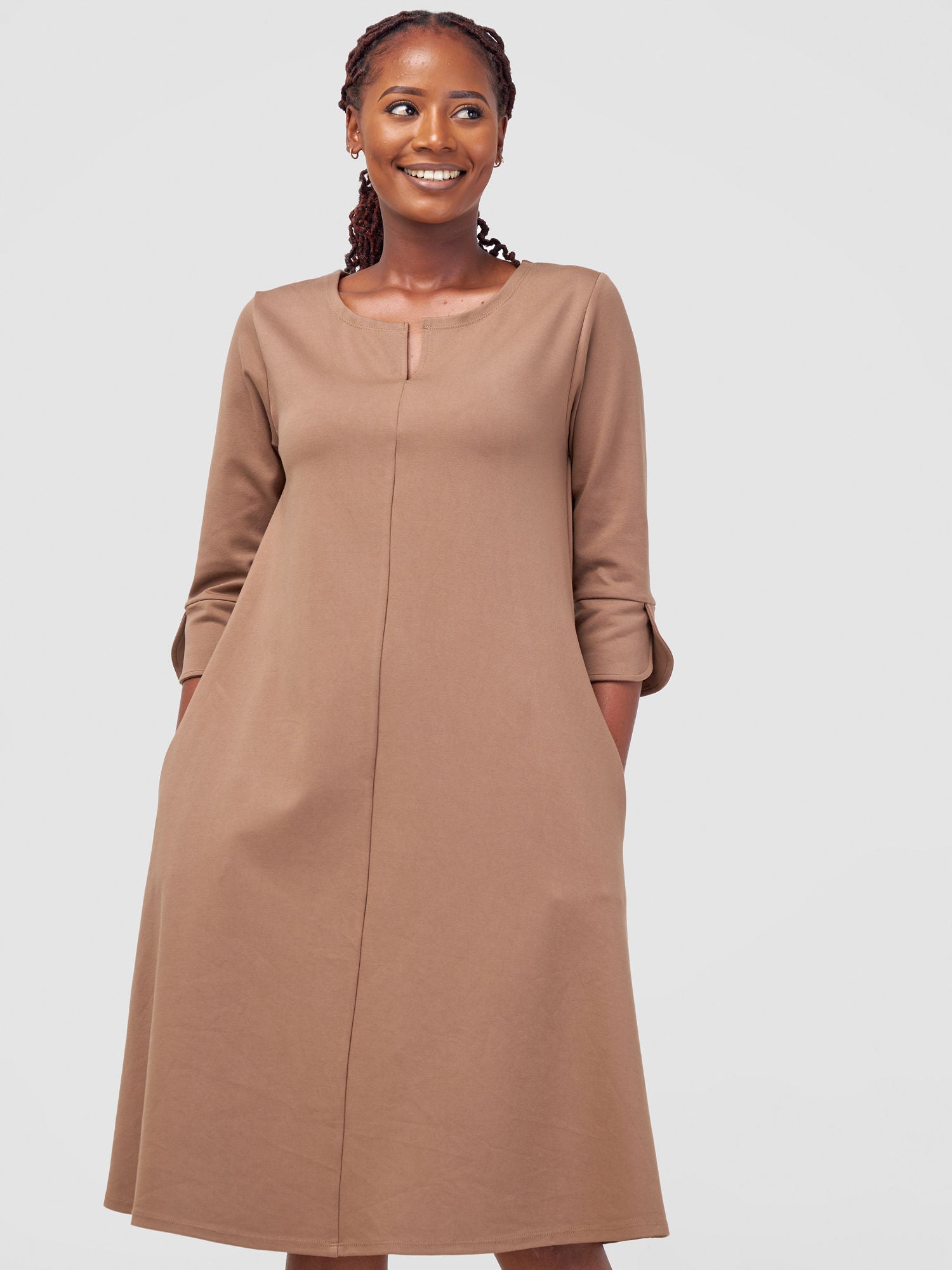 - Features: Tent knee-length dress with Keyhole neckline detail at the front and 3/4 sleeves, has pockets